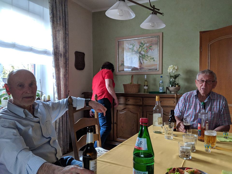 Gegen Abend wurde im kleinen Kreis der Geburtstag von Gisela gefeiert. Es waren nur Ellchen, Teddy, Anita, Fritz, Daniel,Tobias und wir zu Besuch. Es war wie immer mt den Warberanern ein gemütlicher Abend in angenehmer Atmosphäre. Es gab eine Pizza, die wir so noch nicht kannten. Der Boden war Hackfleisch und das war belegt mit Mais, Paprika und Pilzen. Ausgesprochen lecker. Das kann Susanne auch mal machen.20.04.2018: Wir feierten Giselas 70. Geburtstag wieder in der selben Location wie ihre goldene Hochzeit, in der Gaststätte Dörmann in Gorspen-Vahlsen. Eine sehr gepflegte Gaststätte mit einer hervorragenden Küche. Es war eine sehr gemütliche und harmonische Feier. Die meisten waren gut alkoholisiert. Auch Jochen war gut drauf und ist dann auch leider am Ende der Feier hingefallen und hat sich ziemlich den Kopf gestoßen. Gut, dass die beiden so tollen Söhne haben. Tobias und Daniel haben sich tapfer gehalten und sich rührend um ihre Eltern gekümmert.21.04.2018: Wir haben heute Giselas 70. Geburtstag zum dritten mal gefeiert. Heute war Resteessen angesagt. Renate und Klaus waren auch da und der Rest der Warberaner Familie, außer Renate und Reinhard. Das war nochmals ein sehr schönes Zusammensein. Wir sind gegen 14:00 Uhr abgefahren.