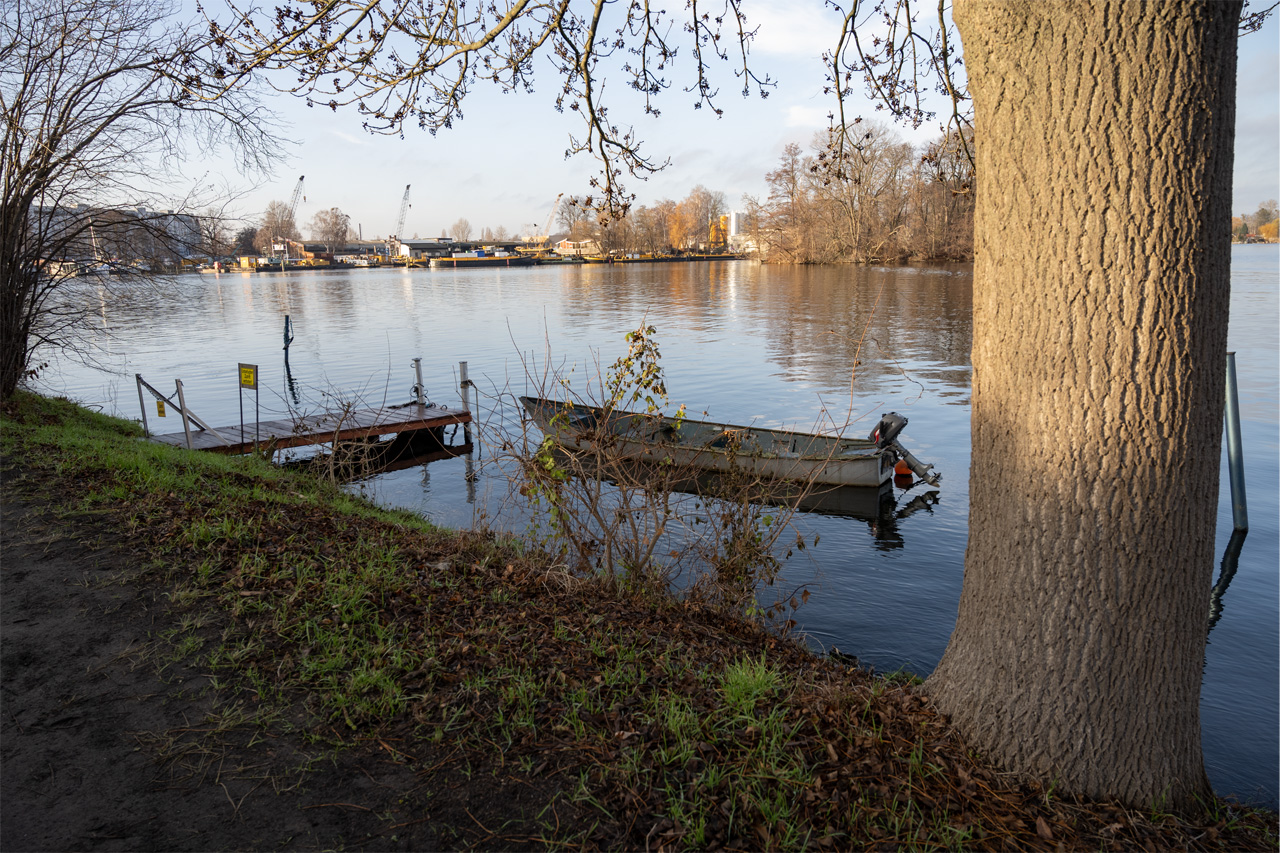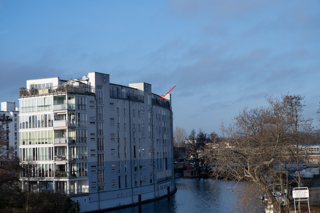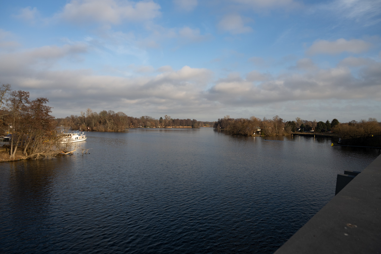 Am Havelufer sind wir vorbei an dem verwaisten Hafen zum Berlin-Spandauer-Schifffahrtskanal gelaufen. Hier gibt es dauerhaft bewohnte Lauben, wobei der Begriff Laube hier sicher nicht zutreffend ist. Einige sind liebevoll mit Lichterketten geschmückt, was wir abends gerne von unserer hinteren Terrasse aus sehen. An der Stelle machn wir es mal umgekehrt und schauen von hier zu unserer Terrasse. Da wird uns mal wieder bewusst, wie schön wir doch wohnen.