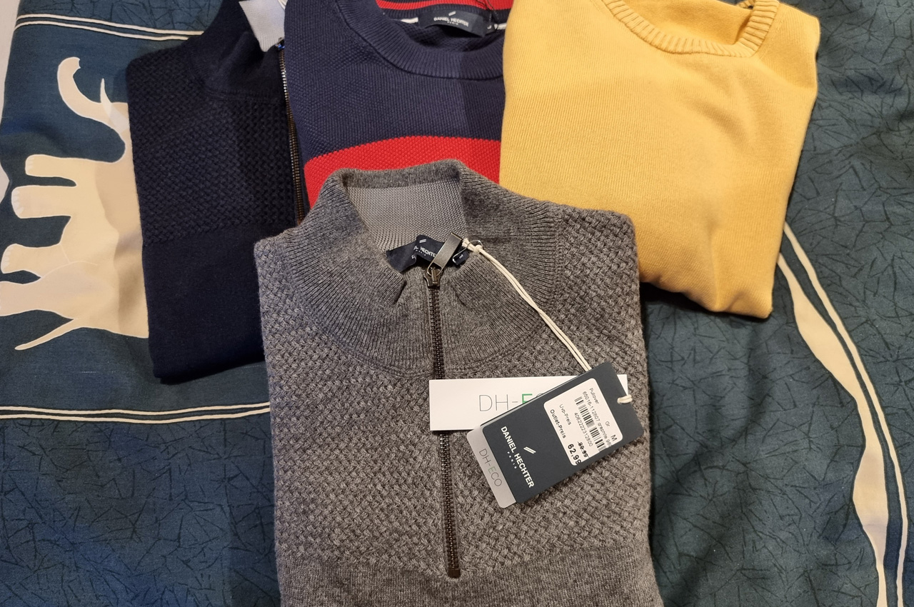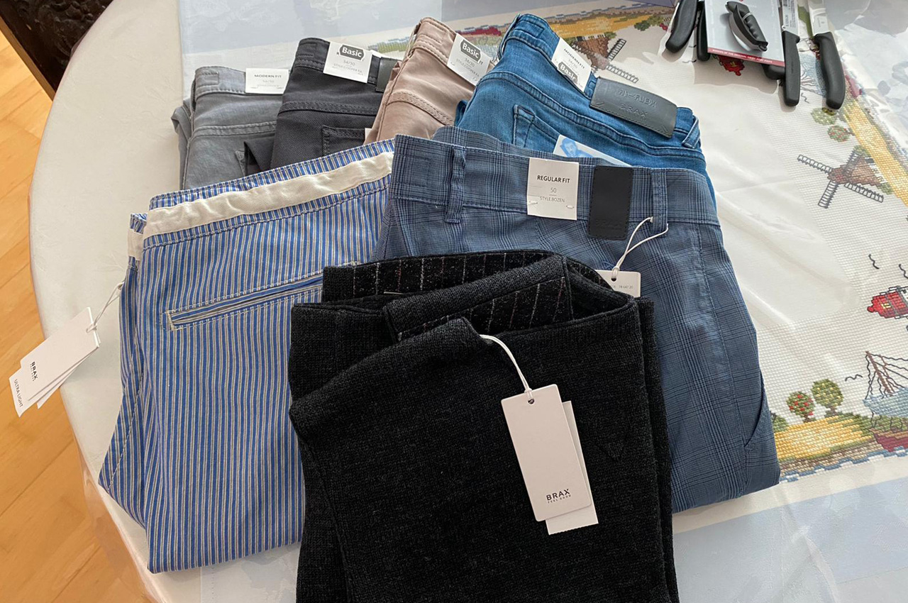 - 16.03.2022: Ich wollte bevor der Winter ganz vorbei ist noch einige langärmelige Pullover haben und meinen Hosenvorrat wollte ich auch erweitern. Also, sind wir zum B5-Center gefahren. Bei Brax gab es gerade eine Sonderaktion mit 50% Rabatt auf die meisten Artikelffensichtlich im Kaufrausch. Es wurden 4 Pullover, drei Hosen und zwei Hosengürtel.