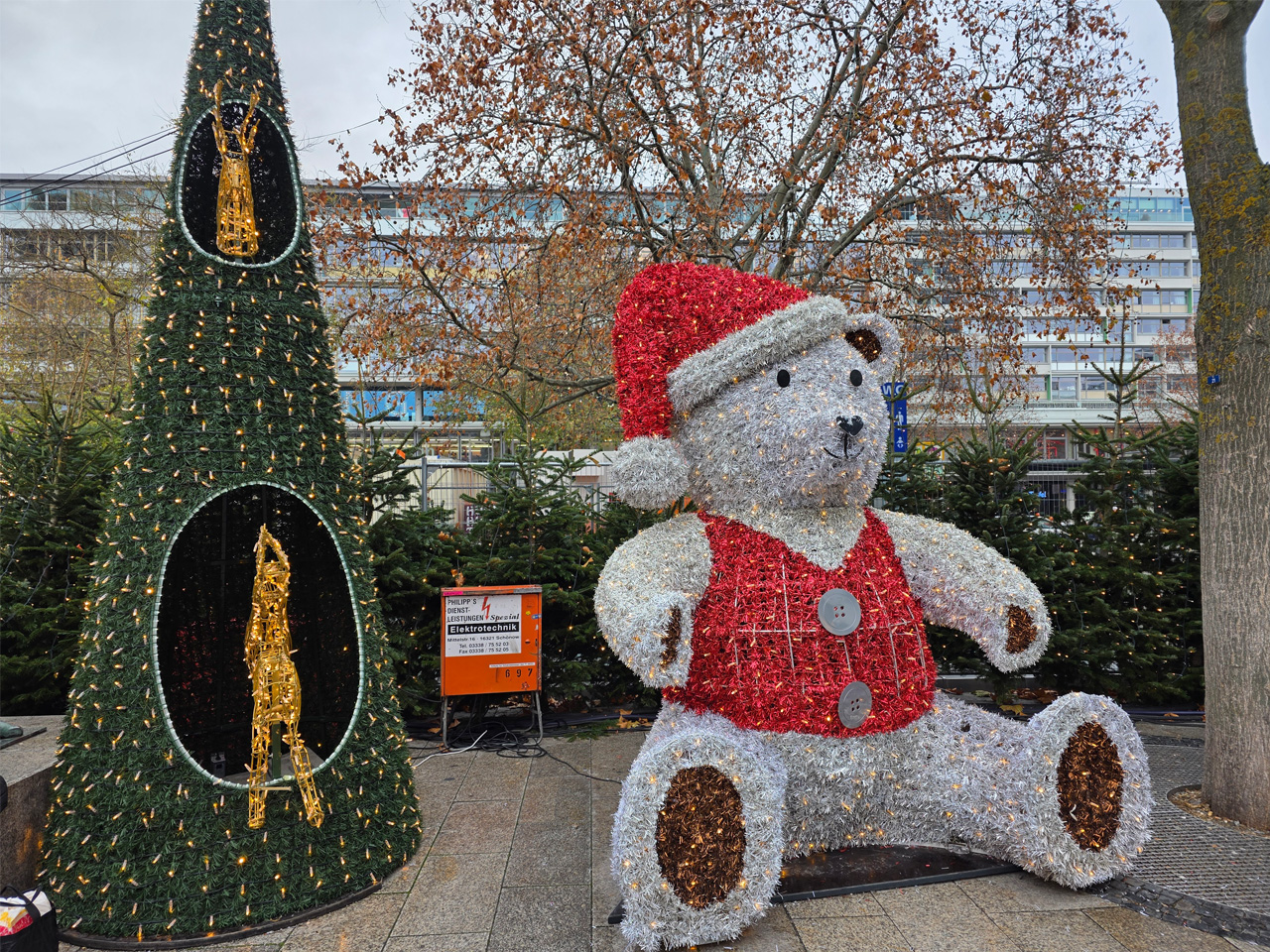 - 03.12.25: Wir hatten in der Gegend etwas zu erledigen und gelangten dadurch mehr zufällig auf diesen Weihnachtsmarkt. Da wir aber nun schon Mal da waren, wäre es ungeschickt gewesen, ihn nicht zu besuchen. Susanne war auf der Suche nach den kleinen Weihnachtsbäumen, von denen sie sich einen in Hannover auf dem Weihnachtsmarkt gekauft hatte, aber eben nur einen. Sie wollte noch einige mehr davon haben. Tatsächlich wurden wir an einem Stand fündig. Es waren original die gleichen. Jetzt war mein Sonnenschein richtig glücklich. An einem Futterstand habe ich mir eine Portion Kassler auf Grünkohl gegönnt und Susanne eine Grillwurst im Brötchen. Wir fanden den Weihnachtsmarkt sehr schön, nur leider war es noch taghell und das sogar mit etwas Sonnenschein.