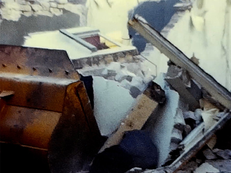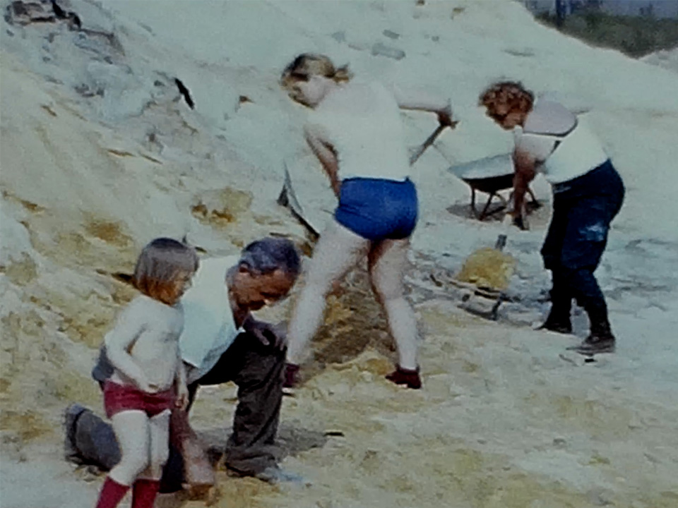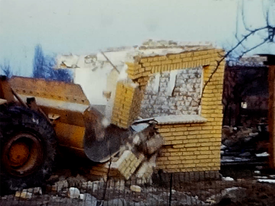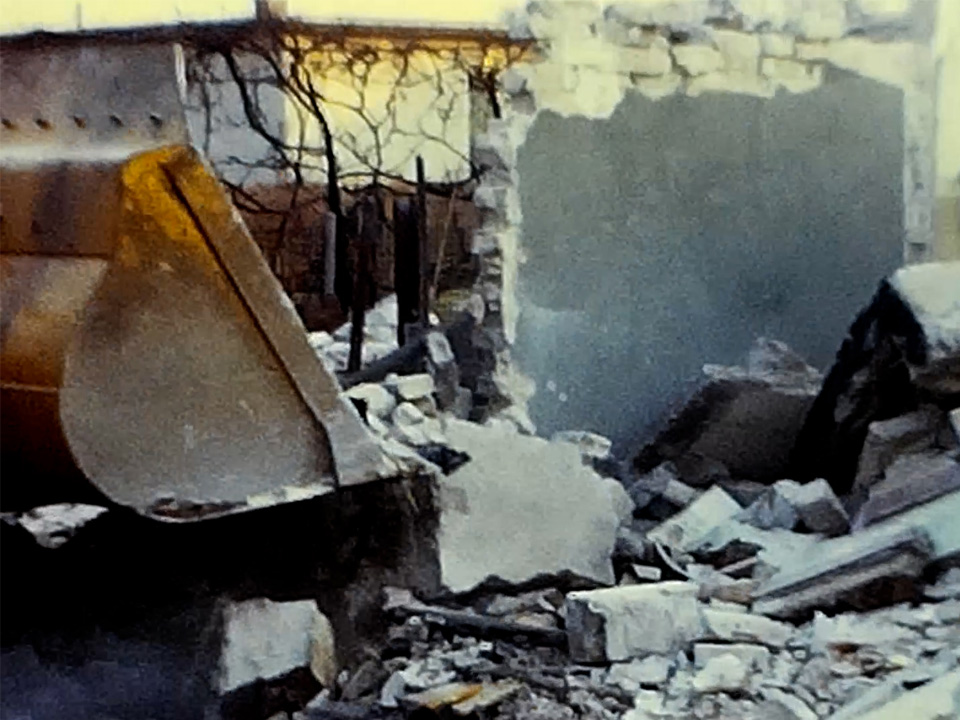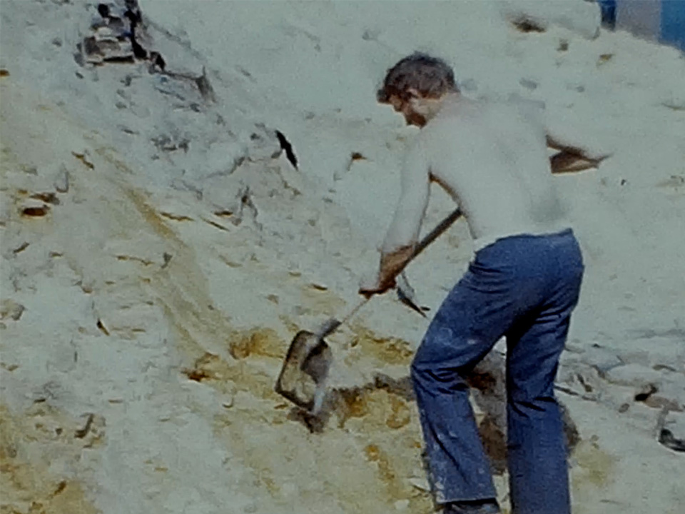 - Anfang April 1973: Wir beginnen mit dem Abriss des alten Steinhauses. In unserer Kostenplanung war der Abriss in Eigenleistung geplant. Ich habe alles was aus Holz war abgetragen, dazu gehörte Dach und die Decken sowie Fenster und Türen. Von einer Baustelle der Gropiusstadt habe ich einen Arbeiter mit Radlader angeheuert. Für 350,-DM hat er das Gebäude abgebrochen und den Bauschutt auf das angrenzende Pachtgelände geschoben. Danach hat er die Baugrube ausgehoben und den Aushub auch auf das Gelände geschoben. Dabei hat er den tieferen Aushub, in unserer Gegend besteht der Boden aus bestem Baukies, separat gelagert. Den Kies werden wir gleich wieder für Beton und Mörtel verwenden.
