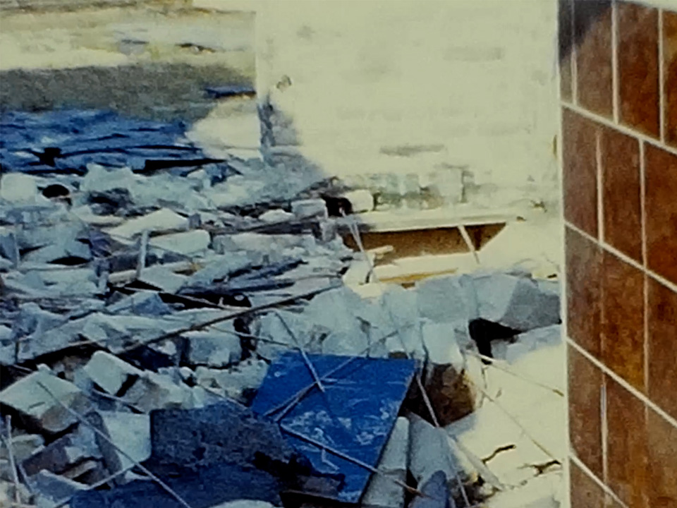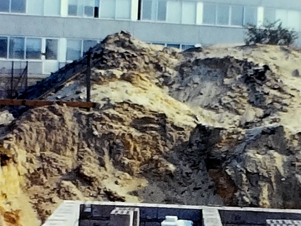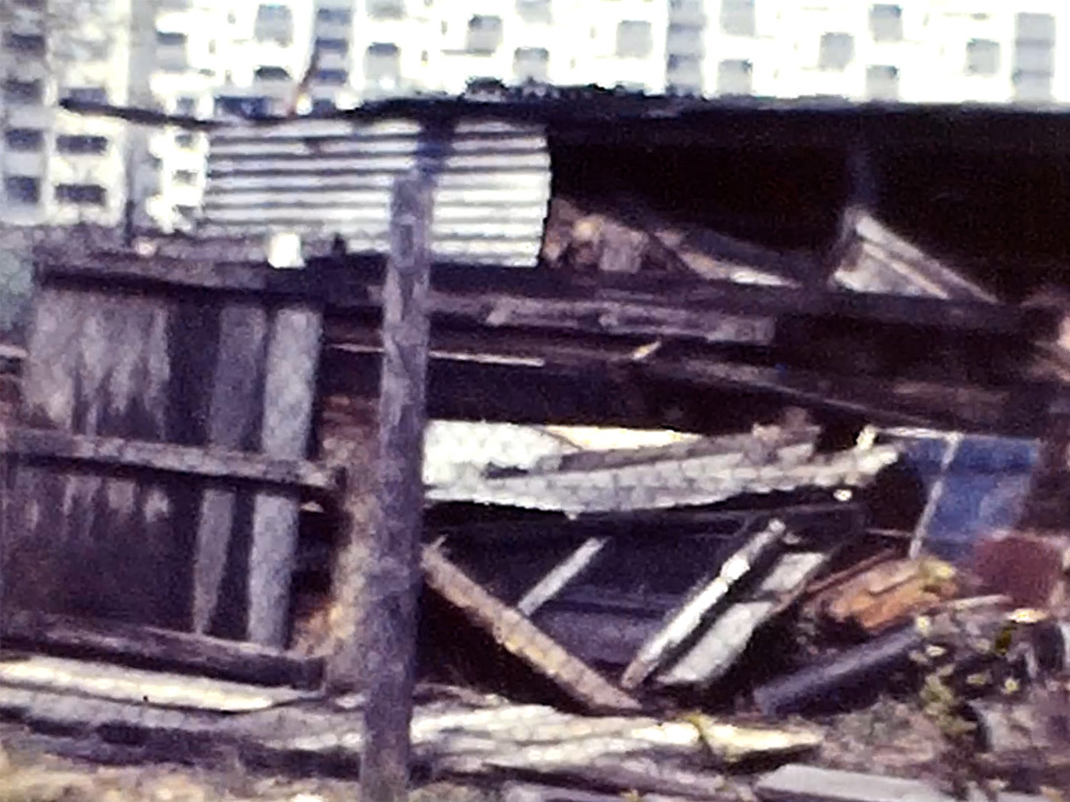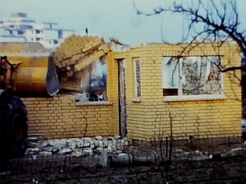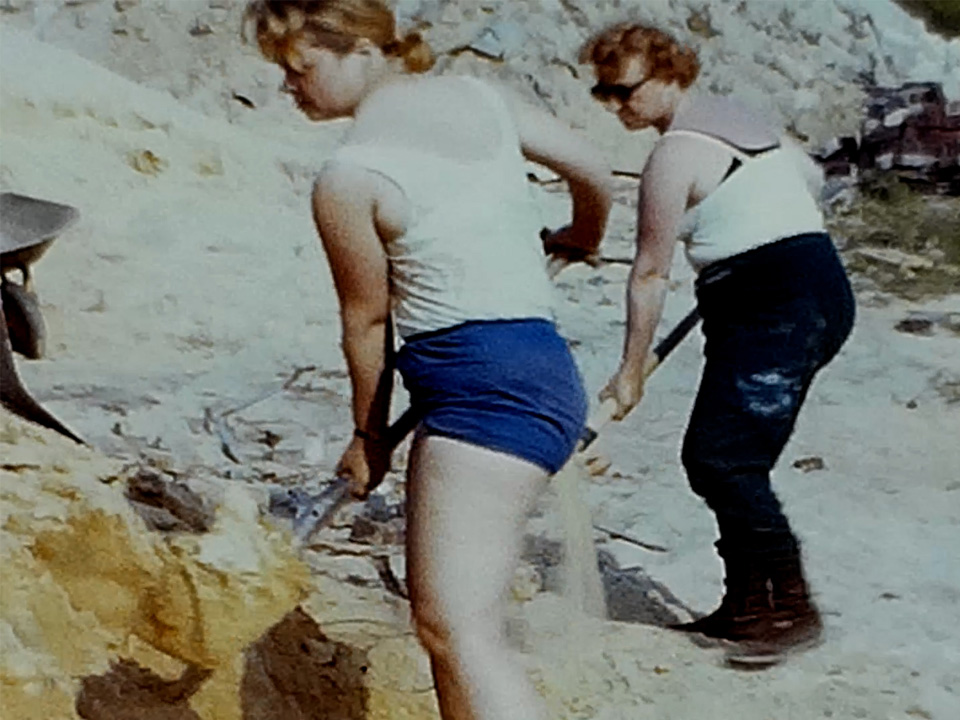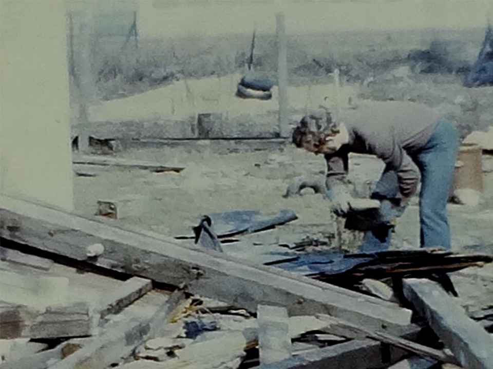 - Anfang April 1973: Wir beginnen mit dem Abriss des alten Steinhauses. In unserer Kostenplanung war der Abriss in Eigenleistung geplant. Ich habe alles was aus Holz war abgetragen, dazu gehörte Dach und die Decken sowie Fenster und Türen. Von einer Baustelle der Gropiusstadt habe ich einen Arbeiter mit Radlader angeheuert. Für 350,-DM hat er das Gebäude abgebrochen und den Bauschutt auf das angrenzende Pachtgelände geschoben. Danach hat er die Baugrube ausgehoben und den Aushub auch auf das Gelände geschoben. Dabei hat er den tieferen Aushub, in unserer Gegend besteht der Boden aus bestem Baukies, separat gelagert. Den Kies werden wir gleich wieder für Beton und Mörtel verwenden.