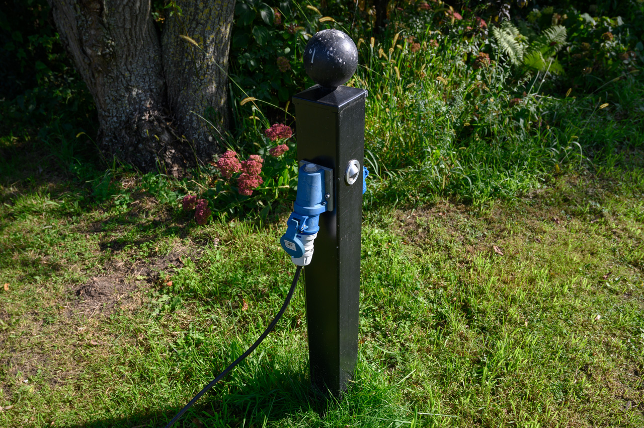 - Die Stromanschlüsse befinden sich an Säulen, sind in CEE-Ausführung und mit 16A abgesichert.