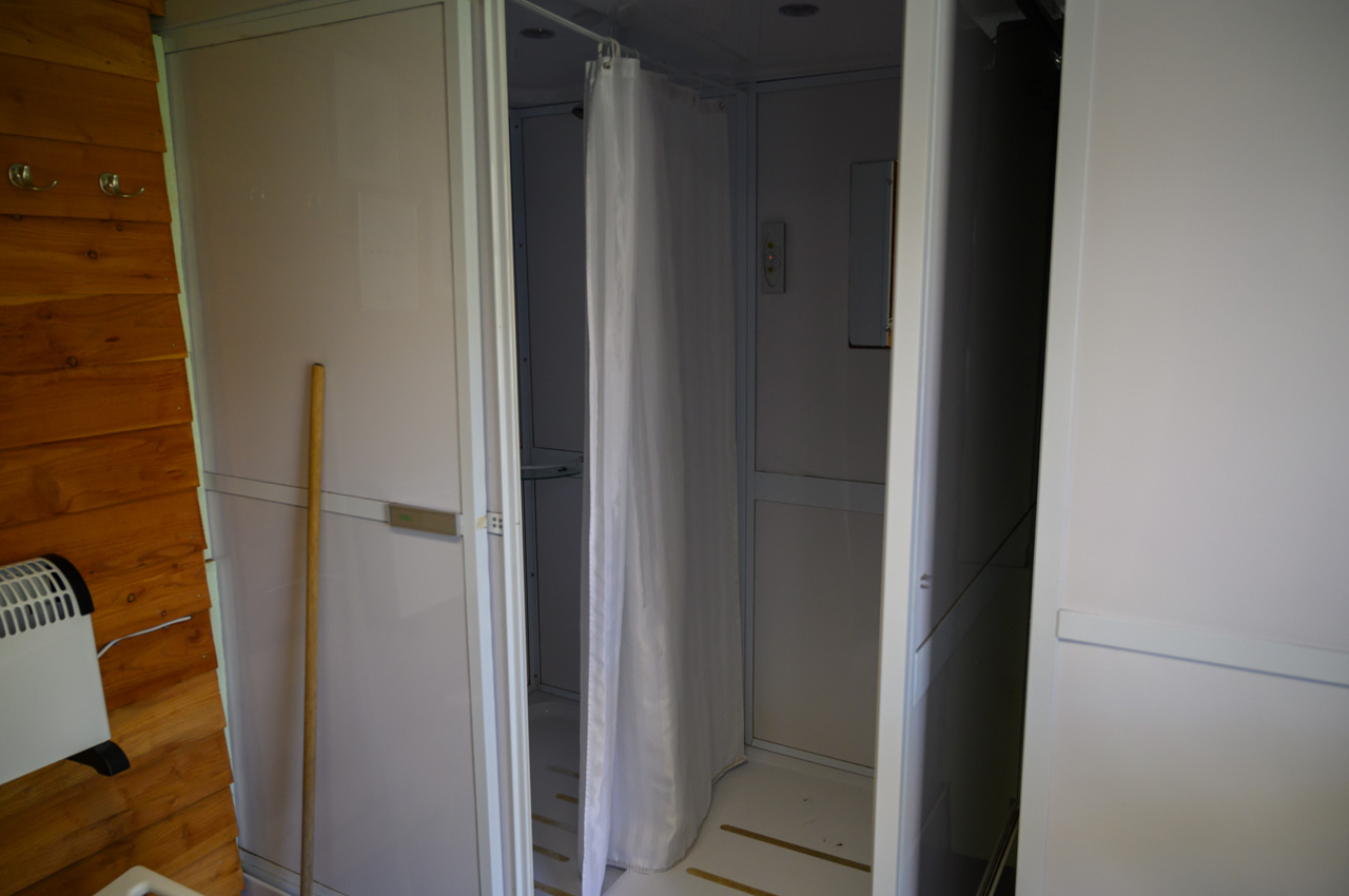 - Die Duschen sind geräumig in mobilen Kabinen mit Abgrenzung der Dusche zum Umkleidebereich durch einen Vorhang.