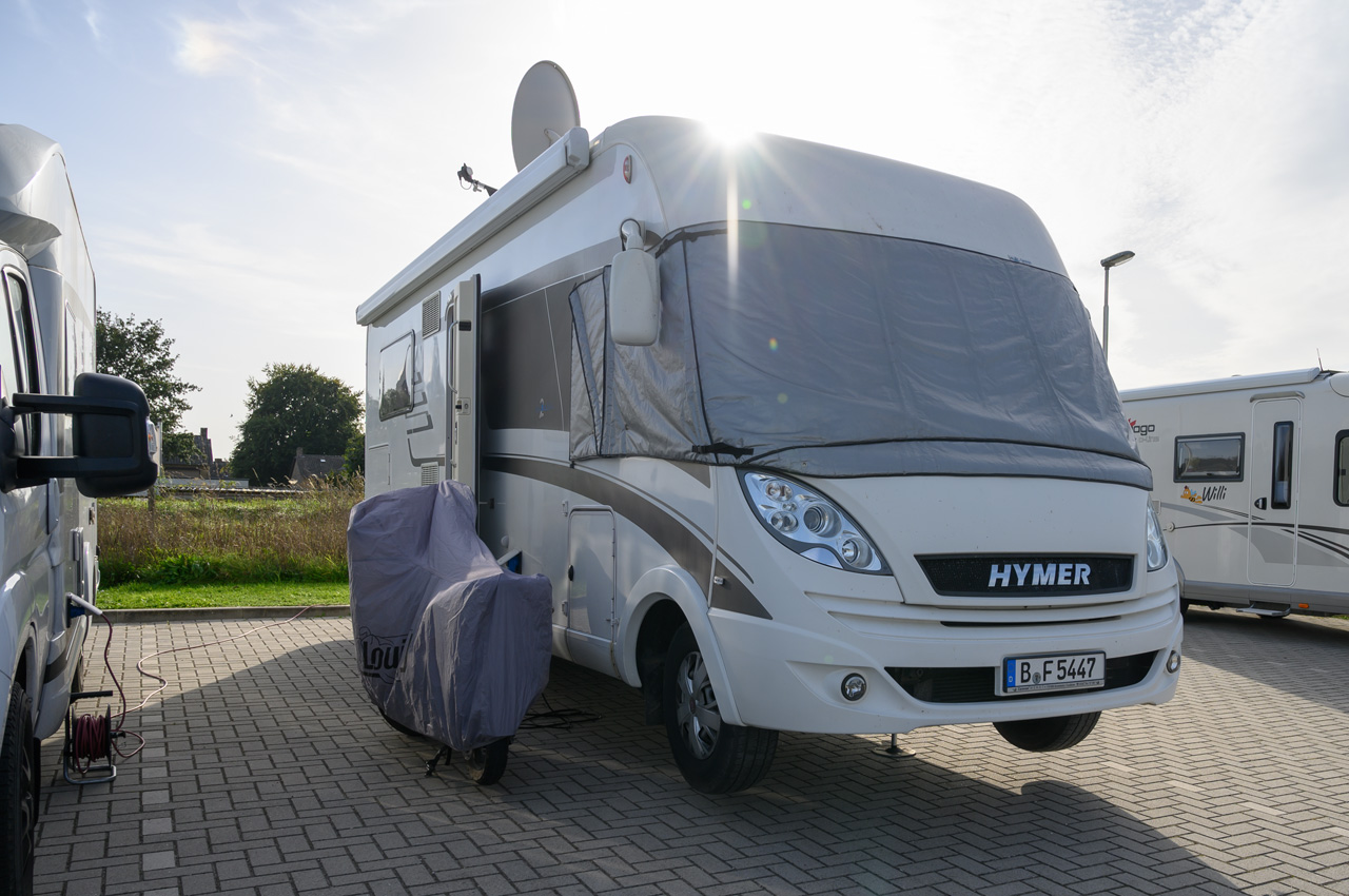 Der Stellplatz ist von der Preisgestaltung ziemlich weit oben, aber er bietet auch einiges. Es ist alles sehr sauber, gepflegt und professionell gestaltet. Die Stellflächen sind normal bemessen und das Pflaster bietet einen sauberen Zugang zum Womo. Leider gibt es keinen Einlass für Grauwasser. Für den Weg ins Zentrum von Rörmond brauchen wir unseren NIU