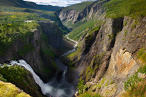 Die Fallhöhe des Wasserfalls Vøringsfossen beträgt 183 m, die größte Freifallstrecke des Wassers 145 m. Der Wasserfall liegt am Westrand der Hardangervidda in Eidfjord unweit des Rv 7, der Oslo mit Bergen verbindet. Die Wassermenge kann zur Schneeschmelze im Frühjahr mehr als 150 Kubikmeter pro Sekunde betragen. Im Jahr 1980 wurde der Fluss für die Stromerzeugung reguliert wodurch erhebliche Wassermengen nicht mehr zu sehen sind. Der kleine Fluss Bjoreio, in dessen Verlauf der Vøringsfossen liegt, wird oberhalb des Wasserfalls im Tal Sysendalen durch den Sysendamm gestaut und für die Stromproduktion verwendet. Die Wassermenge ist daher eingeschränkt, wird allerdings aus touristischen Gründen im Sommer vom 1. Juni bis 15. September auf zirka 12 m³ Wasser pro Sekunde erhöht, was etwa der natürlichen Durchflussmenge entspricht. |