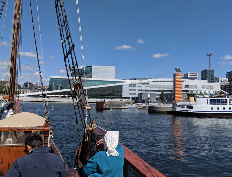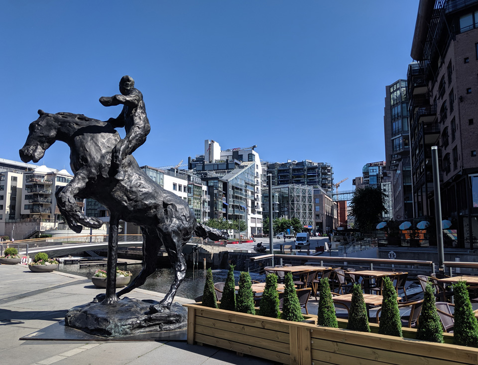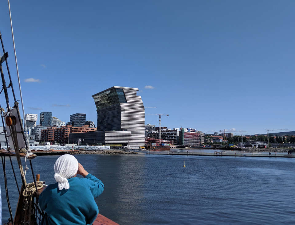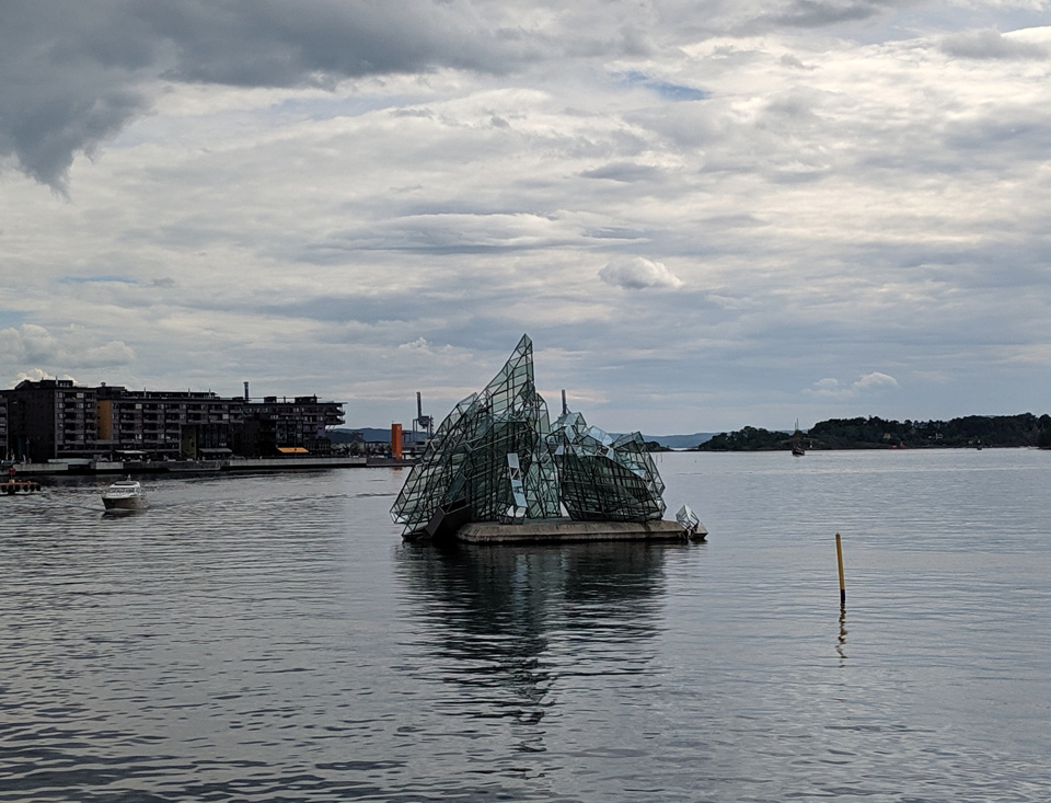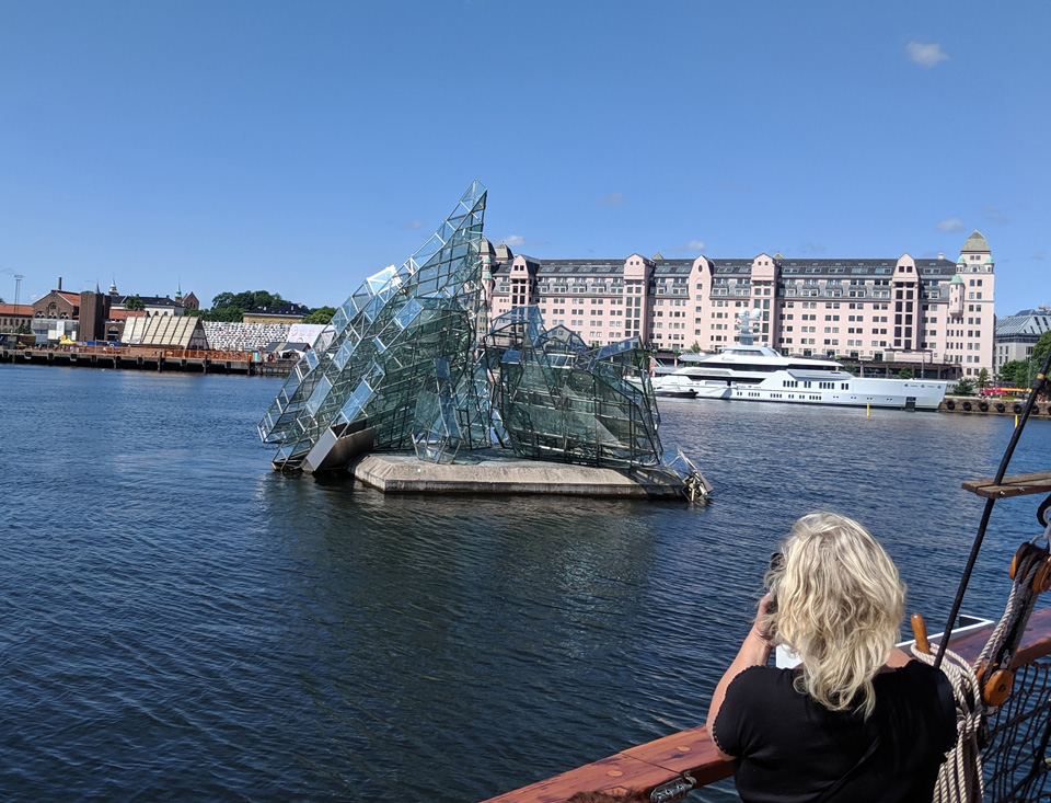 Seit Mai 2010 liegt im Hafenbecken ca. 60 m vor der Oper die weiße Skulptur Hun ligger/She lies. Die Skulptur der in Berlin lebenden italienischen Künstlerin Monica Bonvicini ist den aufgetürmten Eismassen auf dem Gemälde Das Eismeer von Caspar David Friedrich nachempfunden, hat die Maße 17 × 16 × 12 m und wurde aus Stahl und Glas angefertigt.