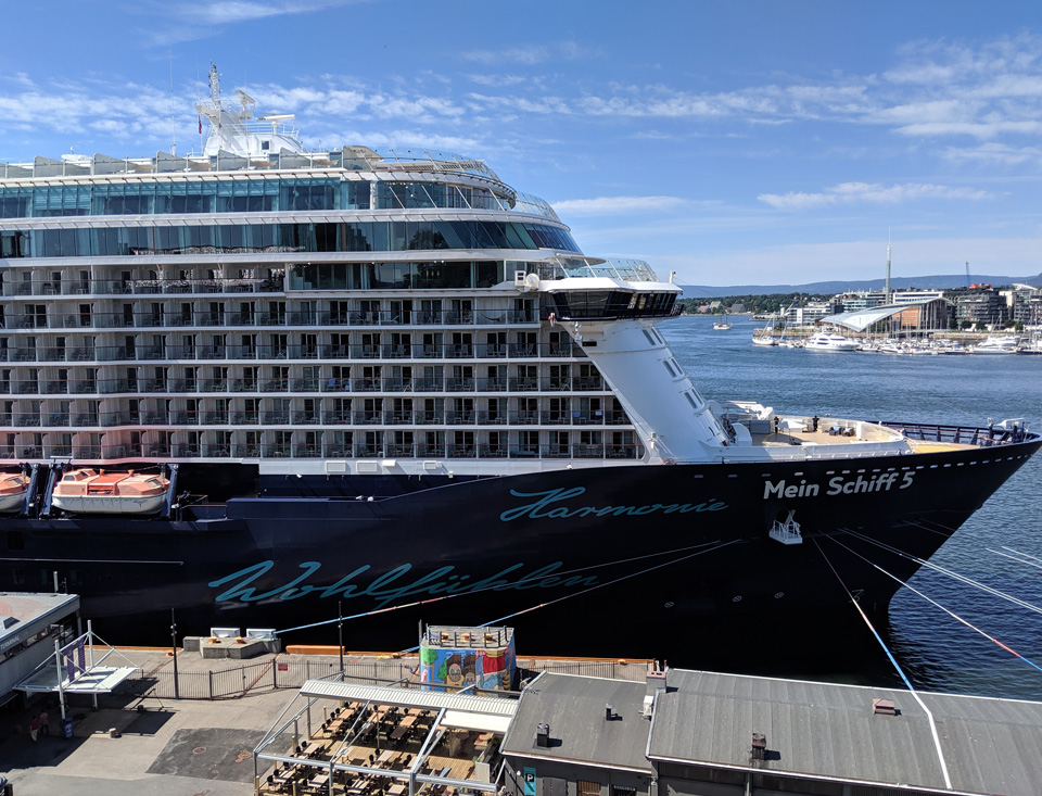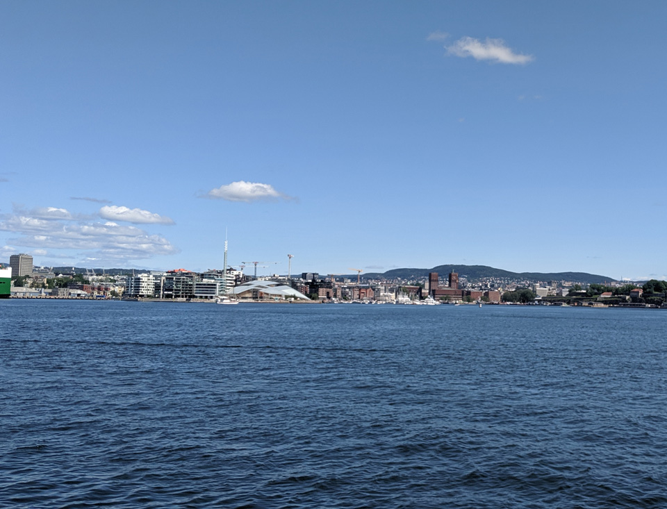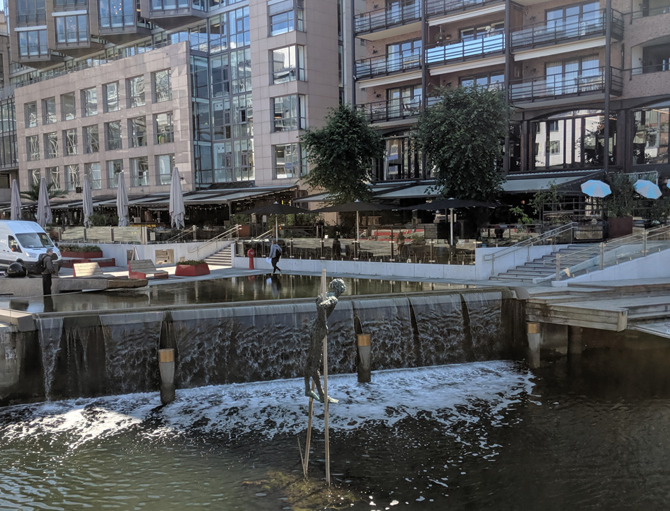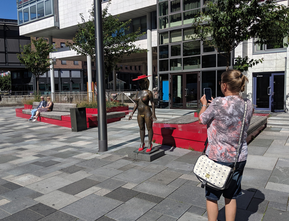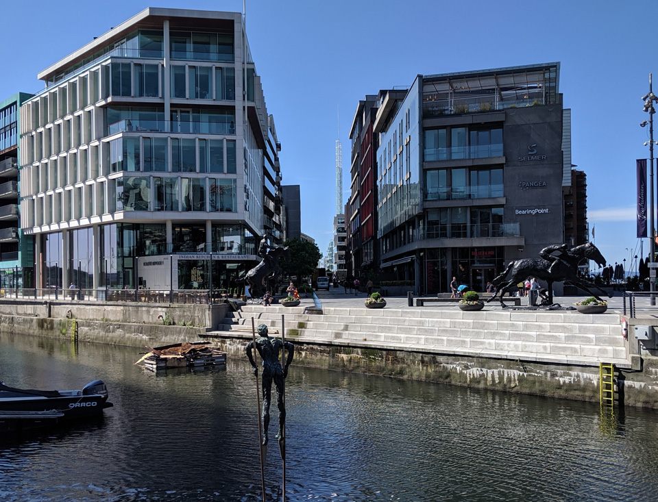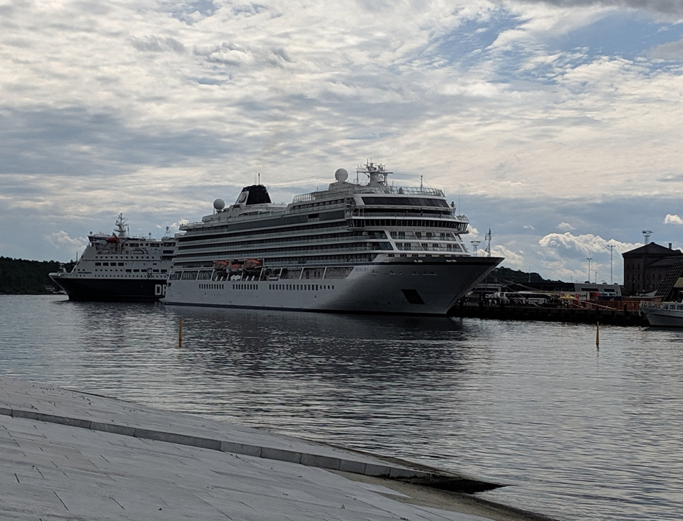 Seit Mai 2010 liegt im Hafenbecken ca. 60 m vor der Oper die weiße Skulptur Hun ligger/She lies. Die Skulptur der in Berlin lebenden italienischen Künstlerin Monica Bonvicini ist den aufgetürmten Eismassen auf dem Gemälde Das Eismeer von Caspar David Friedrich nachempfunden, hat die Maße 17 × 16 × 12 m und wurde aus Stahl und Glas angefertigt.