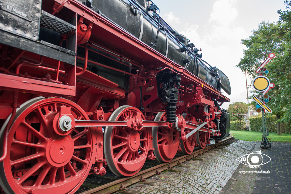 Heute hat es kurz vor dem Aufstehen nochmal kräftig geschüttet. Danach kam dann aber die Sonne heraus. Für unser Frühstück habe ich Brötchen von der Tankstelle geholt. Die haben besser geschmeckt als die in Greetsiel. Nach dem Frühstück sind wir mit den Rädern in die Stadt gefahren. Als erstes waren wir in dem Fahrradladen um die georderte Tasche abzuholen. Das freundliche Angebot die Klickfixaufnahme gleich anzubauen, haben wir gerne in Anspruch genommen. Die wollten noch nicht einmal Geld dafür haben. Ich habe mir gleich noch eine Regenjacke gekauft. Sie soll winddicht, wasserdicht und trotzdem atmungsaktiv sein. Das ganze für 80 €. Na schauen wir mal. Unser nächstes Ziel war die Museumslok am Hauptbahnhof. Es ist eine Lokomotive der Baureihe 043. Schön für mich, da kamen doch viele Jugenderinnerungen hoch.