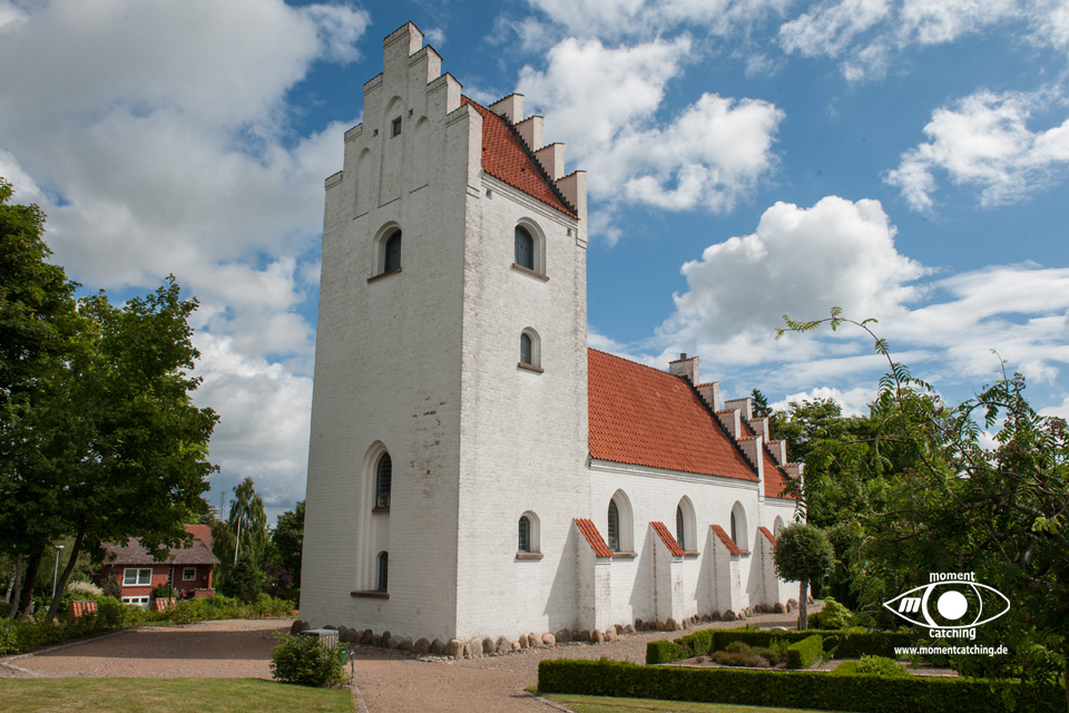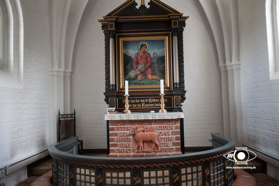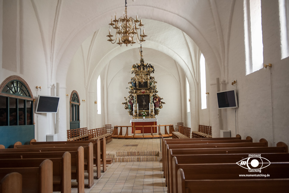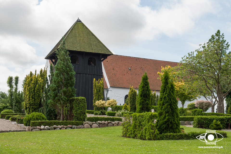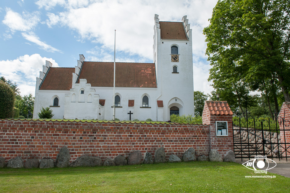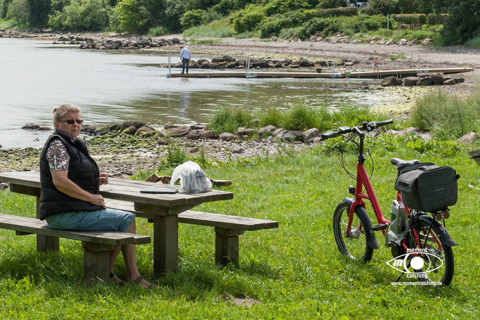 Für heute hatte uns der Wetterbericht nochmals einen schönen Tag versprochen. Danach sah es beim Frühstück allerdings nicht aus. Grauer Himmel und ziemlich stronger Wind. Wir haben uns davon nicht beeindrucken lassen und sind los geradelt. In Varnäs haben wir uns die Kirche angesehen. Da war gerade der Pfarrer bei Vorbereitungen. Er hat Kerzen am Altar aufgestellt. Auch diese kleine Dorfkirche verfügt über einen sehr schönen Altar und einem interessanten Taufbecken mit goldener Abdeckung. Unser Weg ging über Berg und Tal im wahrsten Sinne. Ein Glück, dass wir eBikes haben. Wir landeten nach einem Irrweg dann doch endlich am Strand in Feriekoloni, ein ganz kleiner Ort am kleinen Belt. Hier haben wir unser zweites Frühstück eingenommen auf einer Bank mit Tisch, wie es sie hier in Dänemark an fast jeder Stelle mit guter Aussicht gibt. Die Aussicht war hier aber auch besonders schön. Susanne war auf dem WC was versteckt hinter Bäumen und Büschen war und kam völlig irritiert wieder zurück. Das war die mieseste Toilette die ich je in Dänemark vorgefunden habe. Einfach nur ein Plumpsklo. Aber es war Toilettenpapier vorhanden. Heute konnten wir nach unserer Rückkehr am Womo noch draußen sitzen. Es hat heute auch mit dem Grillen gut geklappt. War ein sehr schöner Tag. |
