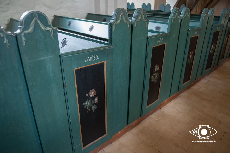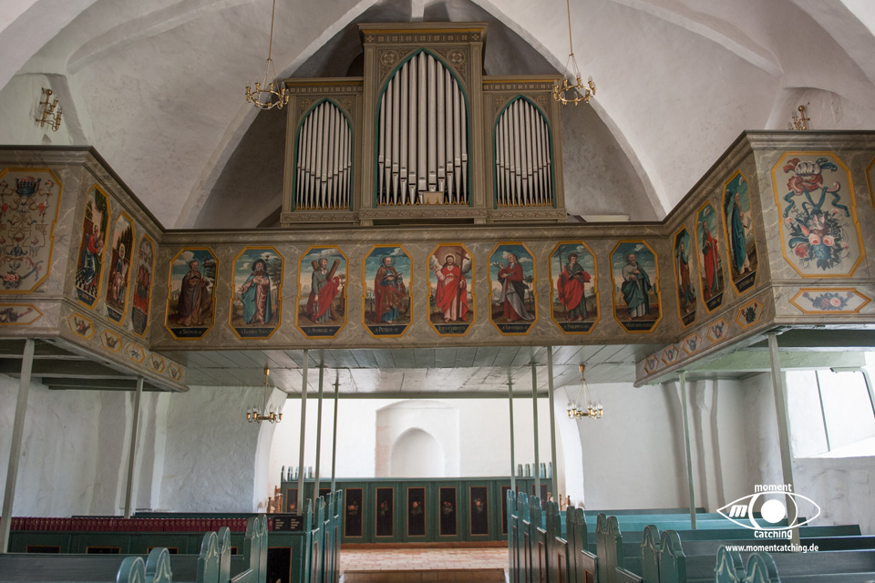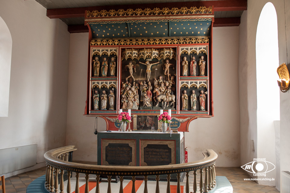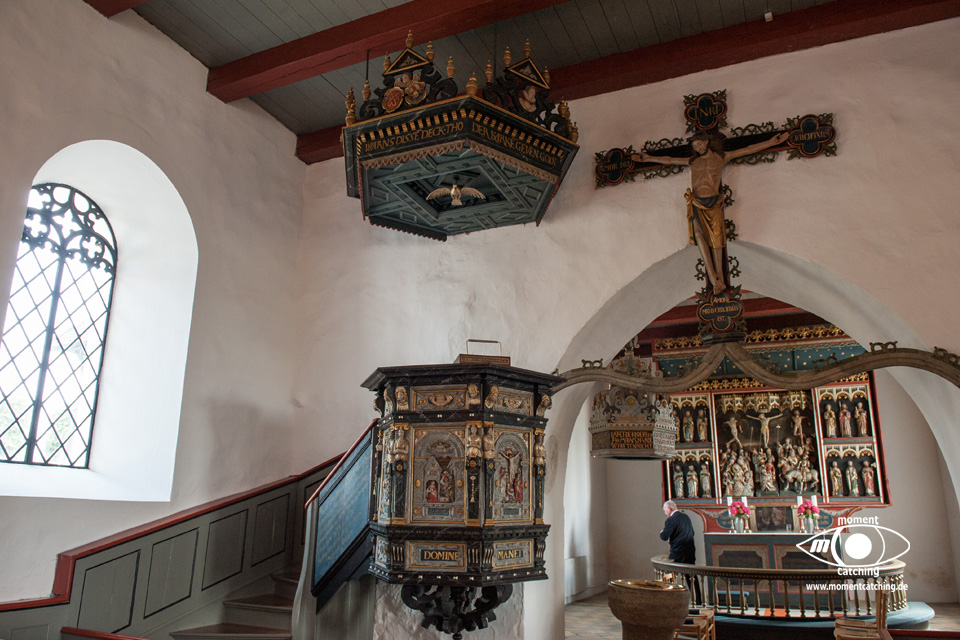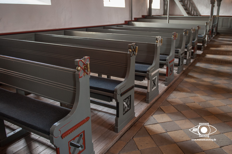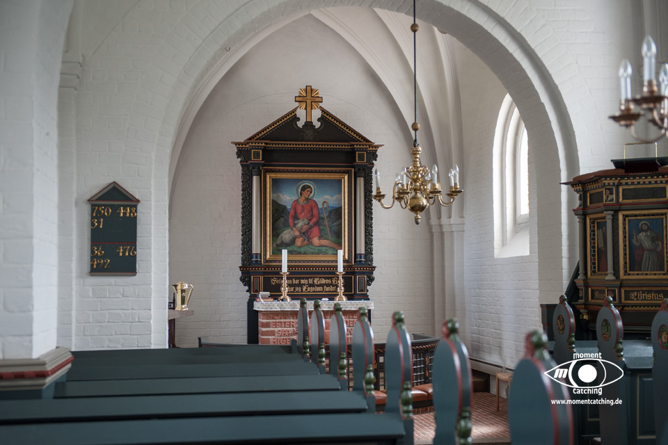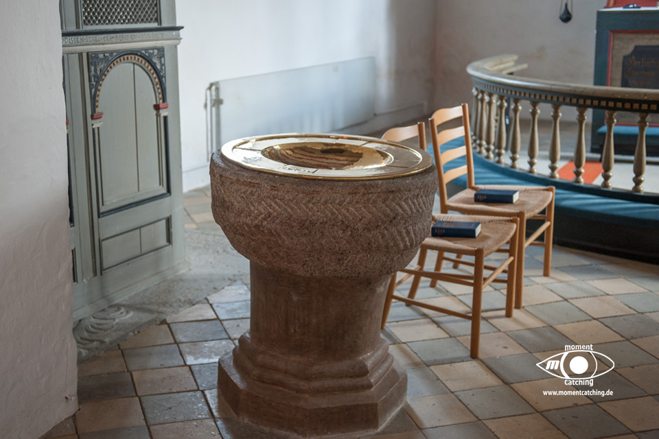 Für heute hatte uns der Wetterbericht nochmals einen schönen Tag versprochen. Danach sah es beim Frühstück allerdings nicht aus. Grauer Himmel und ziemlich stronger Wind. Wir haben uns davon nicht beeindrucken lassen und sind los geradelt. In Varnäs haben wir uns die Kirche angesehen. Da war gerade der Pfarrer bei Vorbereitungen. Er hat Kerzen am Altar aufgestellt. Auch diese kleine Dorfkirche verfügt über einen sehr schönen Altar und einem interessanten Taufbecken mit goldener Abdeckung. Unser Weg ging über Berg und Tal im wahrsten Sinne. Ein Glück, dass wir eBikes haben. Wir landeten nach einem Irrweg dann doch endlich am Strand in Feriekoloni, ein ganz kleiner Ort am kleinen Belt. Hier haben wir unser zweites Frühstück eingenommen auf einer Bank mit Tisch, wie es sie hier in Dänemark an fast jeder Stelle mit guter Aussicht gibt. Die Aussicht war hier aber auch besonders schön. Susanne war auf dem WC was versteckt hinter Bäumen und Büschen war und kam völlig irritiert wieder zurück. Das war die mieseste Toilette die ich je in Dänemark vorgefunden habe. Einfach nur ein Plumpsklo. Aber es war Toilettenpapier vorhanden. Heute konnten wir nach unserer Rückkehr am Womo noch draußen sitzen. Es hat heute auch mit dem Grillen gut geklappt. War ein sehr schöner Tag. |