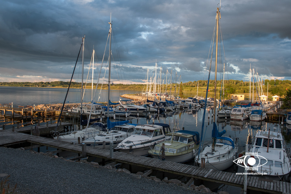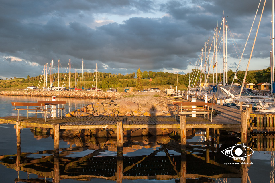 Heute Morgen hatte der Wind kräftig aufgefrischt und es gab offene Stellen in der Wolkendecke. Allerdings war es auch ganz schön frisch. Das Außenthermometer zeigte noch ganze 13°C. Ich habe heute nach dem Frühstück unser Womo ausgesaugt. Wir haben nur die Toilettenkassette geleert, danach sind wir abgefahren. Unser Weg nach Aabenraa führte fast nur über Autobahn durch sehr schöne Landchaft. Allerdings hat der sehr böige Wind teilweise kräftig an unserem Womo gerüttelt. Wir haben einen sehr schönen Platz an der Wasserfront bekommen, wenngleich es hier erst so richtig am Womo rüttelte. Das war uns egal, wir wurden durch die Aussicht entschädigt. Nach einer kurzen Hafenrunde haben wir unsere Möbel herausgeholt. Hinter unserem Womo glaubten wir uns sicher im Windschatten. Der Wind hat aber so viel Sand durch die Gegend geweht, dass sich erst Susanne nach drinnen verzogen hat, und ich dann nach weiteren 10 Minuten auch, weil ich total von Sand berieselt war. Kalt war mir aber auch noch außerdem. Gegen 18:00 Uhr viel bei uns der Strom plötzlich aus, nachdem der Kühlschrank schon wieder zu takkern begann. Es stellte sich heraus, dass unser Zuleitungskabel nach ca. 5 Metern einen Kabeldefekt hatte. Ich habe den Teil abgetrennt, danach war wieder alles Okay. Nach der Kabelreparatur sind wir in der Gaststätte vom Segelklub eingekehrt. Das war das zweite mal in Dänemark. Wir haben lecker gegessen und der Preis hielt sich in Grenzen. | |