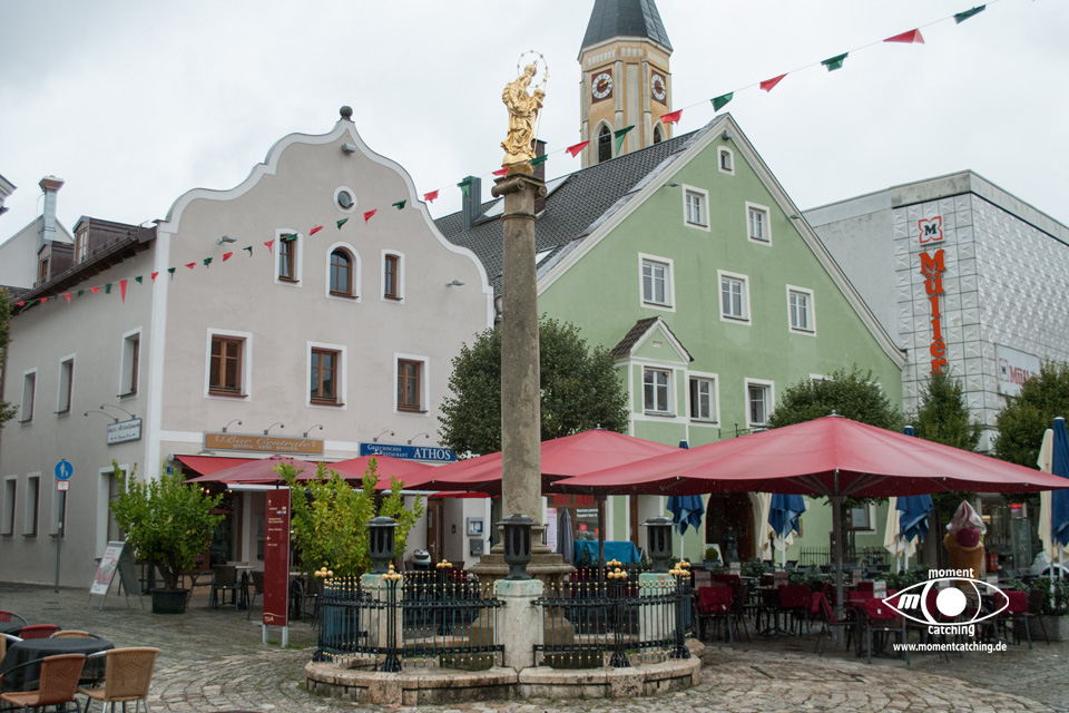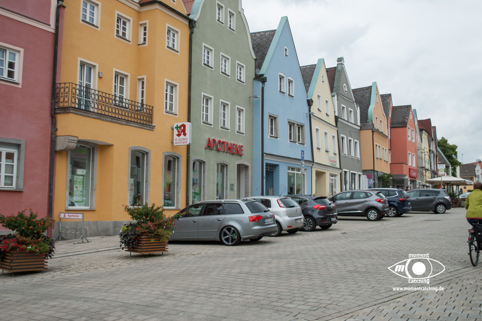 Wie vom Wetterbericht vorhergesagt, hat es heute Morgen geregnet. Ich habe mir das Brötchenholen verkniffen und es gab Toast. Nach dem Frühstück haben wir das Womo regeneriert, allerdings ohne Frischwasser. Vom Frischwasser war offensichtlich der Geldschacht voll. Aber wir werden schon noch über die Runden kommen. Die Ausfahrt aus Kelheim gestaltete sich wieder wegen der Umleitung etwas abenteuerlich. Beim Umkehren haben wir eine Tankstelle benutzt und gleich getankt. Danach haben wir die Ausflugsschneise gefunden und sind dann problemlos in Bad Gögging auf dem Stellplatz gelandet. Susanne hat dort Leute wiedererkannt, die mit uns zusammen in Bad Abbach standen. Sie haben uns alles von diesem Platz erläutert und ansonsten haben wir noch über Gott und die Welt geplaudert. Nach einem Kaffee sind wir in den Ort gelaufen zur Touristeninfo. In dem Cafe daneben haben wir uns Kuchen für unseren Kaffee besorgt. Der war so richtig lecker. Inzwischen hat es jetzt auch aufgehört zu regnen. Wir sind mit den Rädern nach Neustadt a. d. Donau gefahren, weil dort ein EDEKA ist. Der soll nämlich auch bis 20:00 Uhr offen haben. Nachdem wir uns den Ort etwas angesehen haben, haben wir in dem EDEKA unseren Lebensmittelvorrat aufgefrischt. Inzwischen schien sogar die Sonne ein wenig. |