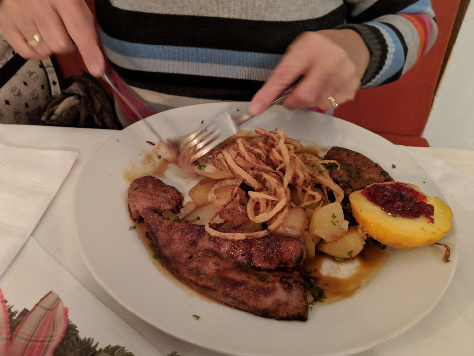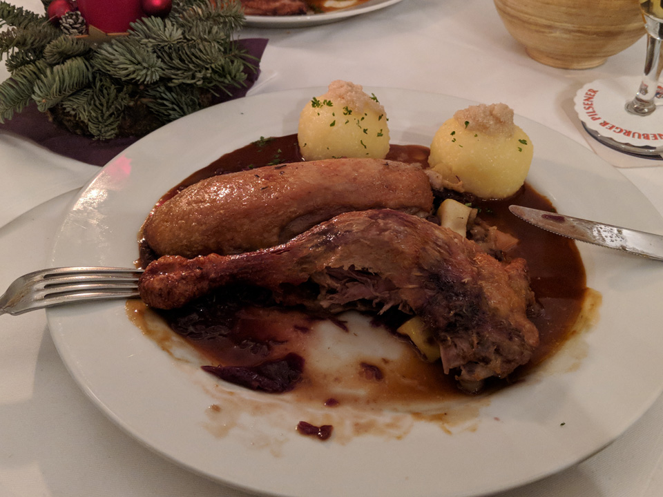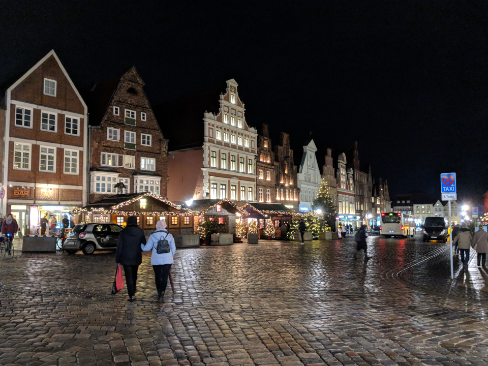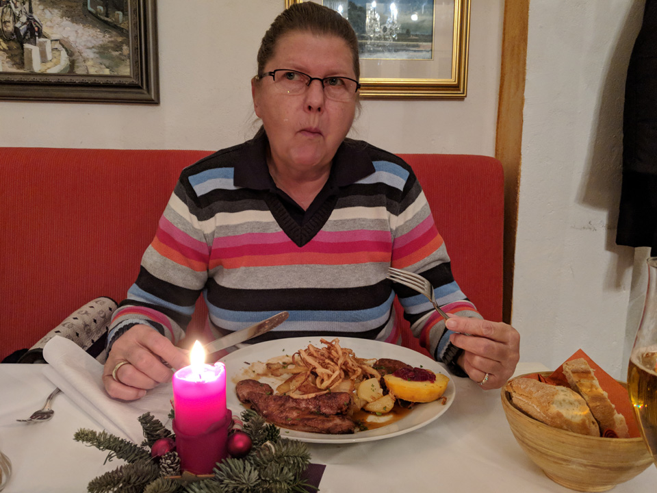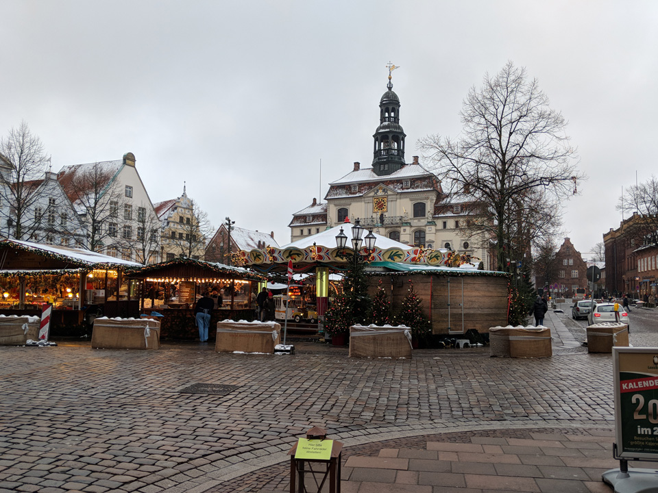 Wir sind in Lüneburg auf dem Stellplatz Salzwiesen wieder mal eingetroffen. Es liegt eine leichte Schneedecke, aber die Plätze sind noch gut befahrbar. Die Preise haben sich mal wieder geändert. Der Platz kostet jetzt 13 €, aber dafür inkl. Strom. Wir haben einen ersten Rundgang über die Weihnachtsmärkte von Lüneburg gemacht. Der am Rathaus hat uns am Besten gefallen. Unseren leckeren Quarkstollen haben wir auch bekommen. Auf dem Rückweg haben wir ganz in der Nähe vom Stellplatz einen EDEKA gefunden mit dem Bäcker "De Heidbäcker", der auch die leckeren Quarkstollen hat. Gegen Abend waren wir in der Kutscherklause richtig gut essen. Hier stimmte wirklich alles. Preis und Qualität waren ausgewogen. Ich habe eine halbe Ente gehabt und Susanne Kalbsleber berliner Art. Zum Start gab es leckeres Baguett frisch aufgebacken, Kapern, Oliven und Scheiben verschiedener Wursstsorten, Käsehäppchen und eine Quarkcreme. |