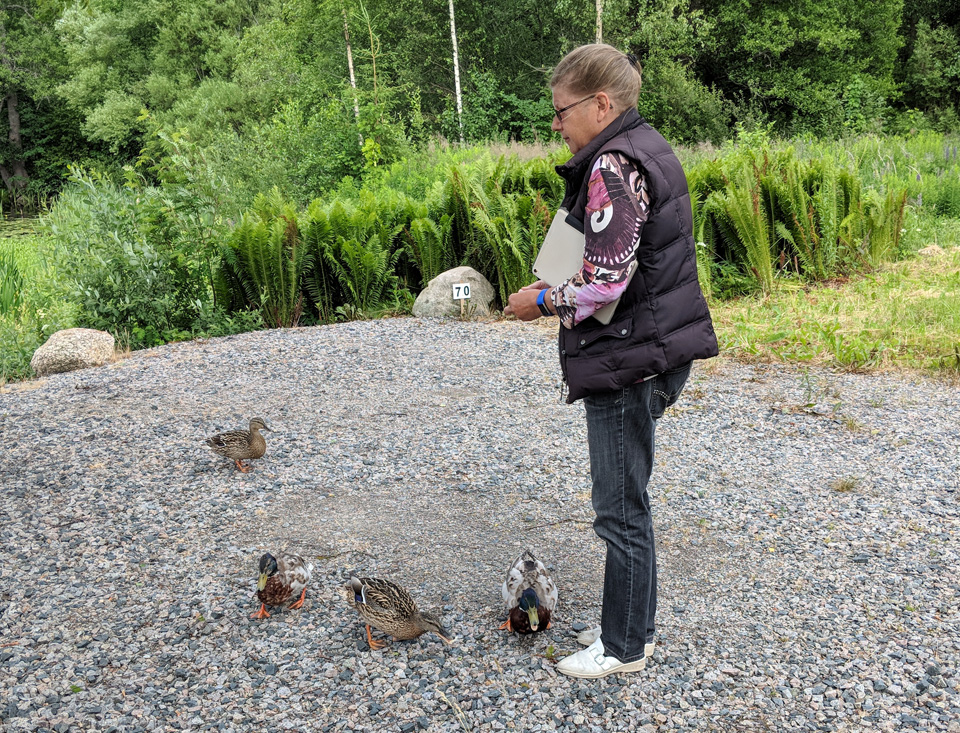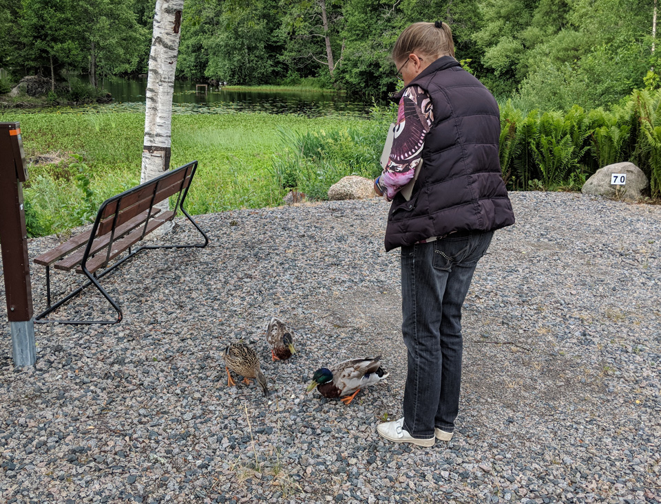 Wir sind in Karlstad auf dem Parkplatz am Mariebergsskogen angekommen. Eigentlich wollten wir mit dem Bootsbus in die Altstadt fahren. Leider war der Stellplatz voll und außerdem fing es an zu regnen. Laut Wetterbericht soll es den ganzen Nachmittag über regnen. Wir haben uns den vorderen Bereich des Parks angesehen und die Anlegestelle der Bootsbusse. Wir haben uns aber dann entschieden weiter zu fahren. Wir haben den Stellplatz auf dem Campingplatz Munkebergs in Filipstad erreicht. Wir werden hier die Mitsommerfeierlichkeiten miterleben. Mal sehen was das wird. Trotz vieler Reservierungen haben wir noch einen ganz schönen Platz mit Seeblick bekommen. Der Campingplatz bietet alles was wir brauchen und es gibt sogar in der Nähe einen ICA Nähra. Susanne ist in ihrem Element. Eine Ente mit zwei Jungen lässt sich füttern. Das lockt weitere Enten an, die ihr dann das Brot sogar aus der Hand nehmen. Na das ist ja genau das Richtige. Susanne hat jetzt neue Freunde. Die Ente mit den Jungen wird jetzt öfter vorbeischauen. |