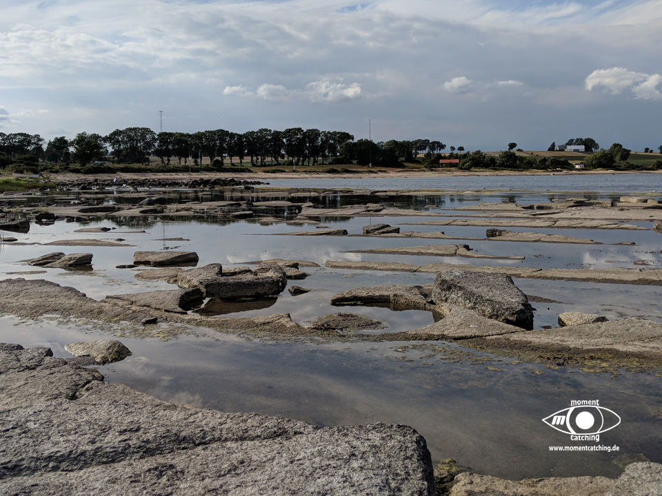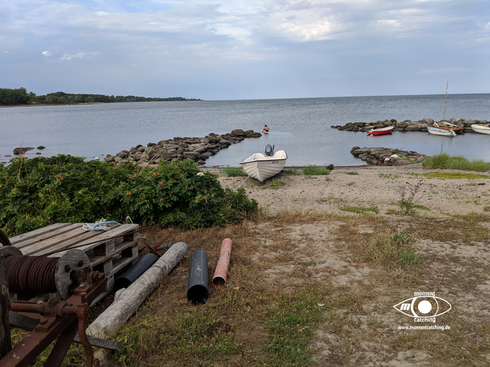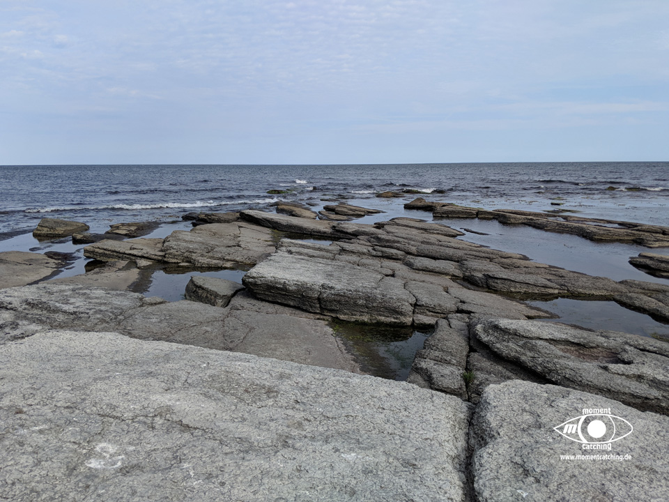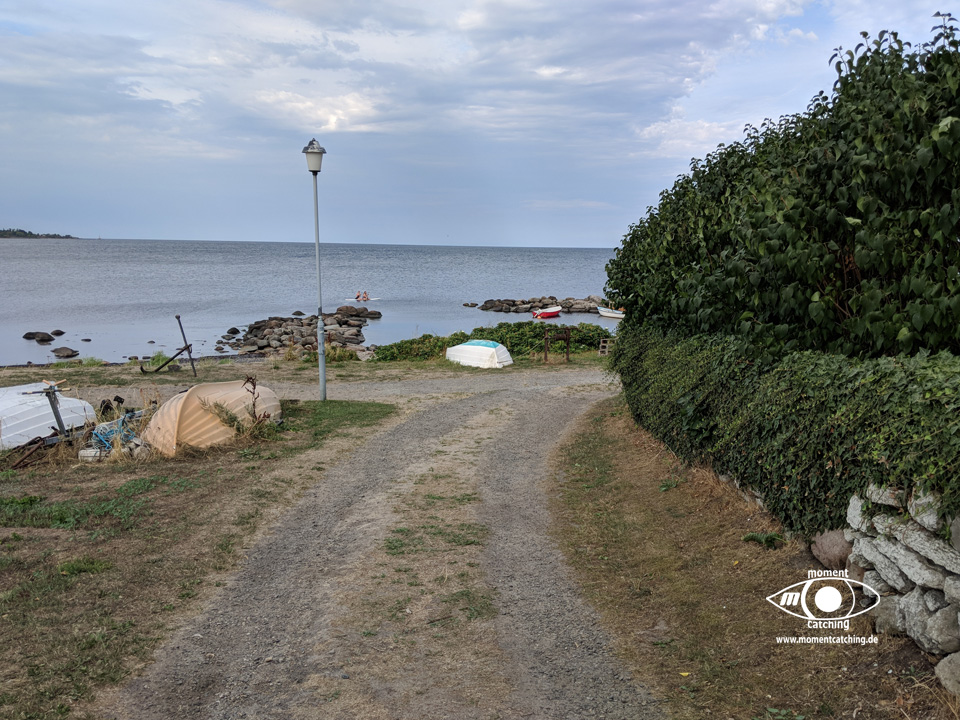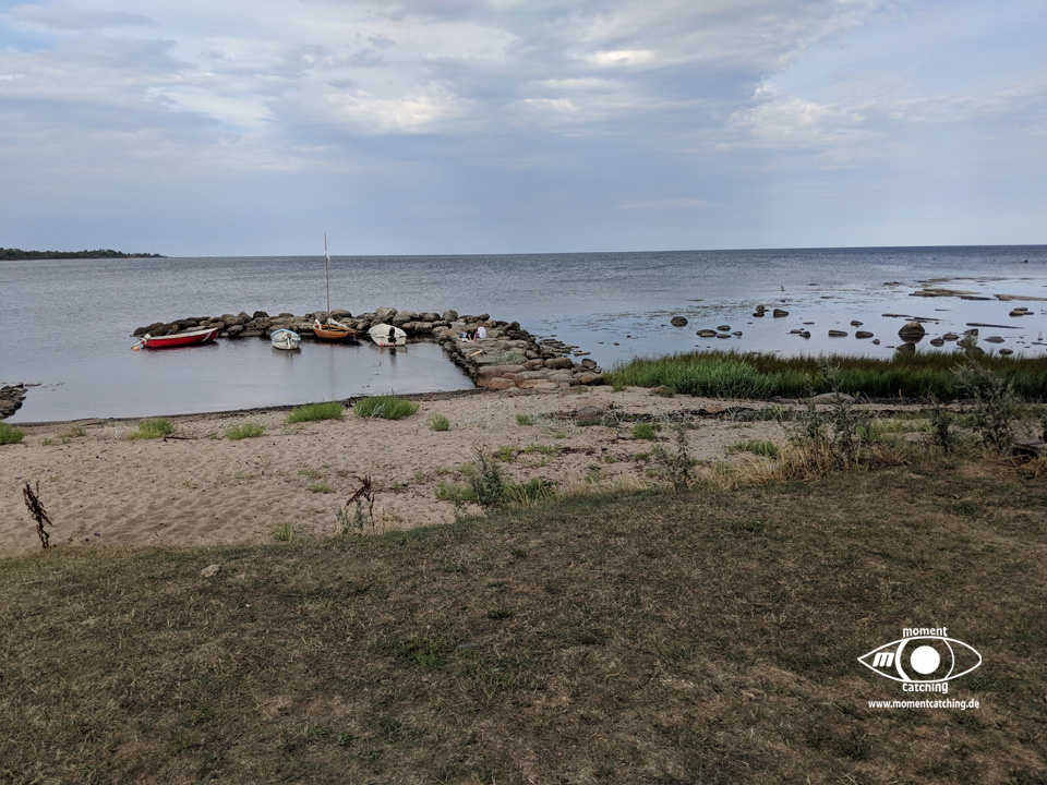 Wir haben den Stellplatz Gislövshammar, Hammarlunda bei Simrishamn erreicht. Von dem Platz hat man einen schönen Blick auf die Ostsee und sieht die Umrisse vom Westufer von Bornholm. Der Platz ist sehr minimalistisch ausgestattet aber hat Strom und Wasser und man kann die Toilettenkassette leeren. Wir stehen ganz oben am Feld und genießen den Ausblick. Das Gelände ist sehr schief und wir stehen mal wieder auf Keilen. Wir haben vom Stellplatz Hammarlunda bei Simrishamn aus einen Spaziergang zur Küste gemacht. Der kleine Fischerort Gislövshammar birgt einige geschichtliche Besonderheite. Neben den umliegenden Steinzeitgrabstätten war hier ein Steinbruch für Mühlsteine. Das Dorf ist wirklich extrem klein, aber sehr idyllisch. Der ehemalige Steinbruch ist direkt am Wasser. Die vielen kreisrunden Löcher ergeben ein skurriles Bild. Teilweise steht Brackwasser darin. |