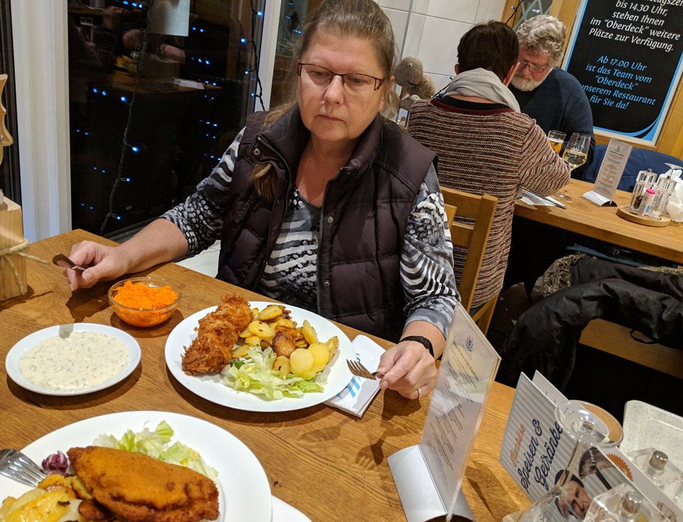 Wir sind zu der Fischfabrik gelaufen und dort zum Werksverkauf und waren angenehm überrascht, dass er auch zwischen Weihnachten und Silvester offen hat sogar an Silvester haben sie noch bis 13:00 Uhr offen. Wir haben für Maria und Klaus 2x Brathering besorgt und für uns den geschnitzelten Seelachs. Wir sind in die Altstadt gelaufen. Wir waren auf dem Marktplatz und sind über die Fußgängerzone zurückgelaufen. Dabei haben wir aus der Bäckerei Senf uns leckere Torte gekauft. Gegen Abend sind wir in die Seeperle gegangen, unser Lieblingsrestaurant in Wismar und haben dort gegessen. Wir hatten Backfisch mit Bratkartoffeln und Remouladensoße. An unseren Tisch kam noch ein Pärchen mit dem wir nett geplaudert haben. Sie waren früher mit einem Mietwomo unterwegs. Das Essen war wie immer lecker und preiswert. |