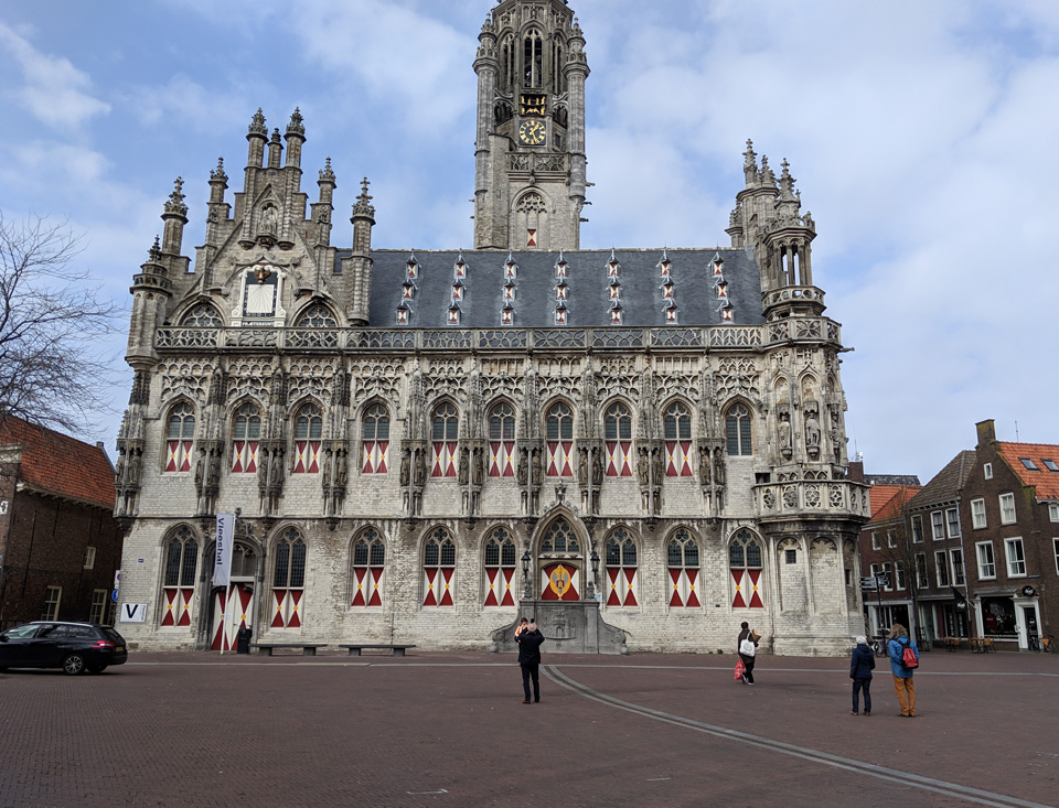 Das Wetter war so gut, dass wir schon kurz nach unserer Ankunft auf dem Stellplatz in Middelburg mit den Rädern gestartet sind. Lediglich einen gemütlichen Kaffee haben wir uns gegönnt. Wie wir später festgestellt haben, sind wir einen Umweg gefahren, aber trotzdem sind wir treffsicher auf dem Rathausplatz gelandet. Das alte Rathaus ist wirklich ein beeindruckendes Bauwerk. Ansonsten ist der Marktplatz leider durch die Kriegseinwirkungen eher mit modernen Häusern umsäumt, als mit historischen. Unser Besuch in der Touristeninformation ergab nur eine kleine Broschüre über einen Stadtrundgang. Aber immerhin, da ist ja dann doch noch einiges an Informationen die uns bei unseren Spaziergängen helfen können. Vom Marktplatz aus sind wir in Richtung Abteiviertel gegangen. Das ist eine gigantische Anlage mit eigentlich zwei Kirchen, die Koorkerk (Chorkirche) und die Nieuwe Kerk (neue Kirche). Für beide Kirchen haben wir keinen offenen Zugang gefunden, lediglich in den Kreuzgang und den Hof konnte man gehen. Dass gesamte Essemble ist sehr beeindrucken. Von hier aus hat uns Susanne mit Handynavigation zum Jumbo-Einkaufscentrum geleitet. Dort hat Susanne weitere 5 kg Kaffee gekauft, die jetzt dann für Klaus und Renate sind. Von da aus haben wir uns eigentlich auf den Heimweg gemacht, haben aber unterwegs noch das Koepoort gesehen, ein letzter Rest von der Stadtmauer. Die nördliche Mühle, die Seismolen, konnten wir auf dem Rückweg auch noch bestaunen. Das war eine kurze Radtour aber auch eine angenehme. Die Stadt Middelburg gefällt uns. Morgen werden wir sie weiter erkunden. |
