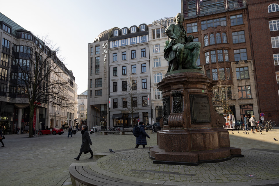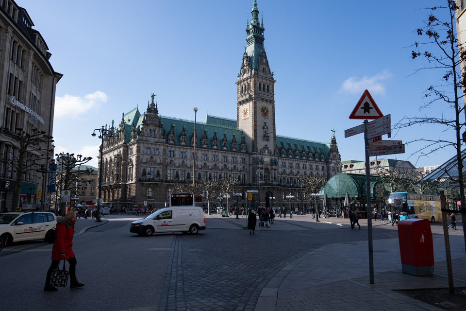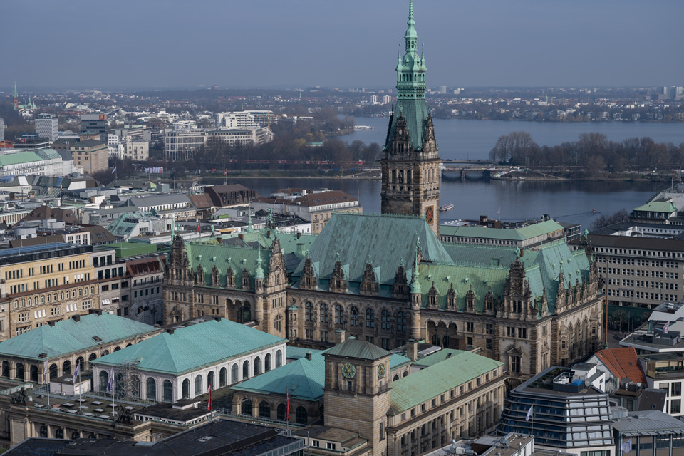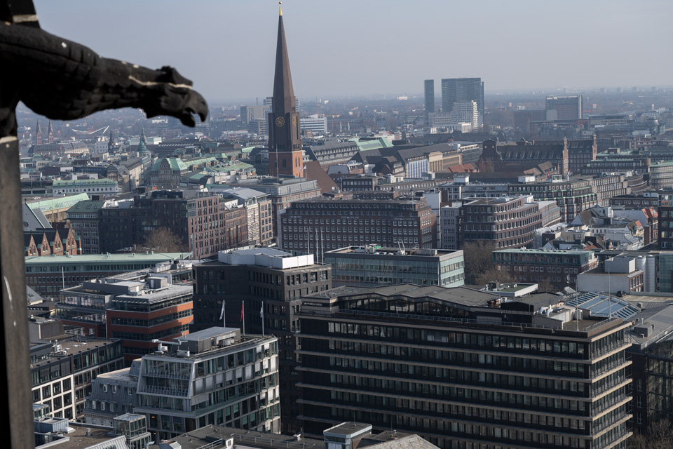 Für heute hatten wir uns eine Auffrischung unserer Eindrücke von dem Umfeld der Binnenalster vorgenommen und Susanne wollte sich ein Nachthemd für ihren geplanten Krankenhausaufenthalt kaufen. Den Rundgang wollten wir erstmal zu Fuß machen und dann eventuell vom Hauptbahnhof die eine Station mit der S-Bahn zum Stellplatz zu fahren. Unser erster POI war die Ruine der Nikolaikirche. Wir konnten mit dem Aufzug in dem übriggebliebenen Glockenturm auf über 80 Meter Höhe steigen, ohne auch nur eine Treppenstufe zu steigen. Besser geht es nicht und wir waren beide von der Aussicht beeindruckt. Das Museum in den noch vorhandenen Kellerräumen der Ruine hat uns sehr beeindruckt. Hauptthema ist hier das Bombardement vom Juni 1943. In drei Schüben haben hier britische und US-amerikanische Bomber große Teile von Hamburg in Schutt und Asche gelegt. Nach eigenen Aussagen sollten diese Bombardements die Zivilbevölkerung treffen, mit dem Ziel sie kriegsmüde zu machen. Nach heutigem internationalem Recht ein klares Kriegsverbrechen. Dumm nur, das Deutschland diesen Krieg angefangen hat und der größte Teil der Bevölkerung dafür war und es auch noch zum Zeitpunkt der Bombardements war. Was für ein Wahnsinn, der tausenden von unschuldigen Menschen das Leben kostete, für eine menschenverachtende Staatsmacht mit pervertierter Argumentation. Aus Sicht der Nationalsozialisten waren die Juden an dem Krieg schuld. Da fehlen einem die Worte. Der Besuch dieses Museums hat uns sehr tief beeindruckt.