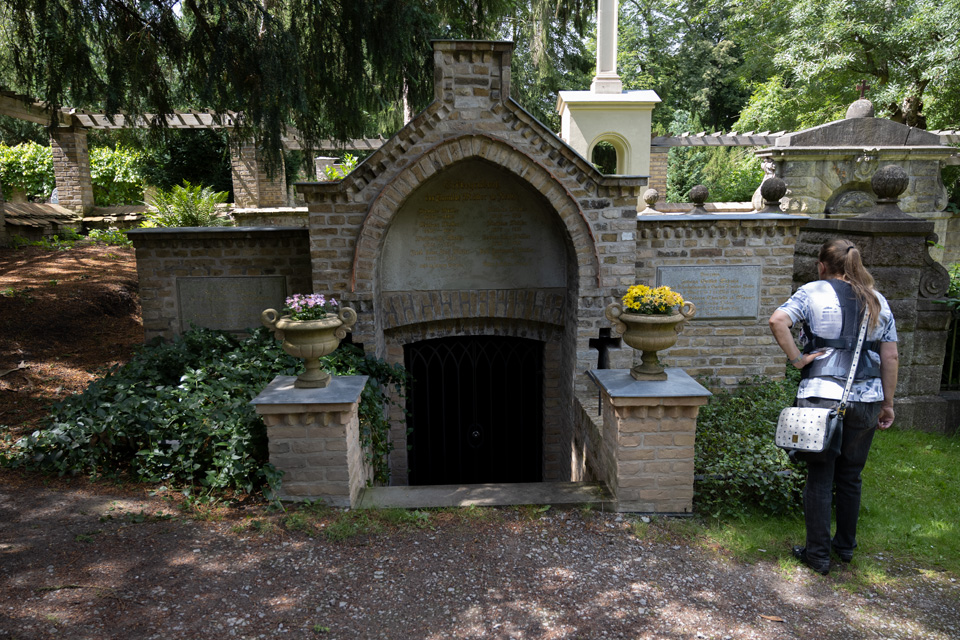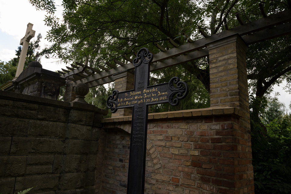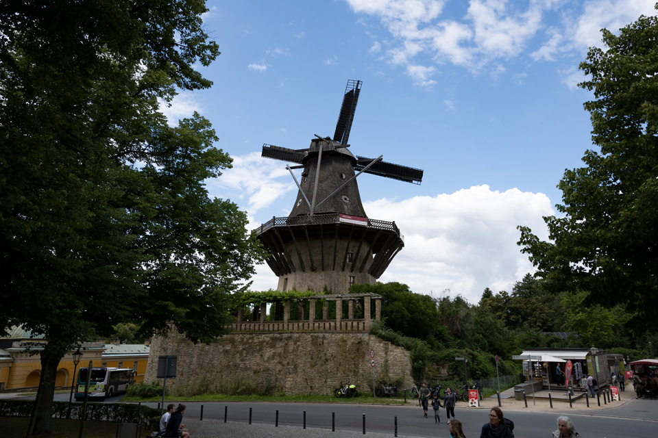 Nach Schloss Sanssouci wollten wir in der Gaststätte an der historischen Mühle Kaffee trinken, aber Susanne hat dort nichts gefallen. Wir sind weiter gezogen. Am Krongut Bornstedt wieder angekommen haben wir uns den gegenüberliegenden Friedhof angesehen. Er gehört zur Dorfkirche Bornstedt. Er beherbergt über 500 prominente Personen mit entsprechenden Gräbern. Einige davon sind über 400 Jahre alt. Beim Weitergehen haben wir uns kurz verlaufen. 500 Meter um sonst von Susannes 13500 Schritten.