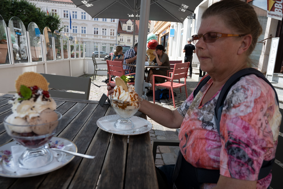 Wir haben einen Spaziergang in die Altstadt von Havelberg gemacht. Am Rathaus haben wir ein kleines Eiscafe gefunden und dort haben wir ein leckeres Eis gegessen. Das war sehr preiswert und sehr gut. Die Altstadt hat sich gut herausgemacht. Fast alle Häuser sind renoviert und die Straßen sind top in Ordnung. Die Kirche wird wohl z. Zt. renoviert. Man kann aber durch ein Eisengitter hineinsehen.