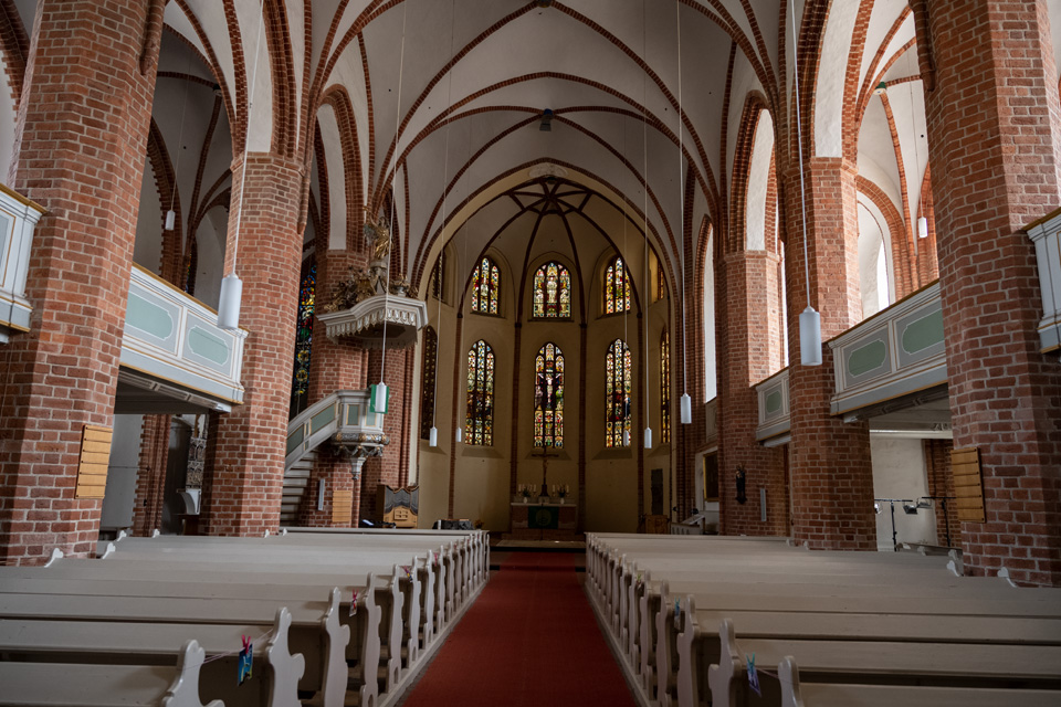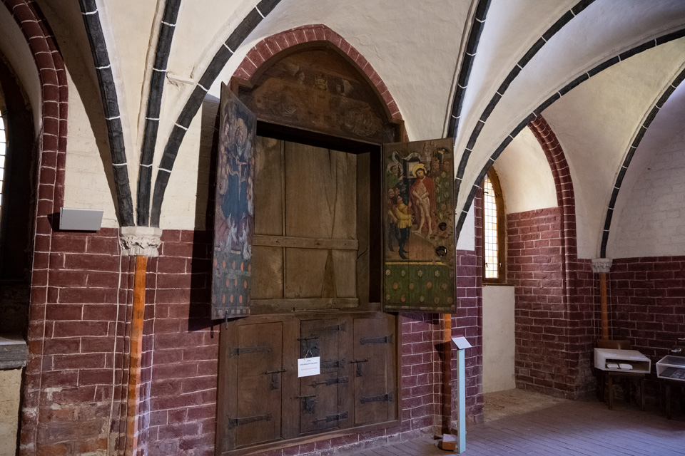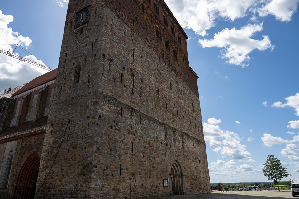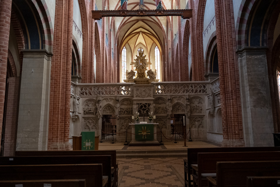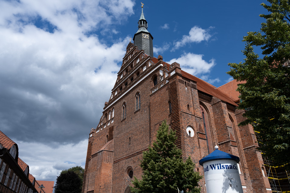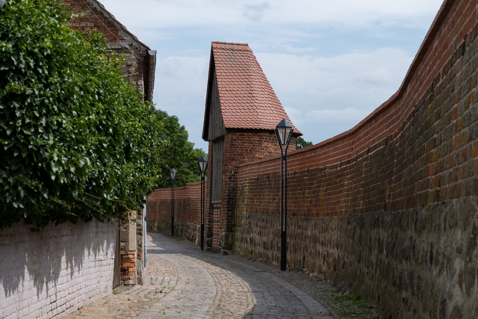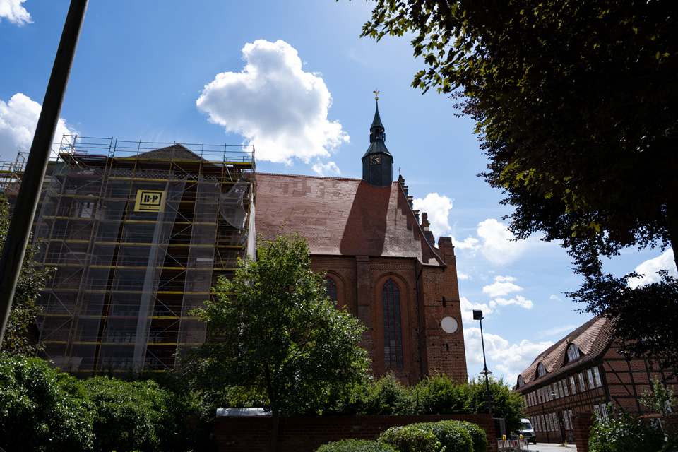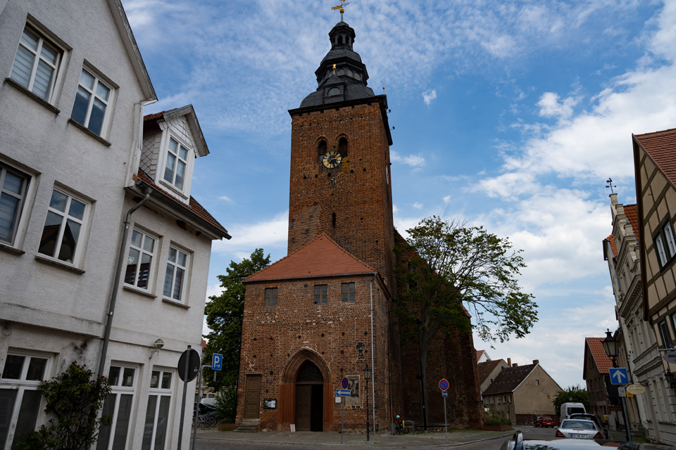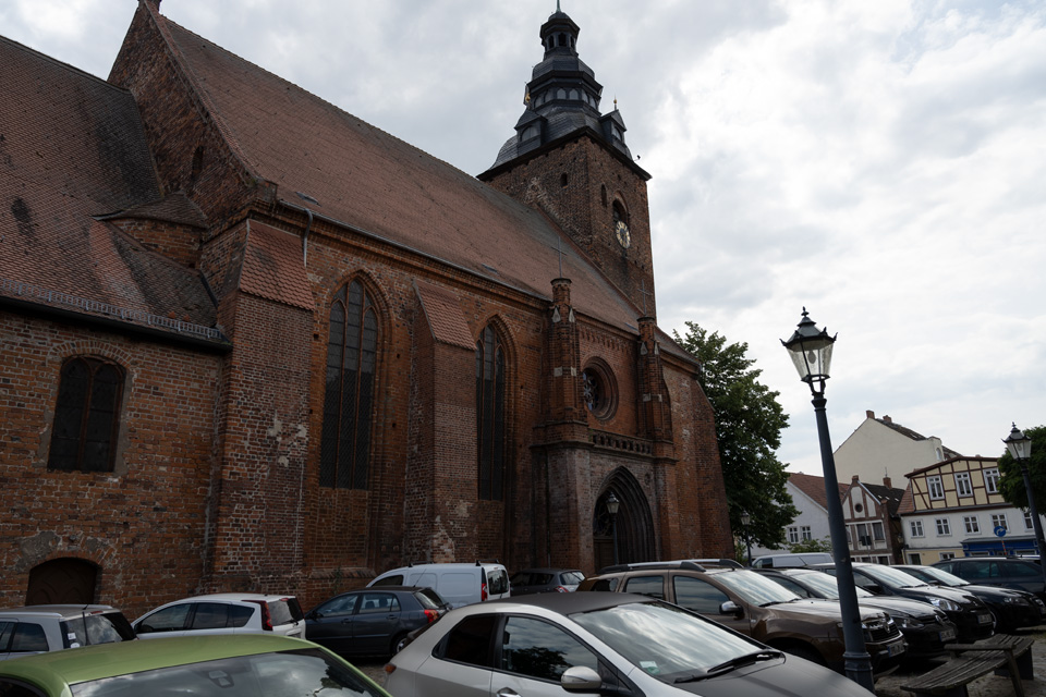 Wir sind vom Stellplatz in Kyritz entlang der ehemaligen Stadmauer in Richtung Westen gelaufen. Die Reste des ehemaligen Klosters sind z. Zt. nicht zugänglich, da umfangreiche Restaurierungsmaßnahmen stattfinden. Nächstes Ziel ist die St. Marienkirche. Obwohl es schon 10 Minuten nach 13:00 Uhr ist, ist sie immer noch verschlossen. Wir haben im geschlossenen Gemeindezentrum den Pfarrer getroffen, er hat die Kirche aufgeschlossen. An der Westseite der Stadtmauer ging es wieder zurück.