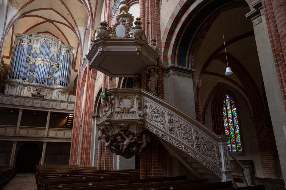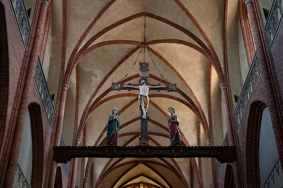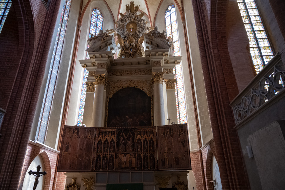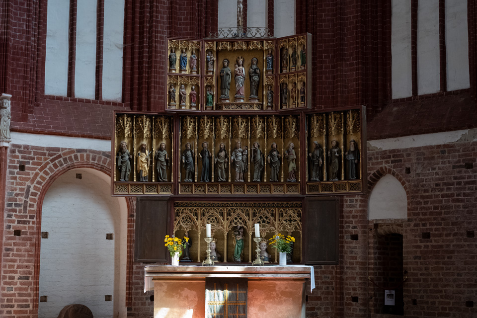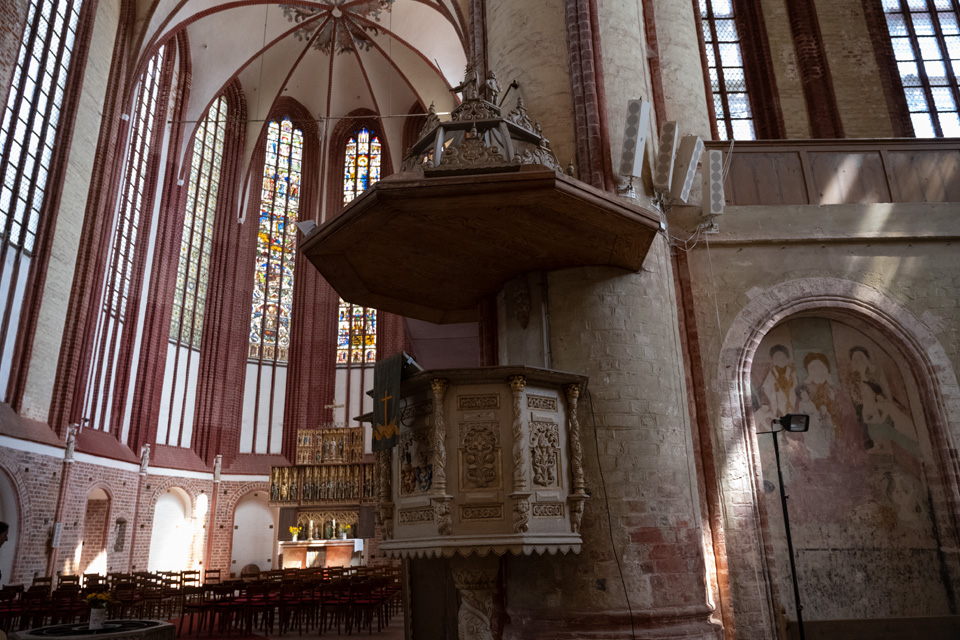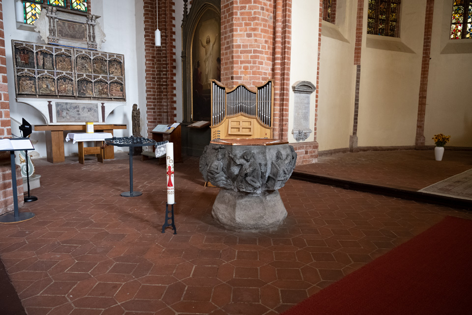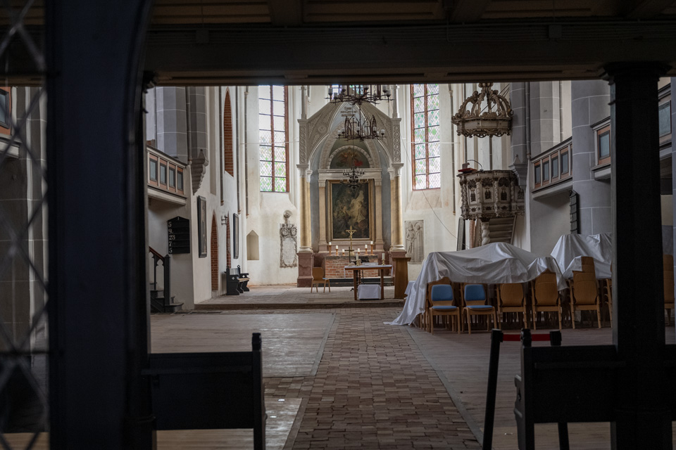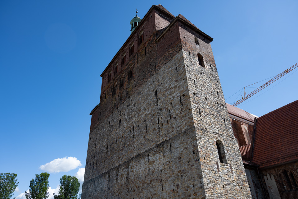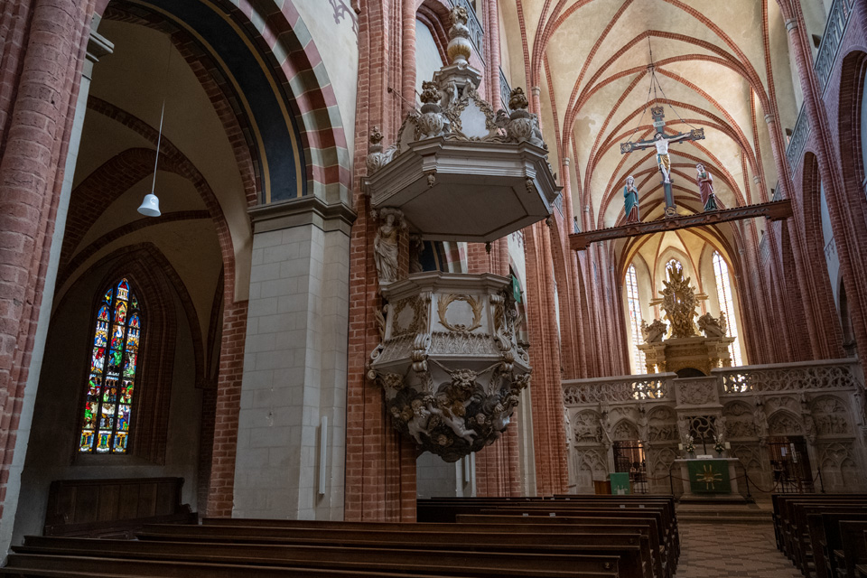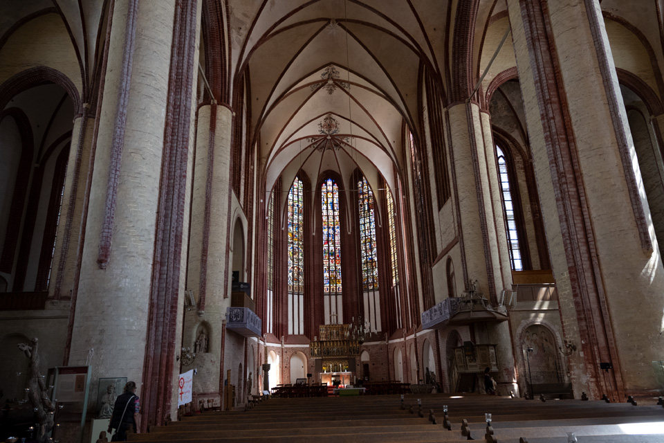 Wir sind vom Stellplatz in Kyritz entlang der ehemaligen Stadmauer in Richtung Westen gelaufen. Die Reste des ehemaligen Klosters sind z. Zt. nicht zugänglich, da umfangreiche Restaurierungsmaßnahmen stattfinden. Nächstes Ziel ist die St. Marienkirche. Obwohl es schon 10 Minuten nach 13:00 Uhr ist, ist sie immer noch verschlossen. Wir haben im geschlossenen Gemeindezentrum den Pfarrer getroffen, er hat die Kirche aufgeschlossen. An der Westseite der Stadtmauer ging es wieder zurück.