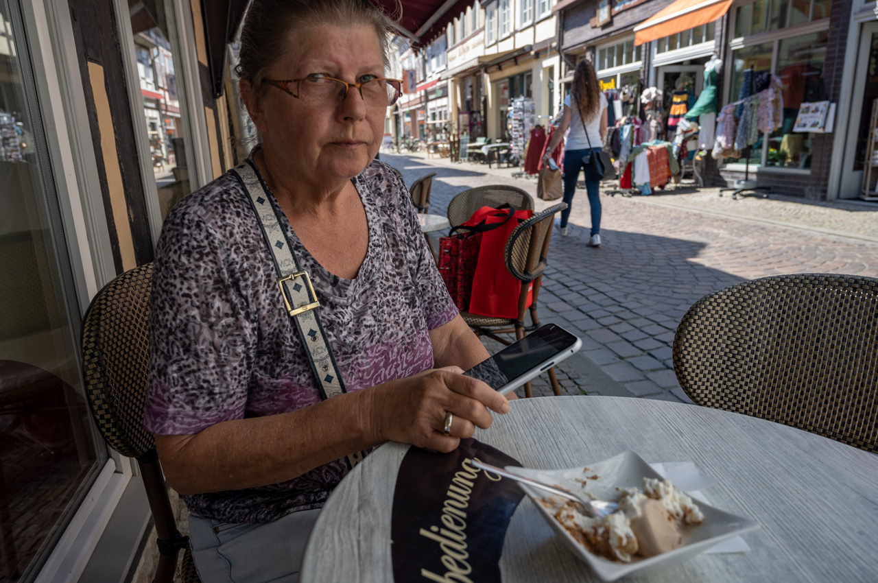 Nach meinem Ausflug sind wir nochmals in die Altstadt gelaufen. Auf dem Hinweg zur Katharinenkirche waren wir an der katholischen Lorenzkirche. Man konnte hier in einen Vorraum und wenigstens durch eine Glasfront in die Kirche sehen. Bei der Katharinenkirche hing leider noch das selbe Schild an der Eingangstür wie schon am Dienstag. "Leider bleibt unsere Kirche heute aus organisatorischen Gründen geschlossen". Alo wir standen wieder vor verschlossener Tür. Wir haben eine Außenrunde gedreht und sind dann zurück über die Breite Straße zum ehemaligen Neustädter Rathaus. Dort hatten wir auf dem Hinweg ein Eiscafe entdeckt. Hier haben wir uns jeder einen Eisbecher gegönnt. Das Eis war gut und preiswert. Danach ging es weiter zur Konditorei Kruse. Susanne hat hier noch zwei Baumkuchen zum Verschenken gekauft. Jetzt zog es uns zurück zum Womo. Wir hatten inzwischen 33°C und da hatten wir nicht mehr die geringste Lust noch in der Stadt herumzulaufen. Am Womo habe ich endlich mal wieder einen Mittagsschlaf gehalten. Im Schatten unter unserer Markiese ließ es sich aushalten.