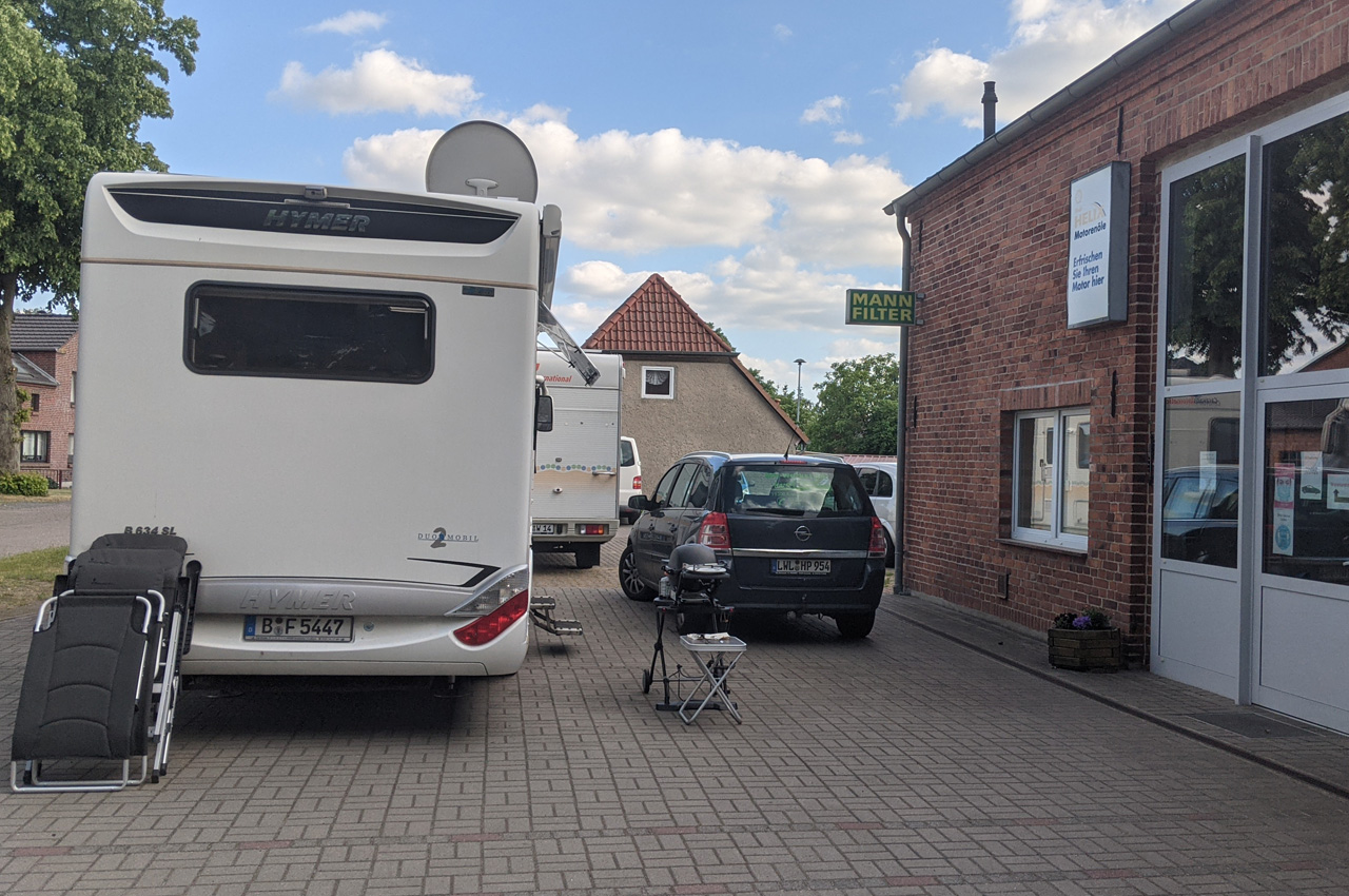 Der Versuch bei der Kfz-Werkstatt Pannke die Steuerzentrale via Funk zu koppeln ist wieder fehlgeschlagen. E&P meint nun, dass das Gerät defekt ist. Es soll eingeschickt werden und mann will sehen was damit ist und gegebenenfalls wird es dann repariert. Damit waren wir nicht einverstanden, weil auch nicht sichergestellt werden konnte, dass die Rückgabe bis zum Start unserer Schwedentour erfolgen wird. Wir haben uns darauf verständigt, dass umgehend ein neues Gerät abgeschickt wird und wir das defekte im Austausch dann abgeben. Wir können die Anlage ja mit dem alten Gerät so lange nutzen, es geht nur die Funk- und damit die Wiegefunktion nicht. Wir sind gegen 11:00 Uhr bei der Werkstatt abgefahren.