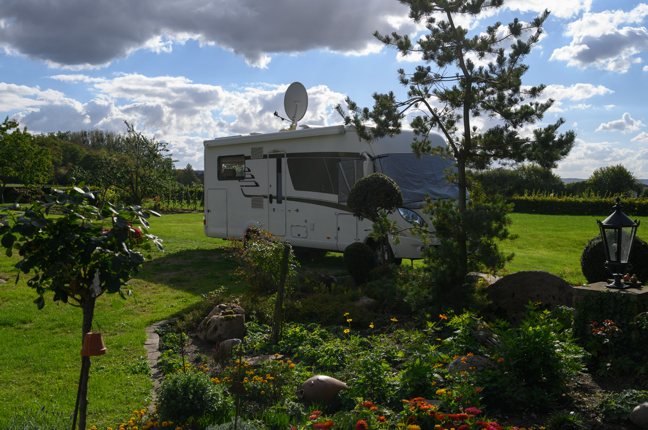 Unser Weg führte uns durch schöne Landschaft und da es Sonntag war, waren auch keine Lkw´s unterwegs. Also haben wir relativ früh auch unseren geplanten Stellplatz erreicht. Was wir da sahen, gefiel uns gar nicht. Massen von Wohnmobilen und das ganze unter einem endlos anmutendem Laubdach. Satellitenempfang ist hier wohl nicht zu erwarten. Das für drei Tage Tage, gefiel uns absolut nicht. Wir haben uns nach einer Alternative im Internet umgesehen. Wir haben einen Platz an einem Hotel im Süden von Bremen gefunden. Dort hat Susanne vorsichtshalber angerufen, ob auch noch etwas frei ist. Eine halbe Stunde später sind wir dort eingetroffen. Wir haben einen guten Platz und konnten problemlos den NIU auspacken.