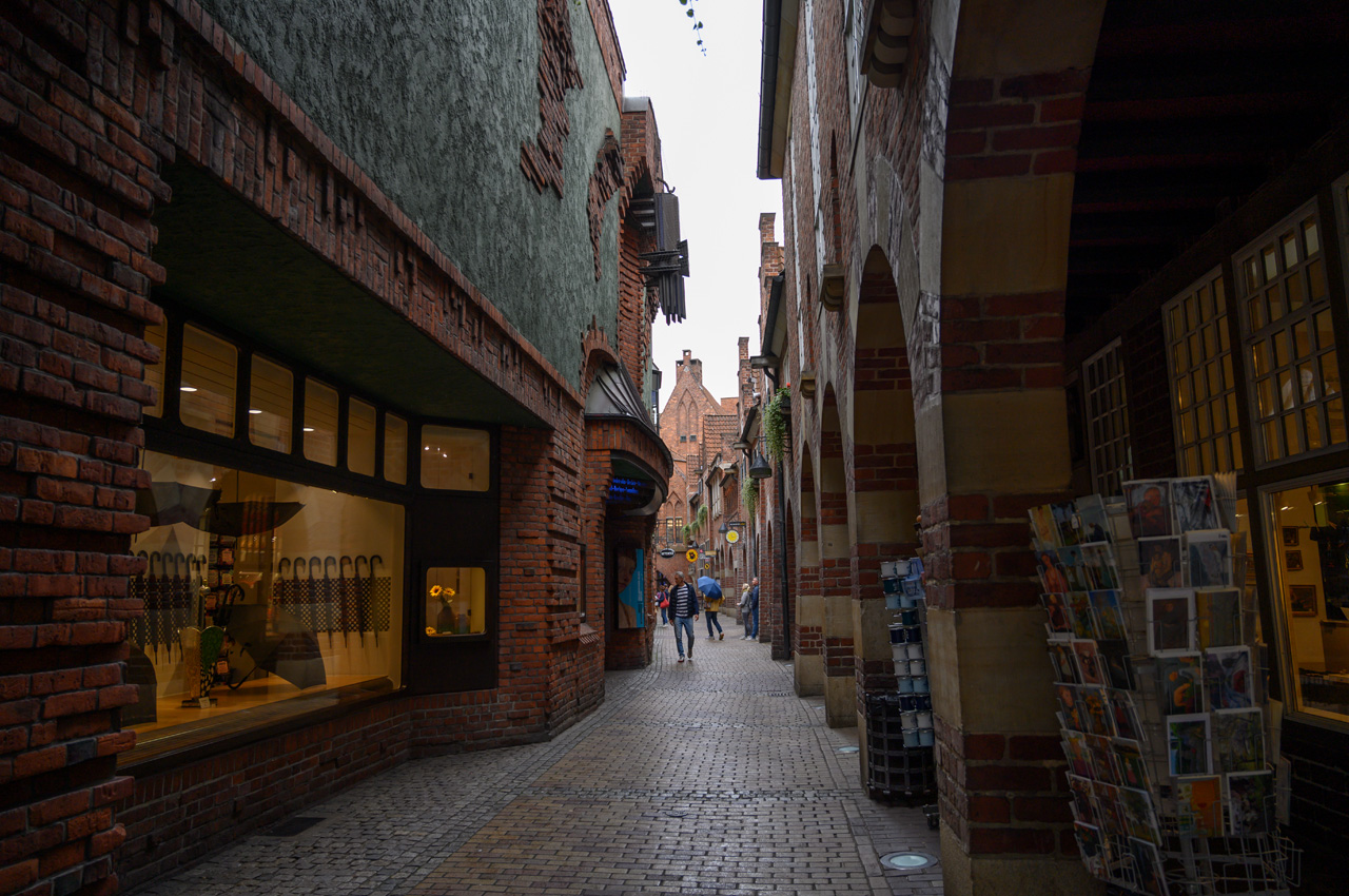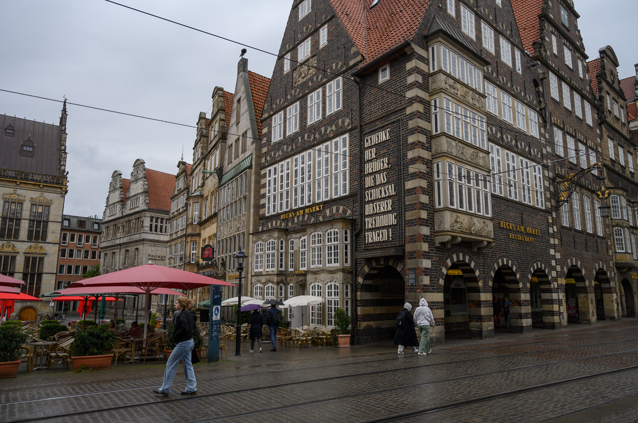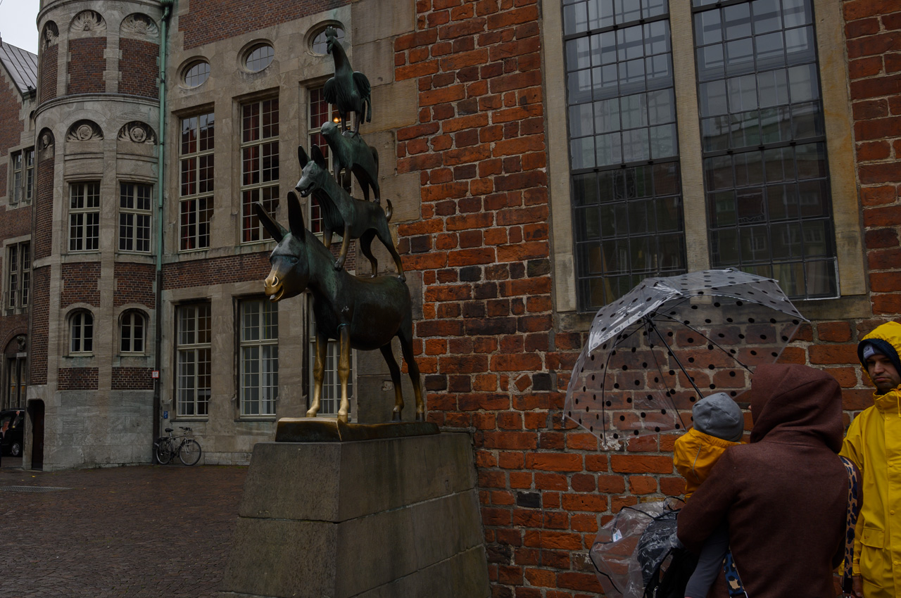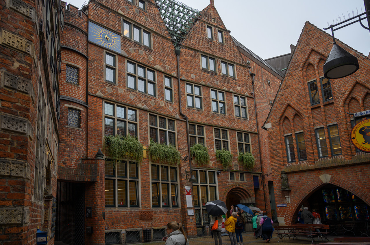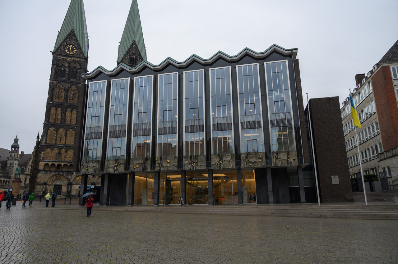Schon in der Nacht hatte es angefangen zu regnen und auch als wir aufgestanden sind hat es noch geregnet. Auf dem Weg zum Bäcker hatte ich Glück da hat der Regen mal eine Pause gemacht. Da der Wetterbericht komplett für den ganzen Tag Regen vorhergesagt hat, war es eigentlich egal wann wir starten, die Wahrscheinlichkeit, dass wir nass werden, ist sehr hoch. So gegen 11:00 Uhr sind wir dann mit dem NIU in die Altstadt aufgebrochen. In der Nähe der Böttcherstraße haben wir unseren NIU abgestellt. Schon als wir in die Böttcherstraße eingebogen sind, hat es wieder etwas stärker angefangen zu regnen und das hat tapfer bis zur Rückkehr zum Womo durchgehalten. Echtes Mistwetter. Wir haben uns aber nicht die Laune vermießen lassen und sind durch die Böttcherstraße spaziert. Danach sind wir auf den Marktplatz gegangen und haben dort die schönen historischen Gebäude ringsherum bestaunt. Dieses mal haben wir auch die Kirchen am Marktplatz nicht ausgelassen. Zuerst die Kirche unser Lieben Frauen und danach wollten wir in den Dom, was ber erst um 12:15 Uhr wieder möglich ist. Da wir zwischendurch am Rathaus erfahren haben, dass man die Karten für eine Besichtigung in der Touristeninfo in der Böttcherstraße kaufen muss, sind wir wieder nach dahin zurück. In der Touristeninfo haben wir erfahren, dass heute wegen einer Veranstaltung gar keine Besichtigungen stattfinden. Wir haben aber gleich für morgen zu 12:00 Uhr gebucht und bezahlt, weil diese Besichtigungen wohl sehr schnell ausgebucht sind. Danach ging es zurück zum Dom, der dann nach kurzer Wartezeit auch geöffnet hat. Von dem Dom hatten wir mehr Reichtum und Gestaltung erwartet, da ja Bremen eine sehr reiche Hansestadt war. Trotzdem ein sehr beeindruckendes Gebäude. Nun haben wir noch einen Bummel durch die Einkaufsstraßen rund um den Marktbereich gemacht, bevor wir die Rückfahrt zum Womo angetreten sind.