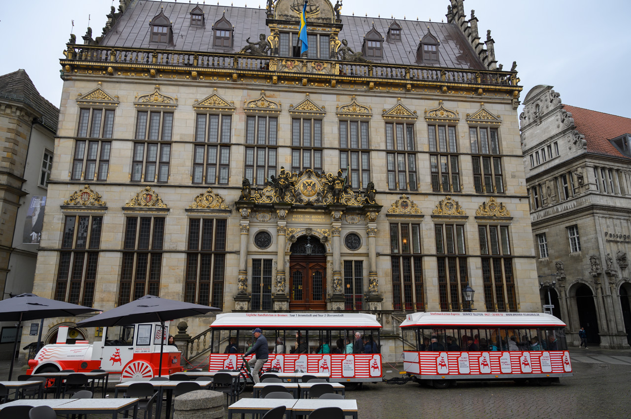 Nach dem Frühstück sind wir ziemlich zeitnah auf den NIU gestiegen um in die Altstadt zu fahren. Prompt fing es auch wieder an zu regnen. Bevor wir um 12:00 Uhr die Rathausbesichtigung antreten sind wir noch etwas durch die Altstadt gelaufen. Dabei haben wir uns die St. Martin-Kirche und die St. Johann Kirche angesehen. Beide Kirchen haben eine sehr schlichte Ausstattung und wenn man sie nicht gesehen hätte, hätte man auch nichts versäumt. Ein besonders schönes Stück der Altstadt ist der sogenannte Schnoor, der älteste noch vorhandene Teil Bremens. Hätte es nicht ständig genieselt, wäre das ganze ein noch besserer Genuß gewesen. Die Führung durch das Bremer Rathaus begann mit etwas Verspätung. Der Guide hat es sehr gut gemacht, aber für unseren Geschmack etwas zu ausführlich. Richtig sehenswert ist eigentlich nur der Festsaal im alten Rathaus. Hier spürt man das historische und den Reichtum der Bremer Bürgerschaft in früheren Zeiten. Als wir das Rathaus verlassen haben, standen wir wieder im Regen. Auch die Rückfahrt zum Womo fand wieder im Regen statt.