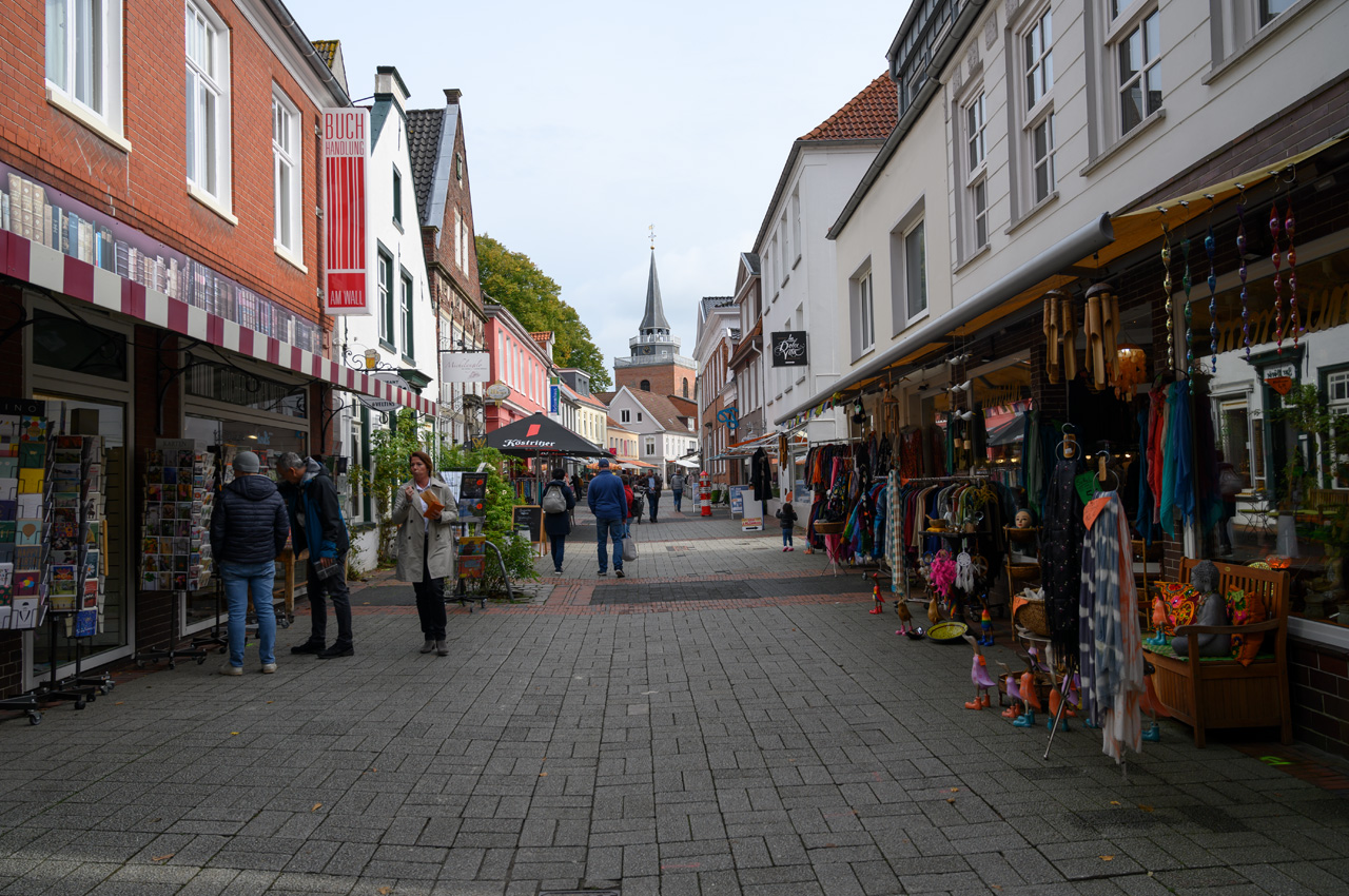 Wir haben bis zum Mittag gewartet bis sich der Nebel gelichtet hatte und sogar einige Sonnenstrahlen herauskamen. Wir haben vorbei am Schloss wieder einen Spaziergang durch die Altstadt gemacht. Dabei habe ich mir die Jacke gekauft, die mir gestern schon angenehm aufgefallen war. Heute habe ich sie mir gekauft. In der Touristeninfo haben wir uns eine Gästekarte ausfertigen lassen, weil sie nichts kostet, man aber bei verschiedenen Sachen Rabatt bekommt. Außerdem haben wir für Sonnabend eine Schifffahrt auf dem Ems-Jade-Kanal gebucht. Zurück durch die Fußgängerzone, die wir recht gut finden, waren wir noch kurz im EDEKA, bevor wir dann am Womo unseren Spaziergang beendet haben.