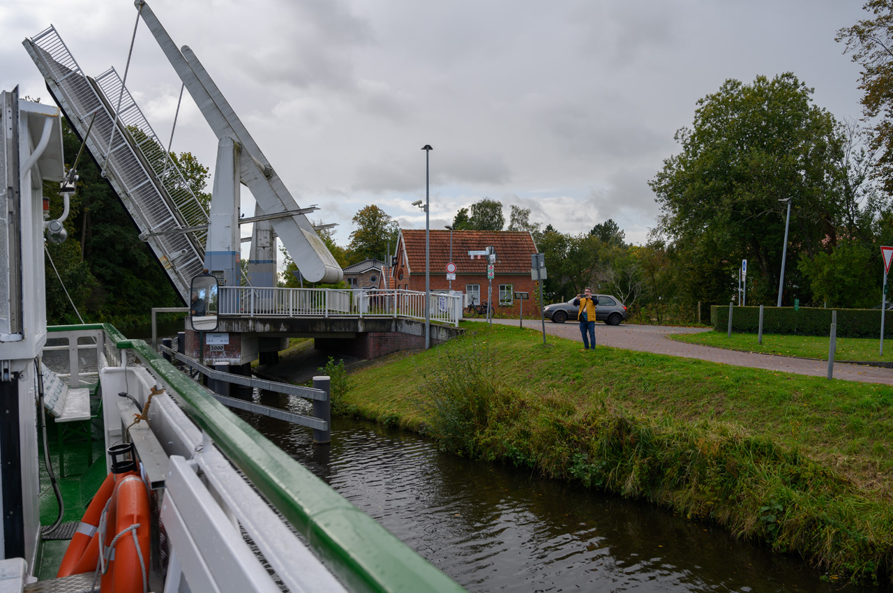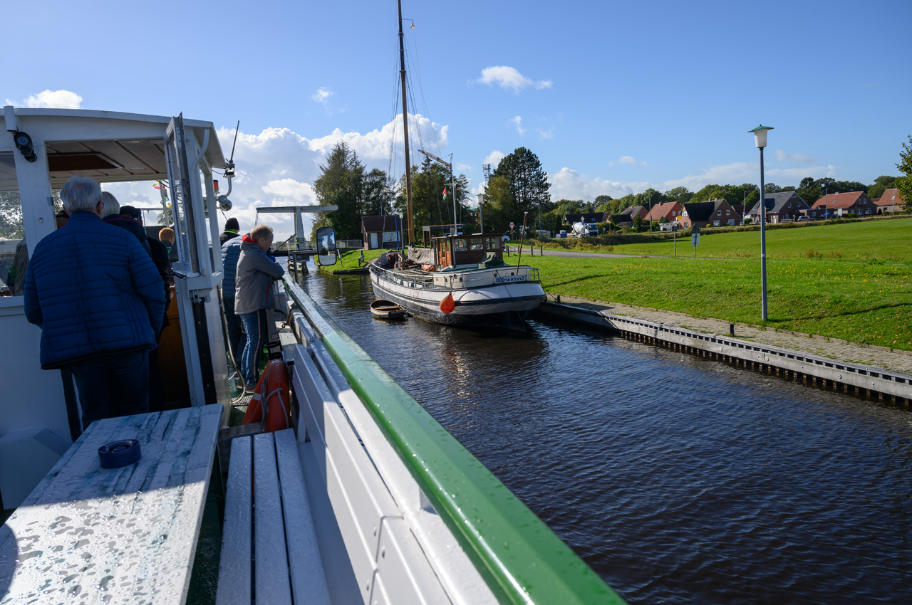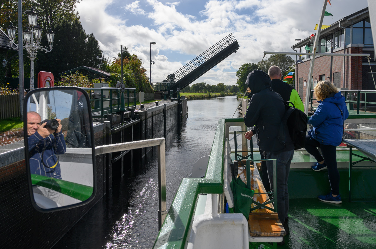 Gegen 13:30 Uhr haben wir uns auf dem Weg zum Hafen gemacht und sind an Bord der MS Aurich gegangen. Wir haben mit ihr eine Fahrt auf dem Jade-Ems-Kanal gemacht. Es ging von Aurich bis zum Hafen von Bangstede bei Ihlau. Hier sitzt die Firma Retek, der größte Lieferant Europas für gebrauchte Autoersatzteile. Sie schlachten Autos aus und verwenden die Teile für den Ersatzteilmarkt. In dem Hafenbecken hat das Ausflugsschiff gewendet und dann ging es wieder zurück. Auf der Strecke gab es eine Schleuse und 5 Klappbrücken, die geöffnet werden müssen. Ein entsprechender Mitarbeiter fuhr mit einem Fahrrad entlang dem Kanal und bediente die Brücken und die Schleuse. Bei kurzen Abständen der Brücken musste er ganz schön radeln. Als wir losfuhren, fing es an zu regnen, auch das musste er ertragen. Die Überwiegende Zeit der Fahrt hatten wir mit dem Wetter großes Glück, es gab sogar etwas Sonnenschein. Das machte die ohnehin sehr liebliche und beruhigende Landschaft noch schöner.