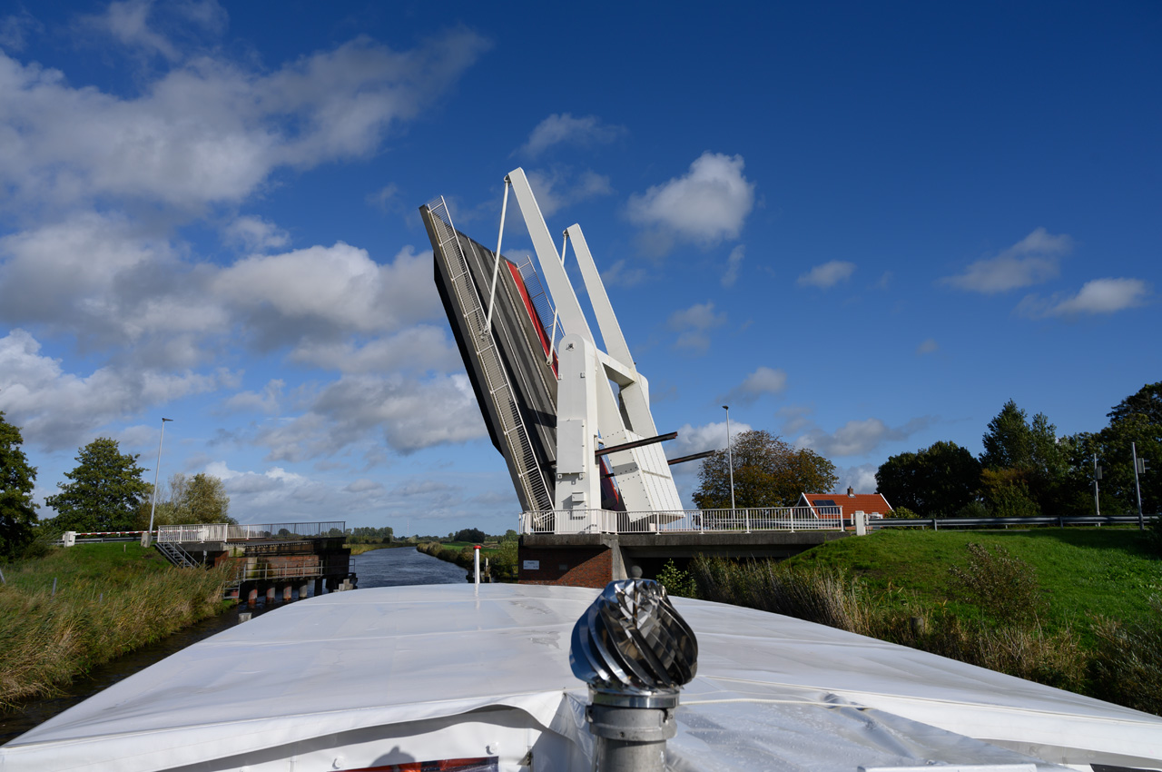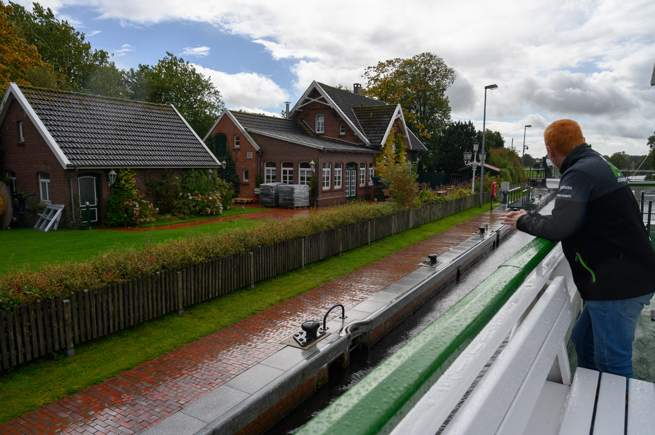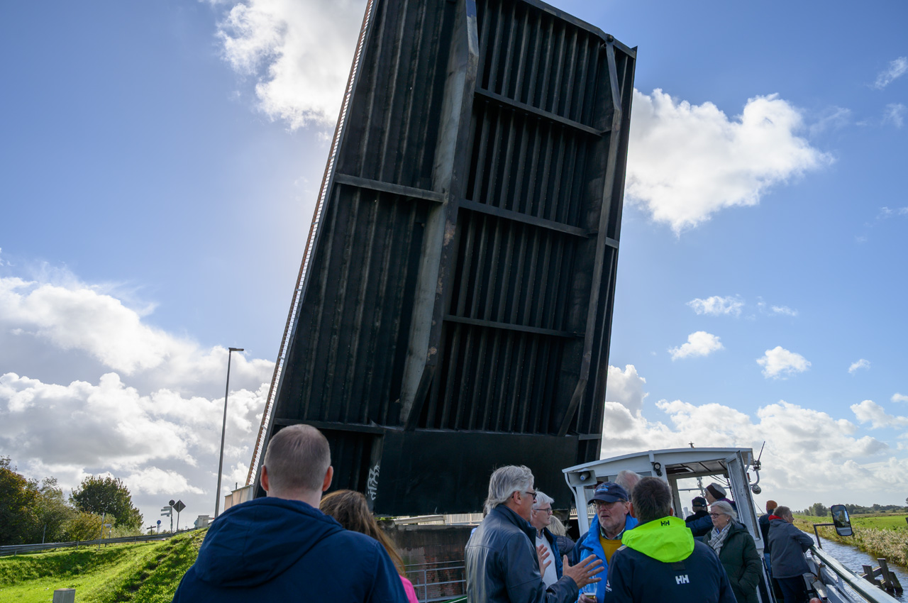 Gegen 13:30 Uhr haben wir uns auf dem Weg zum Hafen gemacht und sind an Bord der MS Aurich gegangen. Wir haben mit ihr eine Fahrt auf dem Jade-Ems-Kanal gemacht. Es ging von Aurich bis zum Hafen von Bangstede bei Ihlau. Hier sitzt die Firma Retek, der größte Lieferant Europas für gebrauchte Autoersatzteile. Sie schlachten Autos aus und verwenden die Teile für den Ersatzteilmarkt. In dem Hafenbecken hat das Ausflugsschiff gewendet und dann ging es wieder zurück. Auf der Strecke gab es eine Schleuse und 5 Klappbrücken, die geöffnet werden müssen. Ein entsprechender Mitarbeiter fuhr mit einem Fahrrad entlang dem Kanal und bediente die Brücken und die Schleuse. Bei kurzen Abständen der Brücken musste er ganz schön radeln. Als wir losfuhren, fing es an zu regnen, auch das musste er ertragen. Die Überwiegende Zeit der Fahrt hatten wir mit dem Wetter großes Glück, es gab sogar etwas Sonnenschein. Das machte die ohnehin sehr liebliche und beruhigende Landschaft noch schöner.