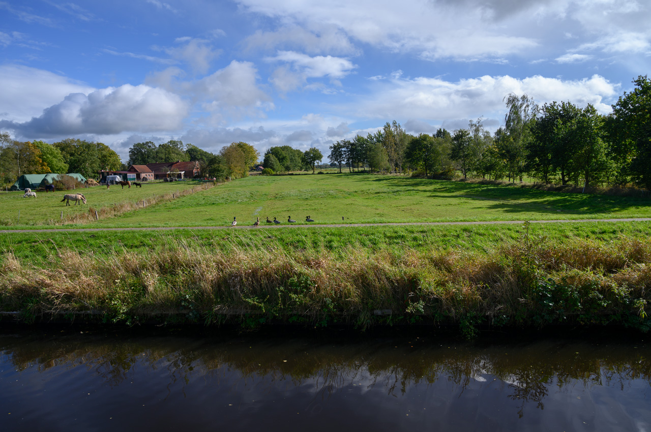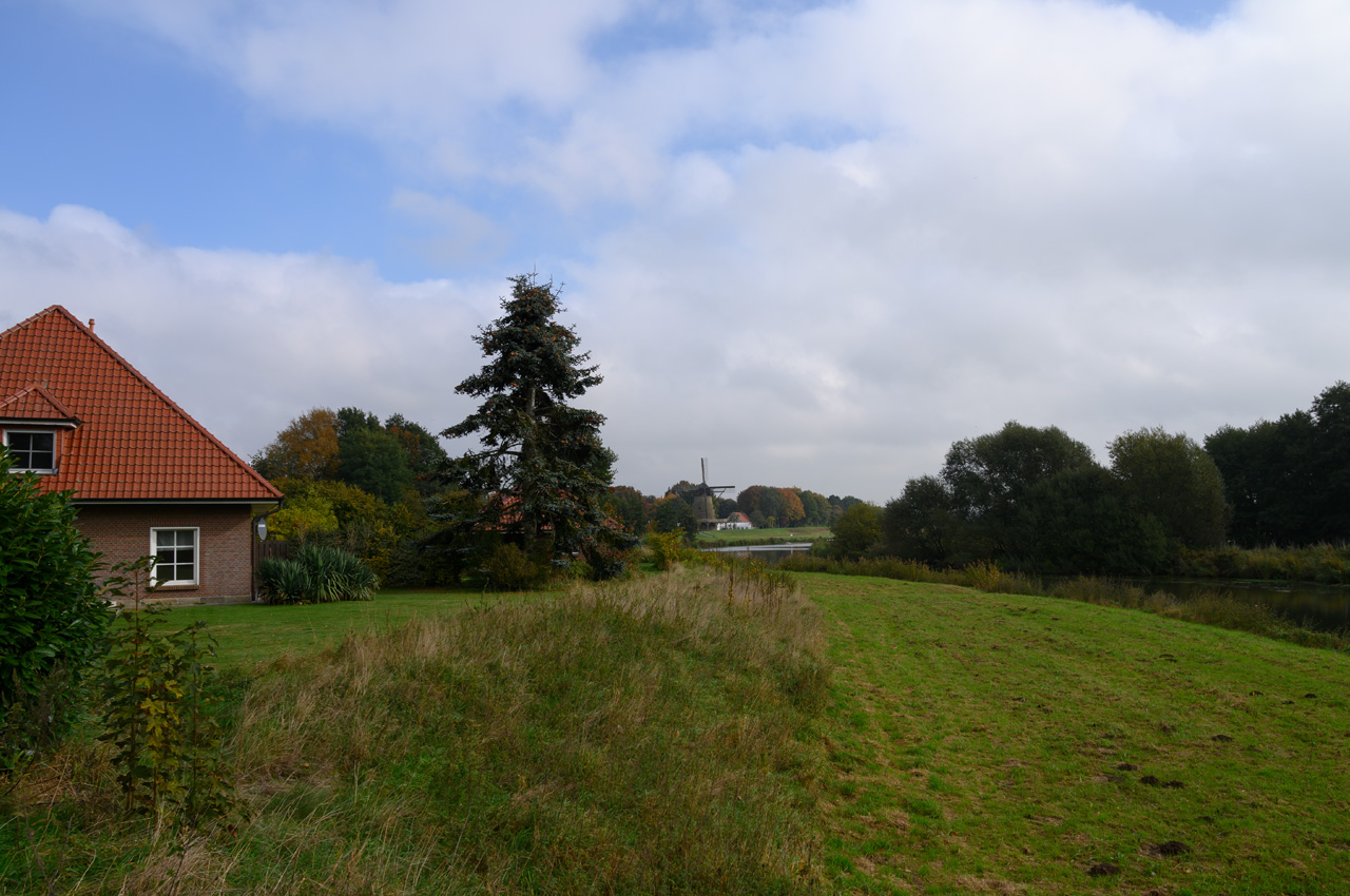 Ich habe nach dem Kaffeetrinken noch einen Spaziergang gemacht. Den Jade-Ems-Kanal in Richtung Osten und dann über Kirchdorf wieder zurück. Schöne Natur und viele schöne Einfamilienhäuser.
