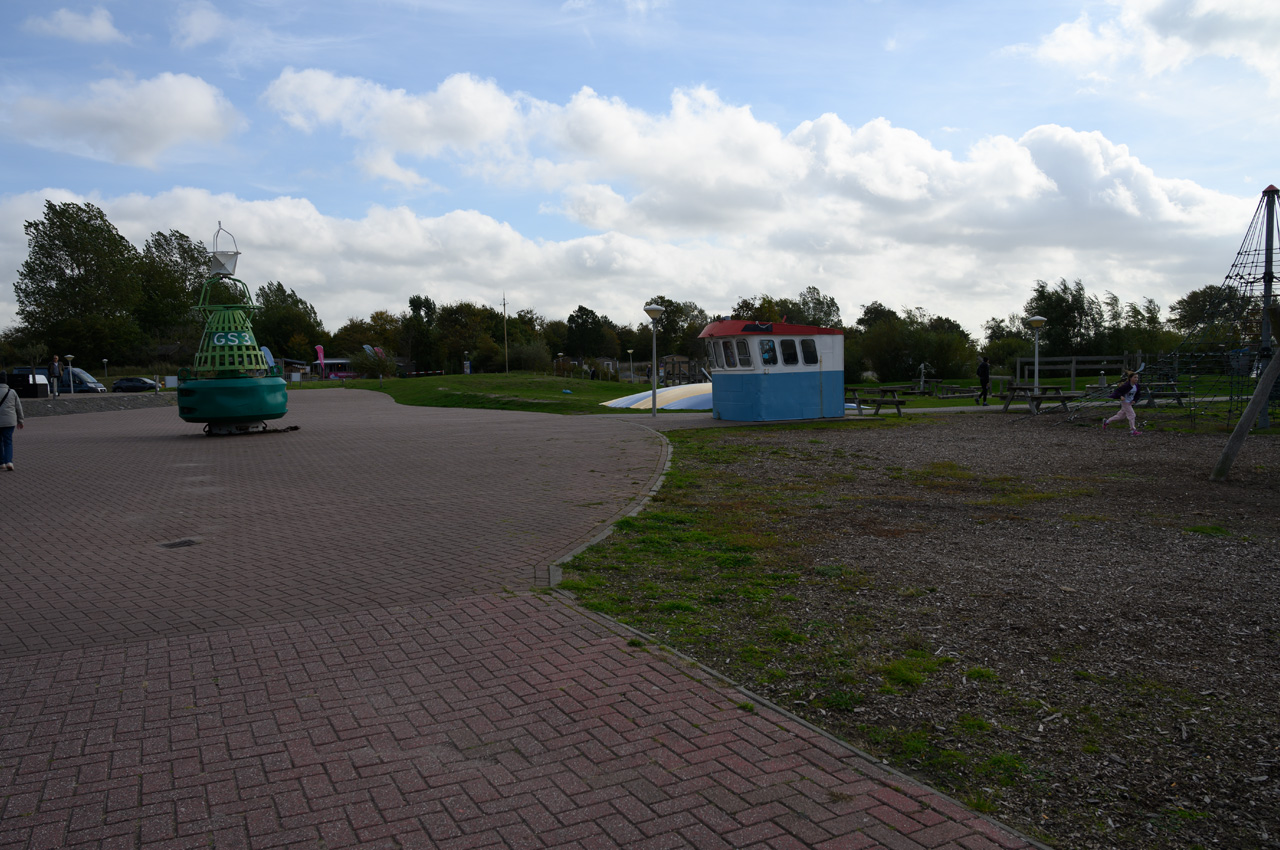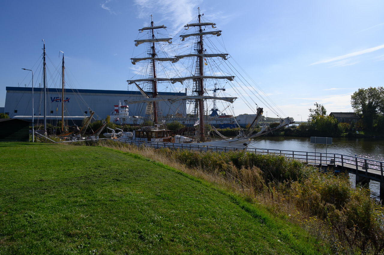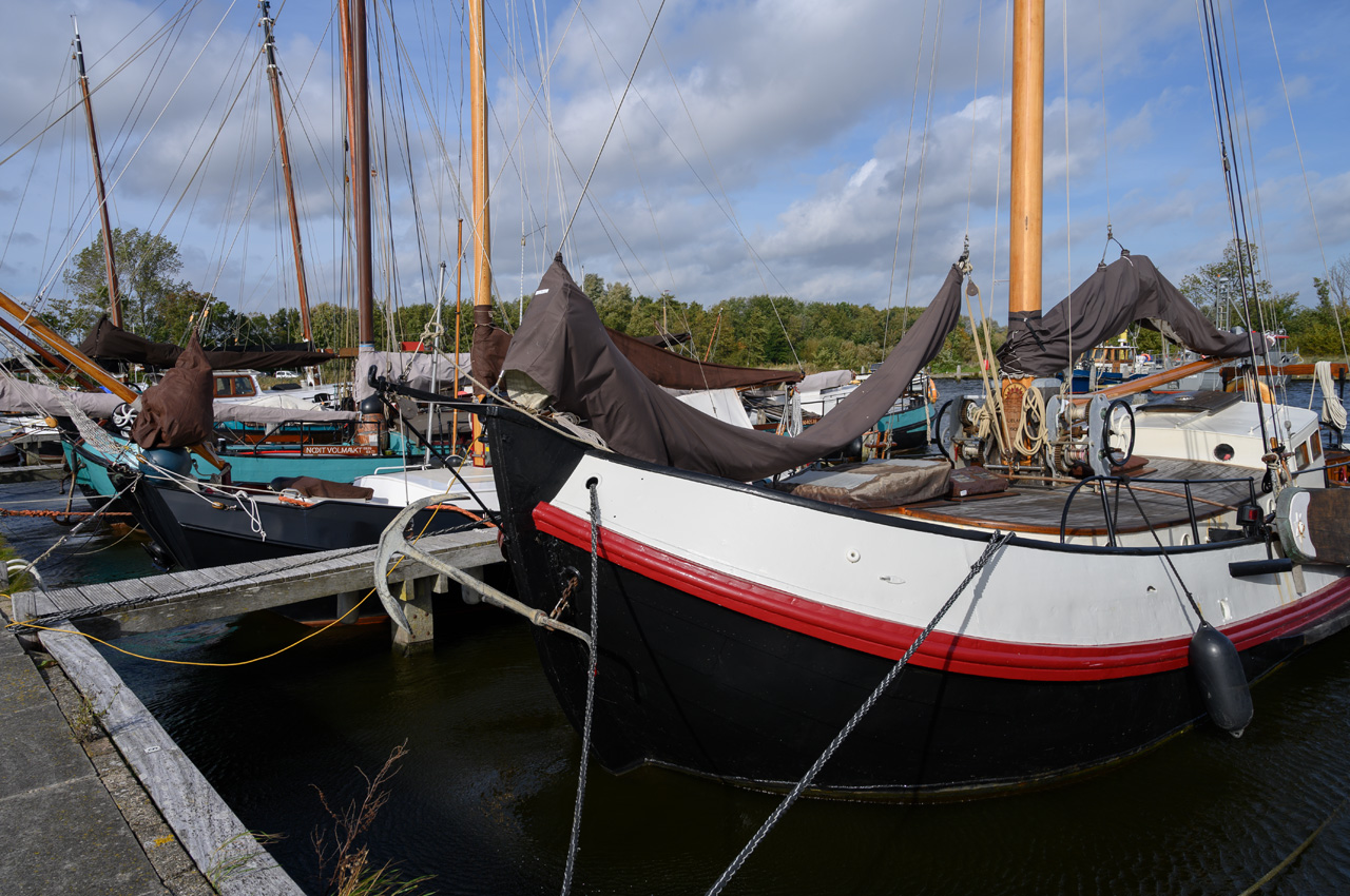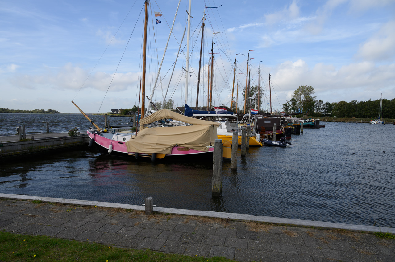 Gegen Mittag sind wir zu einem Spaziergang aufgebrochen. Wir sind einmal um den großen Yachthafen herum gelaufen und haben den hinteren Stellplatz besichtigt. Dort steht man auch mit Blick auf die Lauwersog. Die Sanitäreinrichtungen sind sehr modern und schon eher luxoriös. Der Preis ist im Normalbereich. Leider konnte ich nicht herausbekommen wie die Stromanschlüsse abgesichert sind. Von dem Yachthafen aus sind wir weiter gelaufen zu der Wochenendsiedlung. Dort gibt es einen kleinen Supermarkt. In dem hat Susanne Zimt gekauft, um aus den Äpfeln aus Gelldorf Apfelmus zu machen. Dabei haben wir erfahren, dass er ab Mitte Oktober für immer schließt. Der Besitzer hat wohl ein eher gestörtes Verhältnis zu den Betreibern der Wochenendsiedlung. Am Zugang zu der Wochendsiedlung haben wir entdeckt, dass die Wochenendhäuser auch vom Betreiber der Anlage vertrieben werden. Die Häuser haben ein fahrbares Untergestell und können transport werden. Es gab auch eine Ausstellung mit offenen Häusern. Der Preis der angebotenen Häuser lag je nach Ausstattung zwischen 50 bis 70 tausend Euro. Wir kamen richtig ins Schwärmen, weil uns die Innenausstattung sehr gut gefiel. Nach der Besichtigung waren wir noch in dem Museumshafen bevor es zu unserem Womo zurück ging.