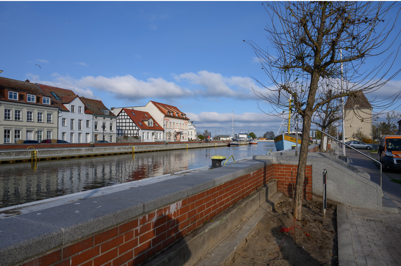 Gegen Mittag sind wir zu einer größeren Runde durch die Stadt aufgebrochen. Dieses mal erst am Stadthafen wieder entlang, aber auf der anderen Seite als gestern. Durch die Innenstadt ging es dann wieder zurück. Ich bin kurz nach dem wir im Womo waren nochmal alleine gestartet und habe eine weitere Runde gemacht. Ich bin erst etwas an der Uecker entlang gegangen, allerdings in entgegengesetzter Richtung. Dann bin ich in östliche Richtung abgebogen um schließlich dann wieder am Busbahnhof auf die Durchgangsstraße zu stoßen. Inzwischen hat der Wind komplett aufgehört zu blasen und man empfand es nicht so kalt wie gestern, was von der Außentemperatur her aber nicht stimmte.