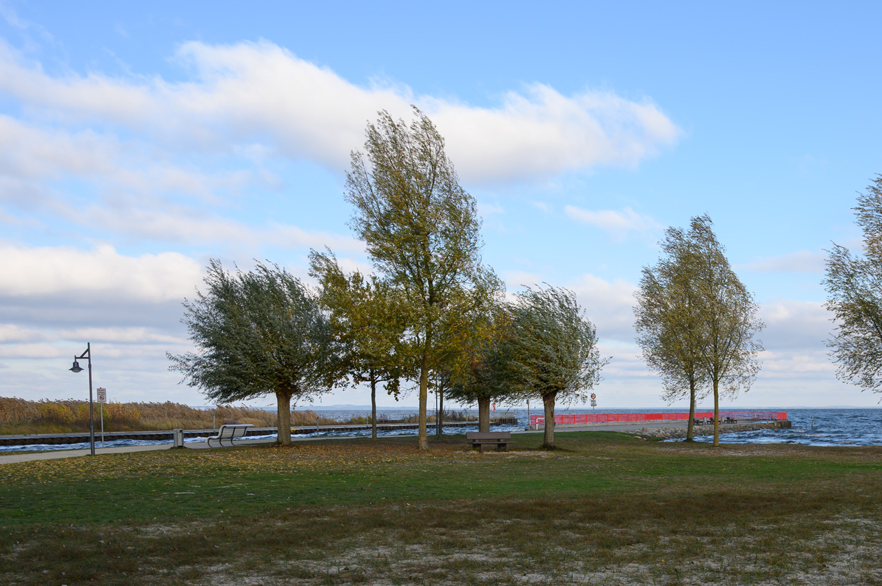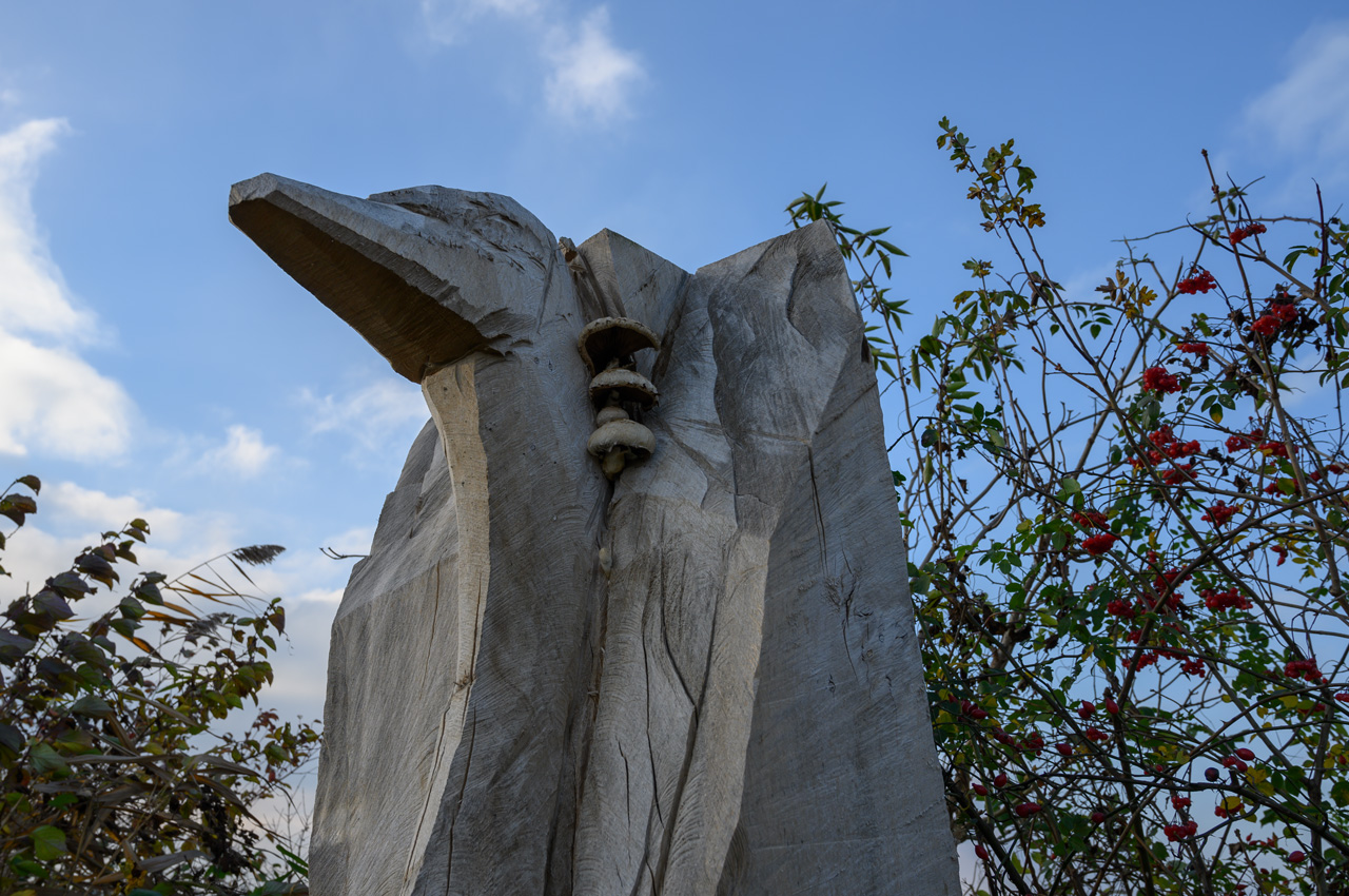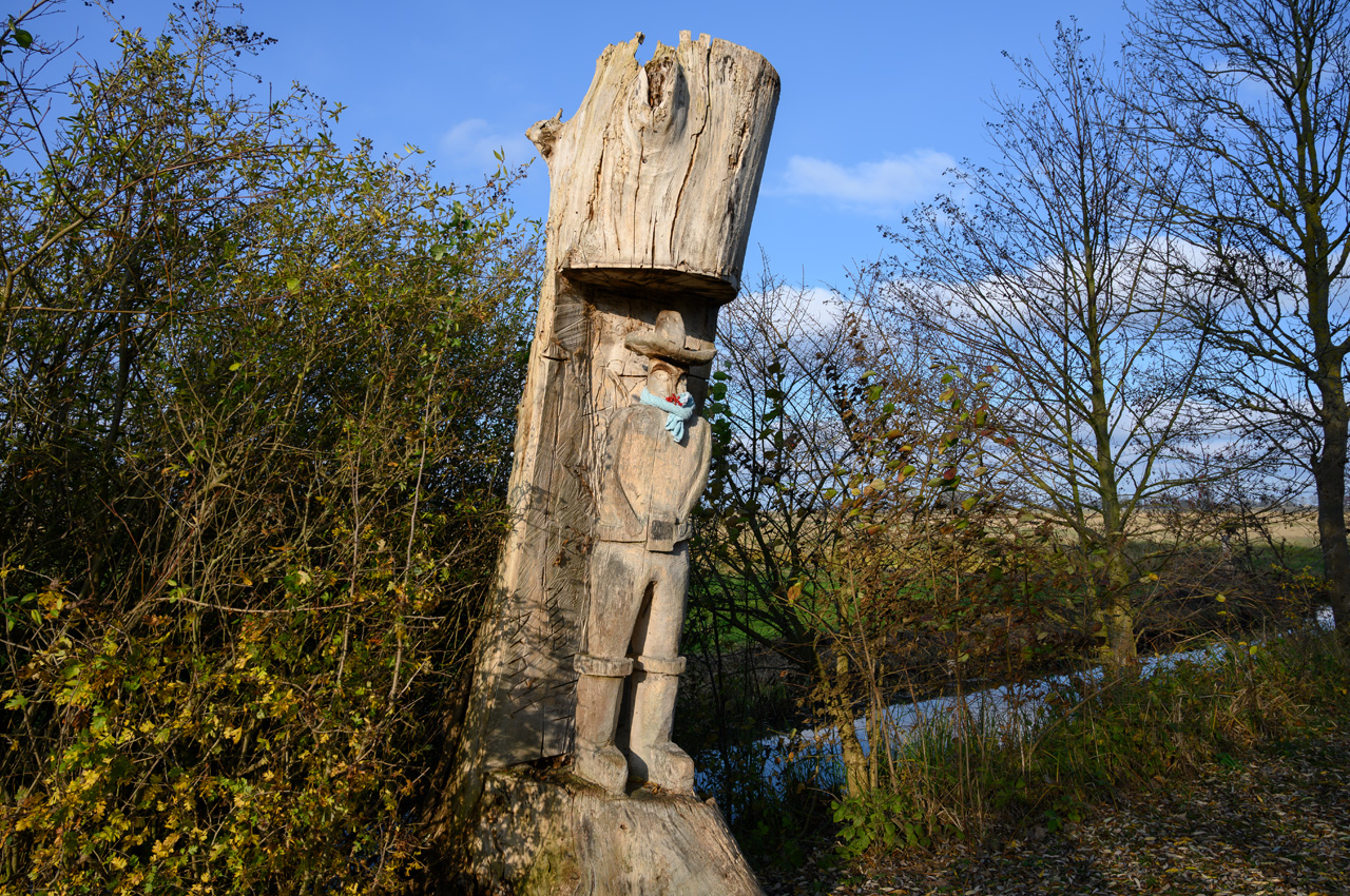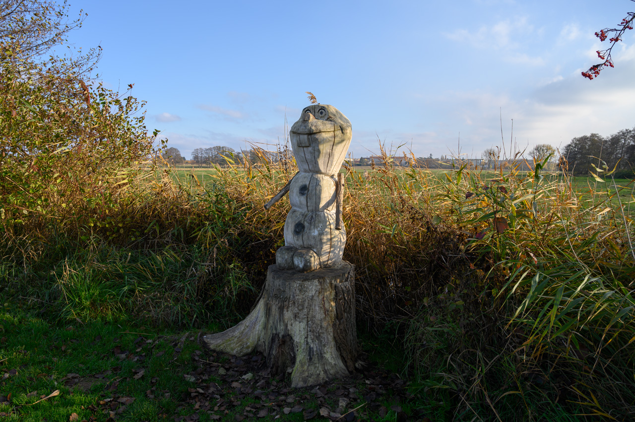 Nach dem Mittagskaffee sind wir nochmal hinaus in die Kälte gegangen. Wir wollen am alten Hafen entlang dann vor bis zur Lagunenstadt laufen. Dort einen Blick auf das Stettiner Haff zu werfen. Am Wegb dort hin entlang stehen die Kunstwerke von Holzschnitzern. Dort hat man Figuren in alte Baumstämme geschnitzt. Diese Galerie gab es schon bei unserem ersten Besuch in Ueckermünde. Die alten Baumstämme treiben teilweise an der Abschnittstelle wieder Zweige aus. Der Wind am Ufer vom Stettiner Haff blies nun noch unangenehmer und das Haff hatte eine ziemliche Welle. Dem Wetter entsprechend war die Strandpromenade leer und die gastronomischen Einrichtungen eingewintert. Wir haben uns auch nicht lange aufgehalten. Einige Minuten den Anblick genießen und dann wieder schnell zurück.