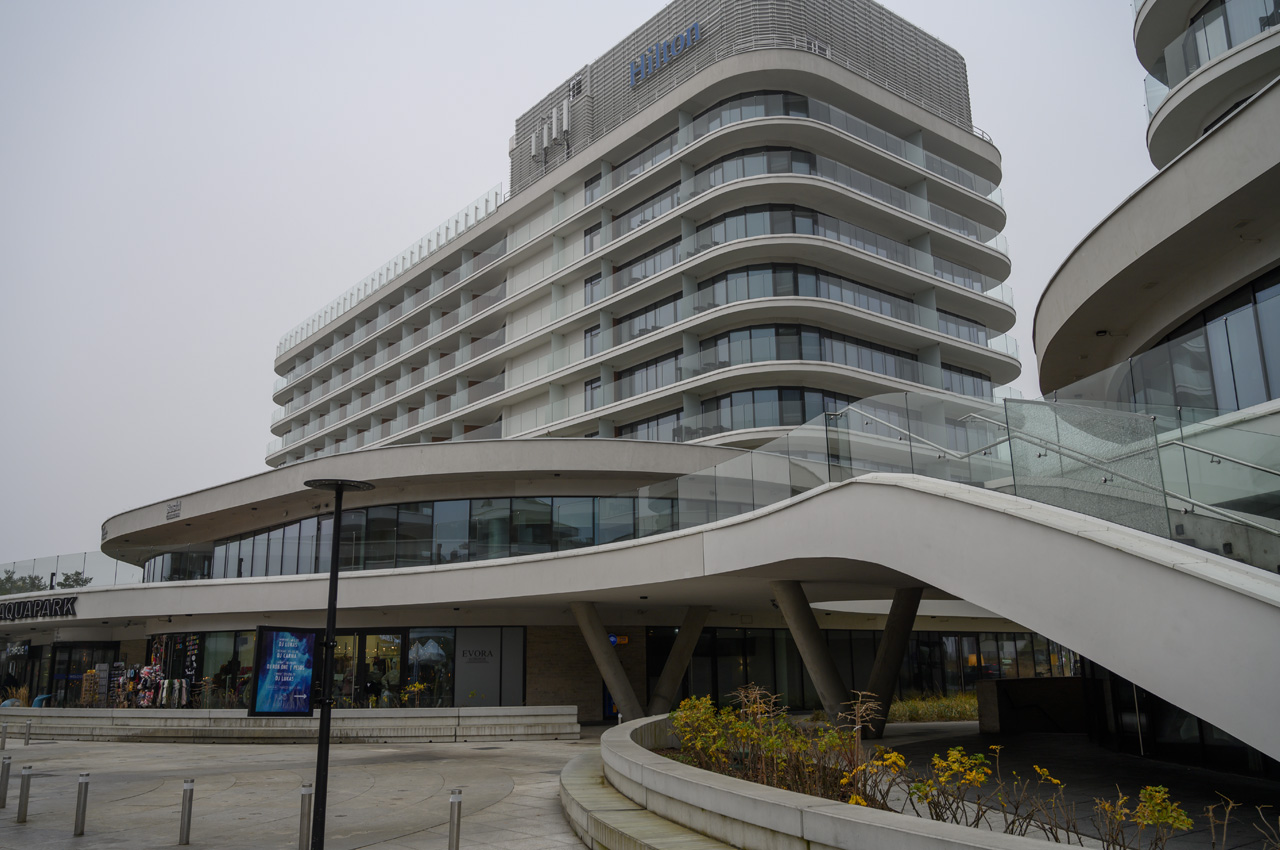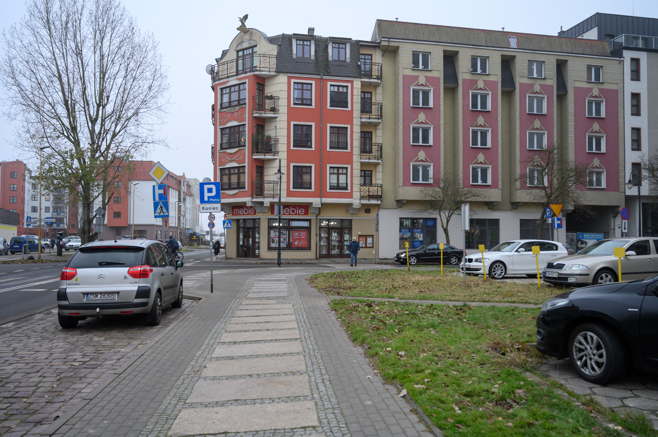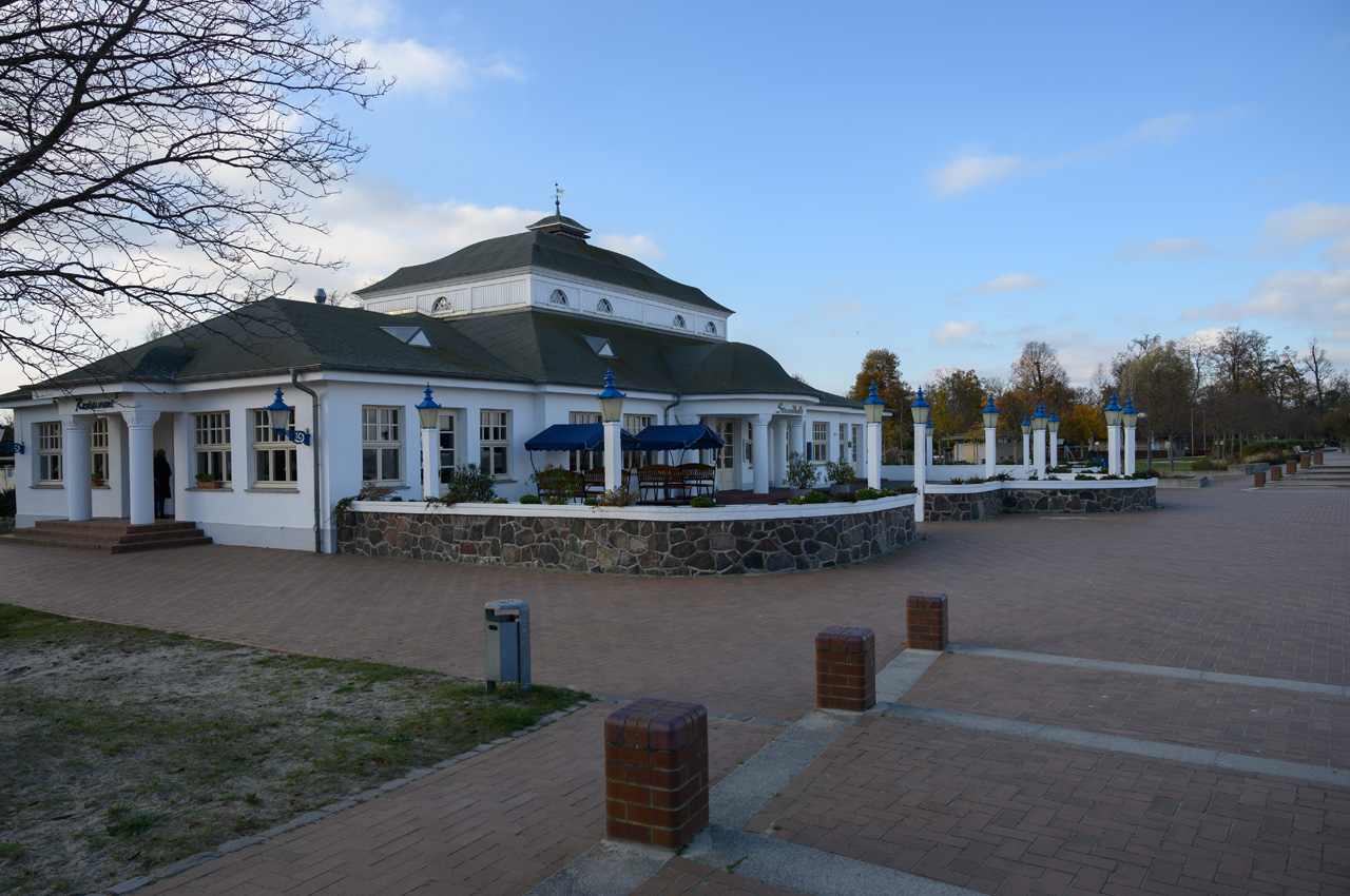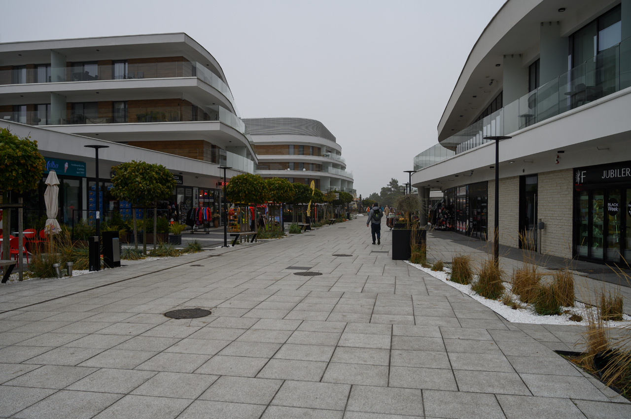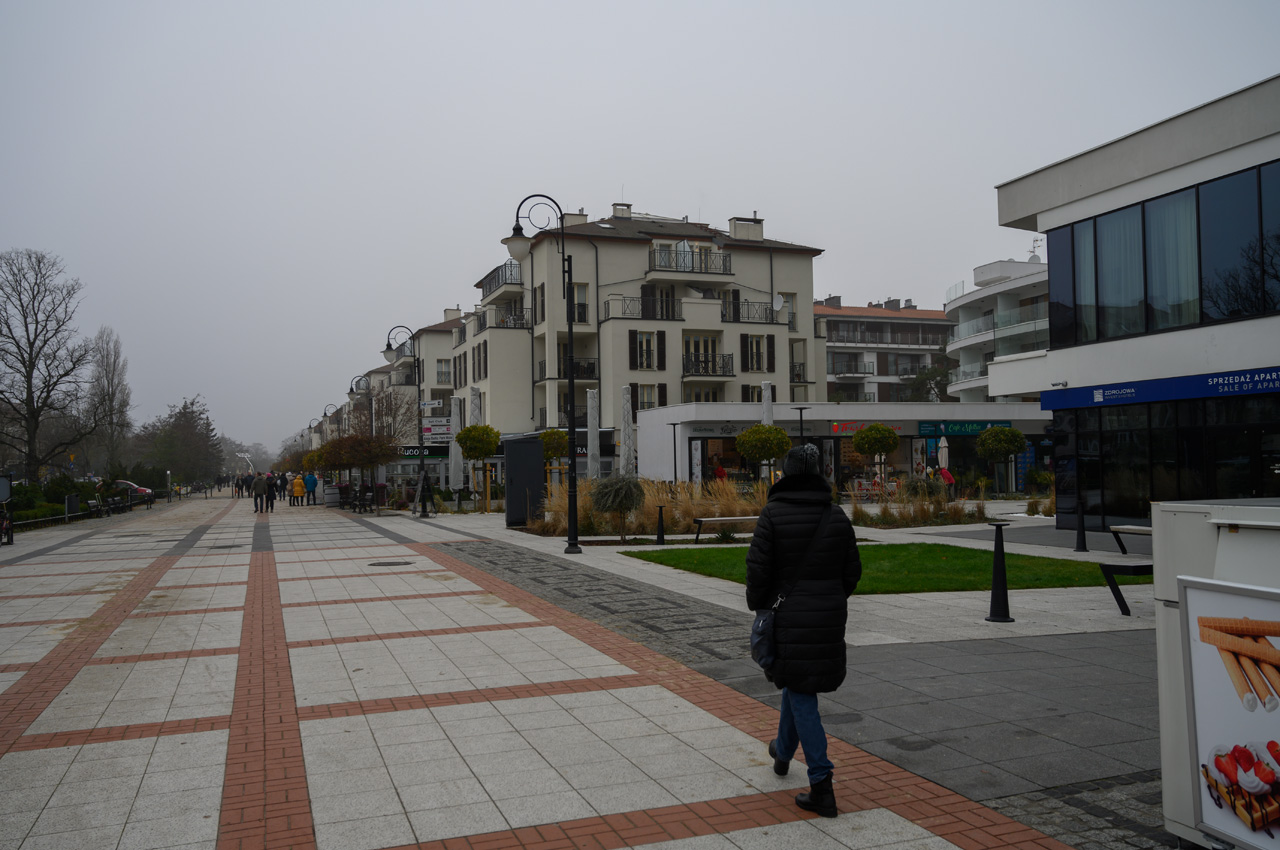 Nach unserem Zwischenkaffee habe wir uns auf den Weg in Richtung Mole gemacht, vorbei an dem Werk III der Festung Swinemünde, die sogar geöffnet war. Wir sind nur bis zu dem Leuchturm vorgelaufen, da durch den Nebel sowieso keine Sicht auf die Ostsee möglich ist. Richtung Westen ging es nun weiter zu dem neuen Swinemünde. Bevor wie die Uferpromenade erreicht haben begrüßten uns zwei sehr nobel aussehende Hotelkomplexe. Das eine davon ist ein Fünfsternehotel. Die Uferpromenade läuft durch das Neubauviertel wobei zur Strandseite hin die neusten und luxoriösesten Bauwerke stehen und auf der anderen Straßenseit die etwas älteren. Alles zusammen macht einen mondänen Eindruck und die Geschäfte unterstreichen das. Von Hugo Boss über Karl Lagerfeld usw. ist hier alles vertreten was Rang und Namen hat. Entlang der Uferpromenade reihen sie die gut besuchten Gaststätten. Auch wir haben uns für eine Einkehr in eine der vielen Gaststätten entschieden. Wir haben leckeren Käsekuchen mit jeweils einer Tasse Kaffee und das für insgesamt 12,80€ genossen. Das war eine gute Ruhepause in der wir uns auch wieder aufwärmen konnten. Durch den Kurpark, Park Zdrojowy, wo immer er den Vorsatz Kur her hat, ging es dann weiter in die Altstadt. Der Park ist auch jetzt im Winter sehr sehenswert und macht einen gepflegten Eindruck. In der Altstadt haben wir uns mit dem leckeren Kuchen, den wir bei dem gestern durchgeführten Spaziergang schon entdeckt hatten, für die nächsten zwei Tage eingedeckt. Susanne hat sich noch den Rest vom Jahresbedarf von ihren Zigaretten besorgt. Nun ging es aber auch auf kürzestem Weg zurück zum Womo.