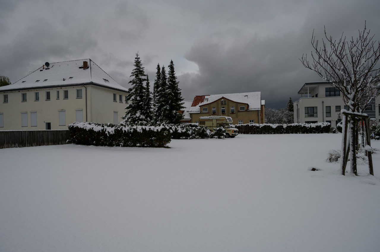 Als wir heute aufgestanden sind staunten wir nicht schlecht, welches Bild sich draußen bot. Es schneite mit riesigen Flocken und es lagen schon gute 15 cm Schnee. Eigentlich wollten wir heute weiterfahren, aber wir haben uns schnell entschlossen, das um mindestens einen Tag zu verschieben. Bis zum Mittag hat es munter weiter geschneit und nun lagen schon fast 30 cm Schnee. Das Schneien endete mit einem kräftigen Regenguß. Was für ein verrücktes Wetter.