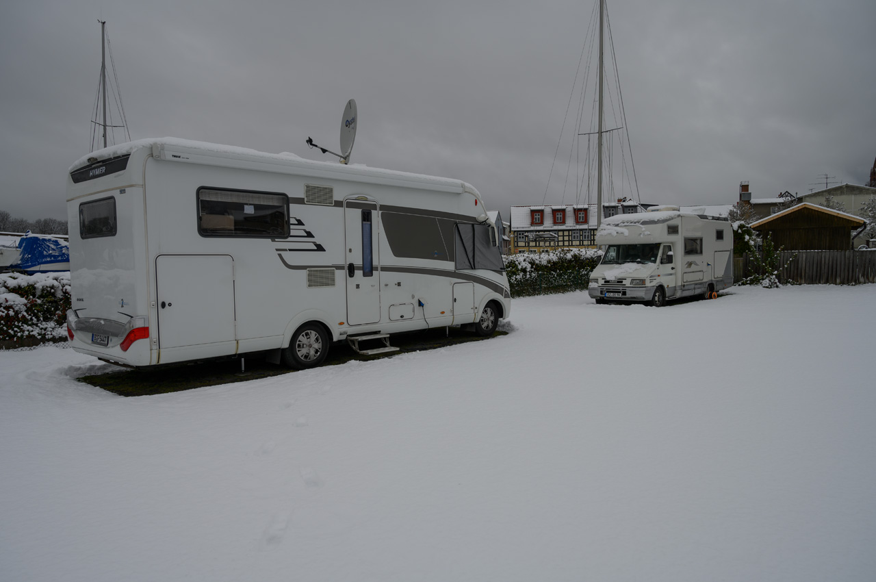 Noch einmal die frischen Brötchen vom Bäcker gegenüber. Schon während des Frühstücks kamen die Eigentümer und haben wunschgemäß das Wasser aufgedreht. Das Regenerieren unseres Womo war nicht ganz einfach, weil durch den Schnee die beiden Torflügel nicht ganz aufgingen. Dadurch hatten wir an beiden Seiten noch ganze 30cm Freiraum. Schon das Betätigen des Öffnungsschalters für Grauwasser war sehr abenteuerlich. Nach dem der Grauwassertank leer war bin ich wieder 50cm vorgefahren um an unseren Frischwasseranschluss zu kommen und um die Toilettenkassette entfernen zu können. Aber wir haben alles schadlos geschafft. Erstes Halt war beim EDEKA, Susanne hat dort das leckere Hackmet besorgt.