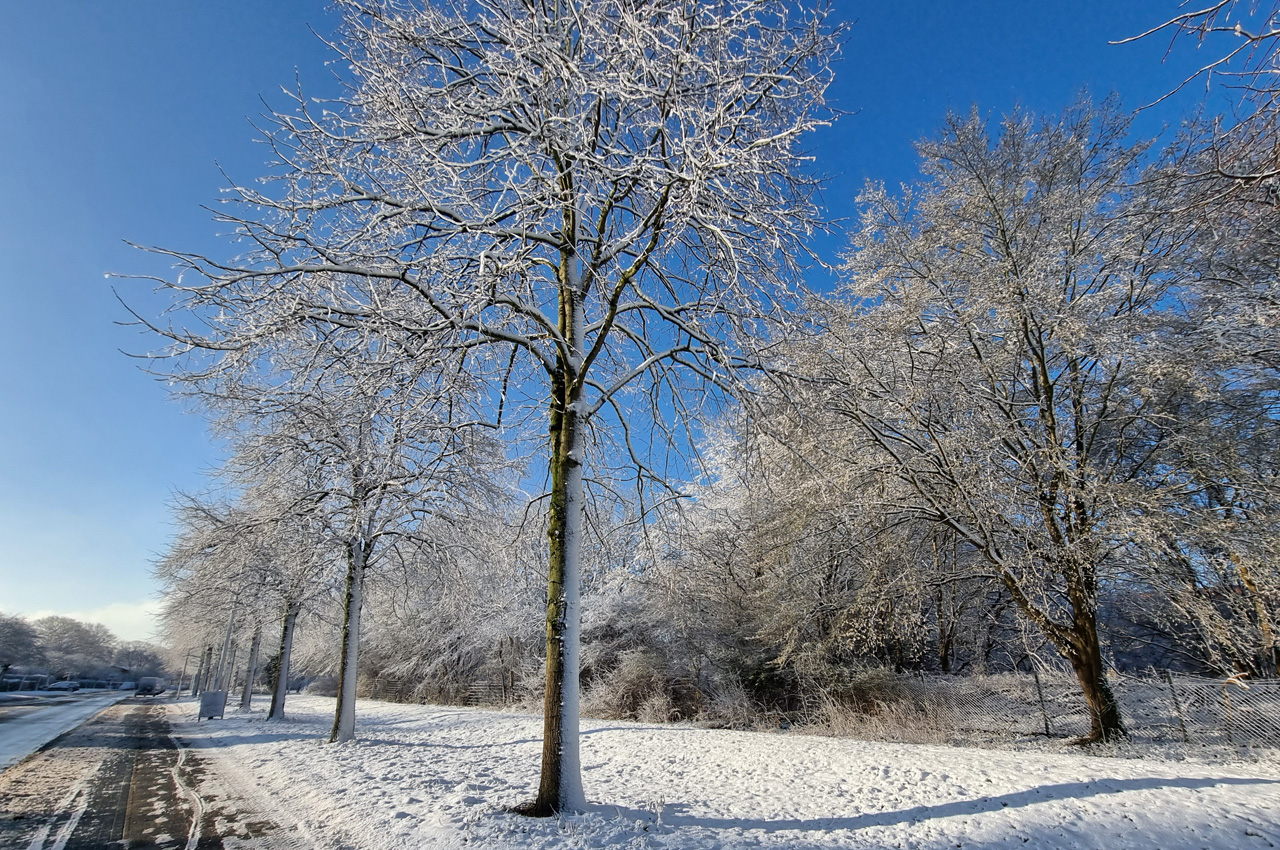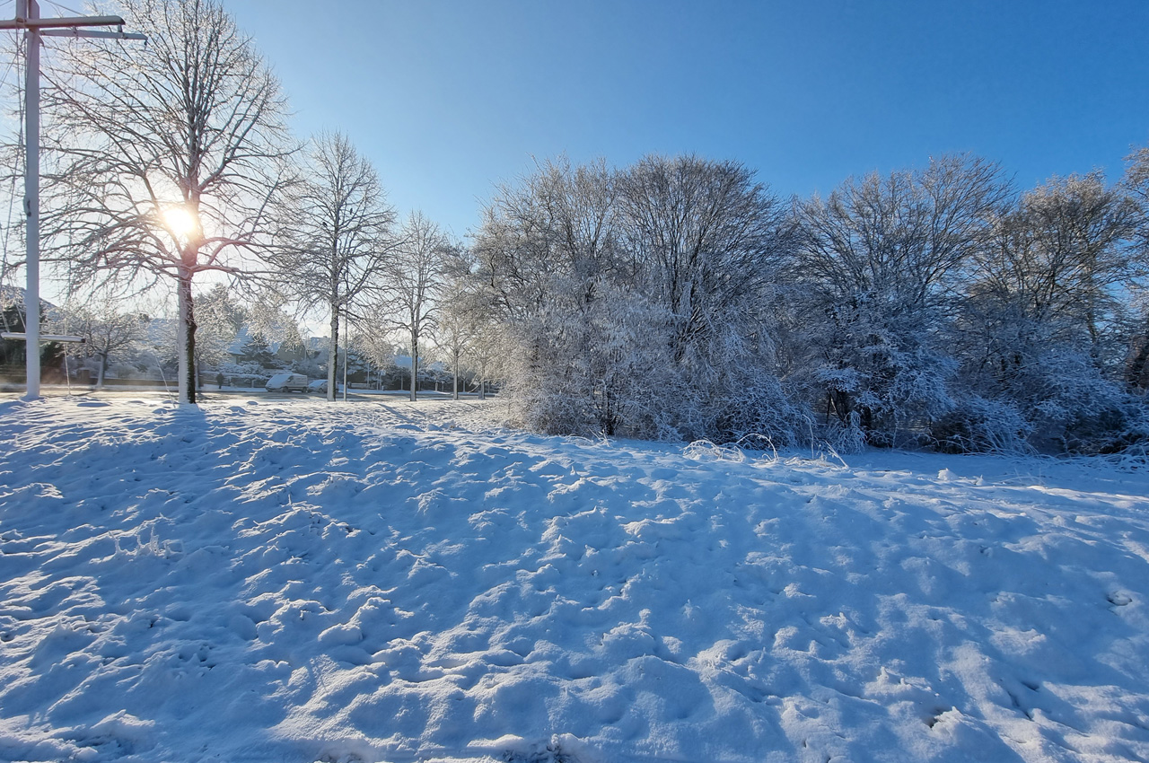 Der Schnee von gestern liegt noch. Wir haben eine durchgehende Schneedecke von ca. 5 bis 6 cm. Heute in der Nacht hatten wir -4°C, da bleibt alles liegen. Die Natur hat sich schön gemacht. Der Schnee liegt sogar auf den Zweigen von Sträuchern. Mein Weg zum Bäcker war dadurch schon fast ein Spaziergang durch eine märchenhafte Winterlandschaft.