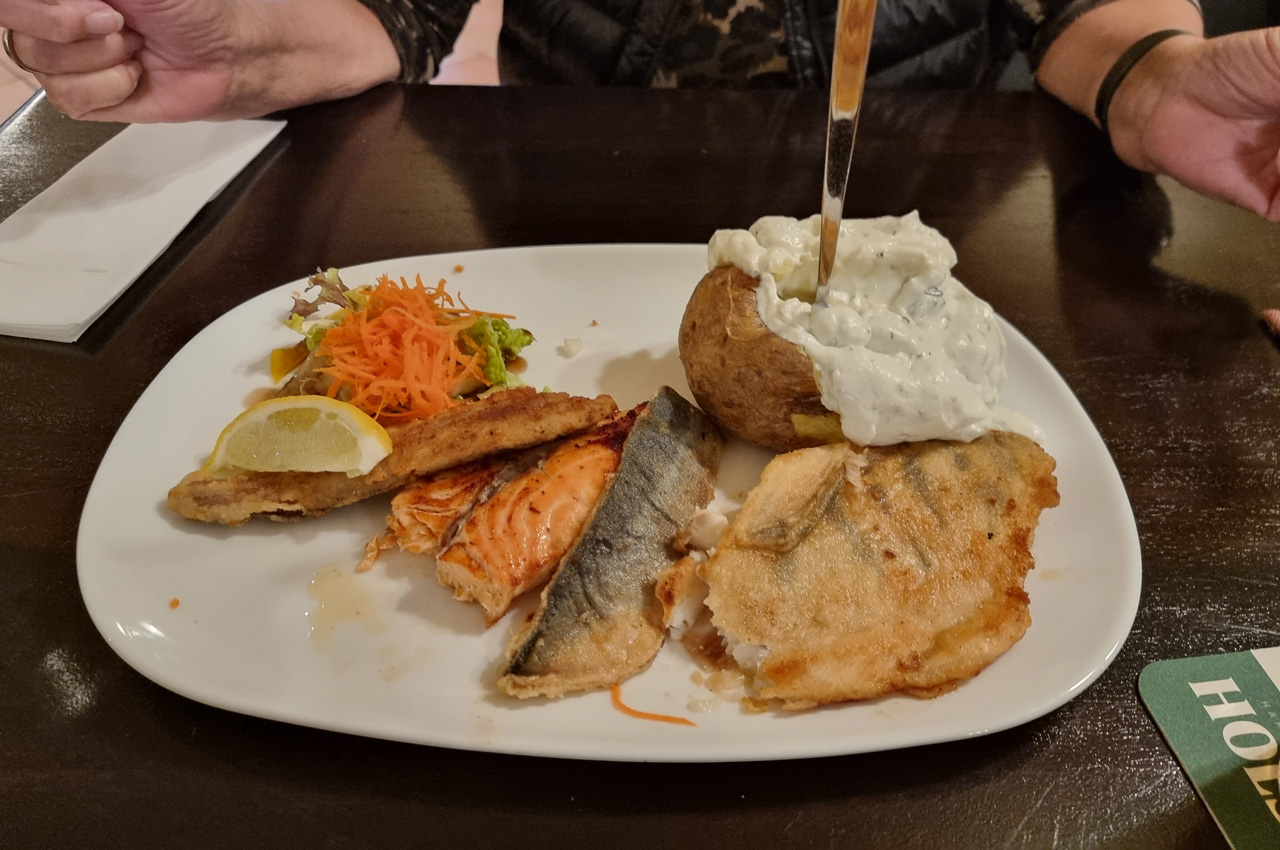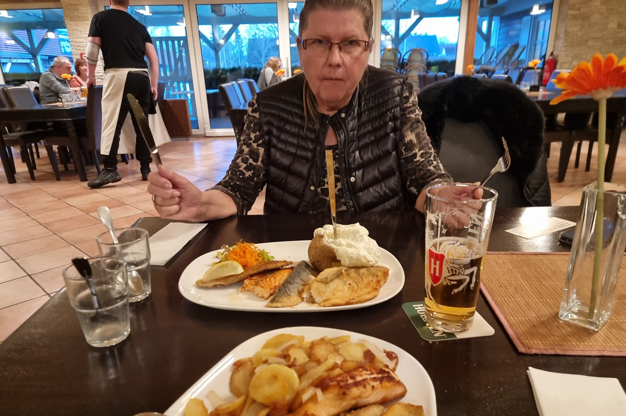 zum Abend sind wir in die Gaststätte von der Erlebniswelt gegangen und haben jeder eine Fischplatte gegessen. Susanne mit Kartoffel und Sourcreme. Die Fischplatte war sehr lecker und reichhaltig. Das Essen hier ist genau unsere Kragenweite.