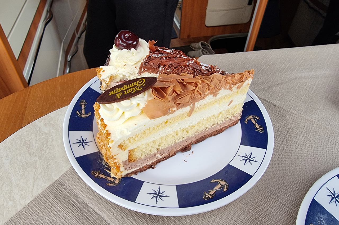 Nach einem Kaffee und meinem obligatorischen Wiener Würstel, habe ich mich nochmals auf den Weg gemacht. Mir fehlten einfach Schritte und das Wetter lockte mich in die Natur. Ich bin zur Trave gelaufen und an ihrem Ufer bis zum alten Hafen von Gothmund gegangen. Von da aus wurde es etwas abenteuerlich, da die Googlekarte die kleinen Wander- und Waldwege nicht darstellt. Nach einer kurzen Walddurchquerung landete ich wieder auf der Hauptstraße, auf der die Buslinie 12 langfährt, dass ist die Linie mit der wir immer in die Altstadt fahren. Nun bin ich diese Straße weiter gelaufen bis zur Hülshorststraße, in der auch der Stellplatz ist. Kurz vor Ankunft rief Susanne an, sie hat mich schon vermisst. Der kleine Spaziergang brachte ca. 11.000 Schritte auf meiner Fitnesuhr. Das reichte dann aber auch. Im Womo gab es einen leckeren Kaffee mit einem Stück Kuchen.