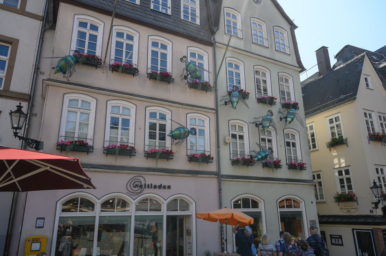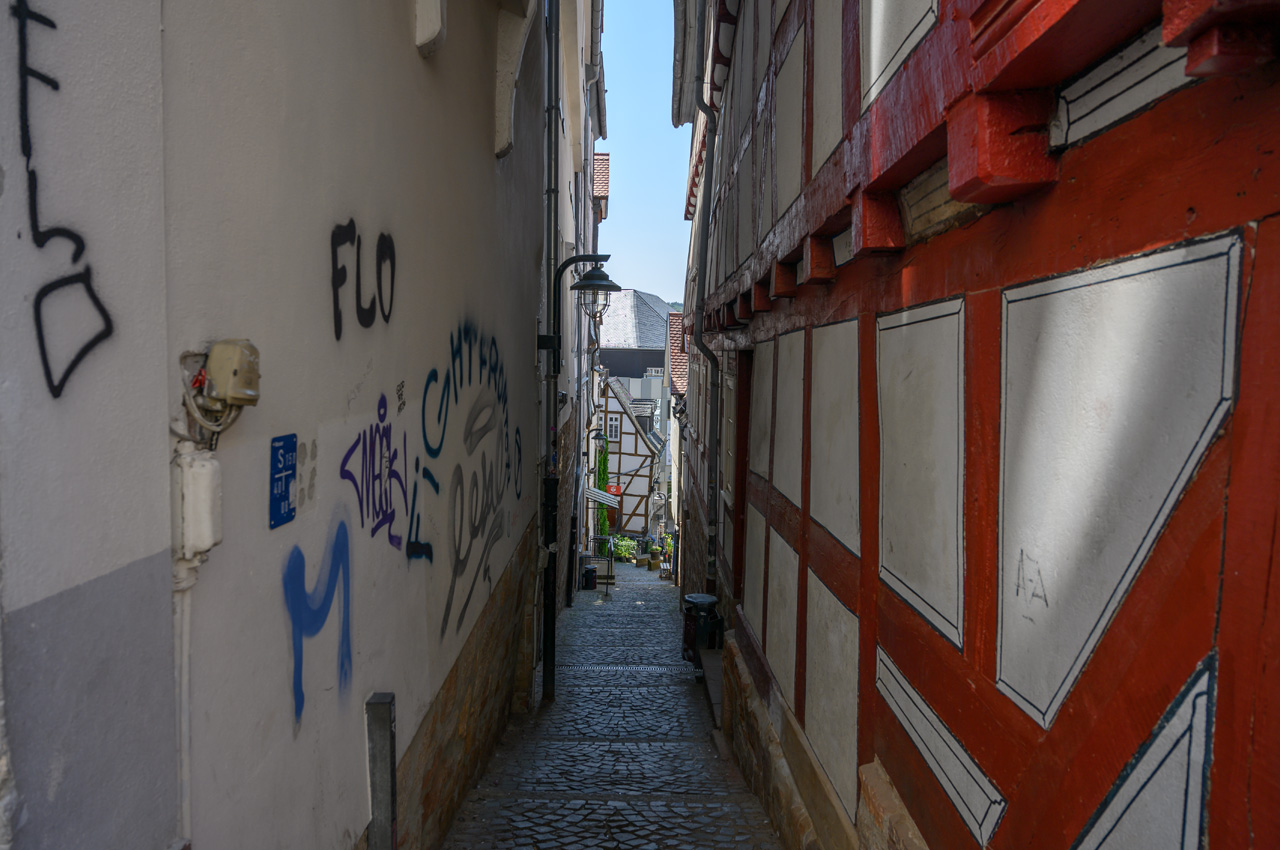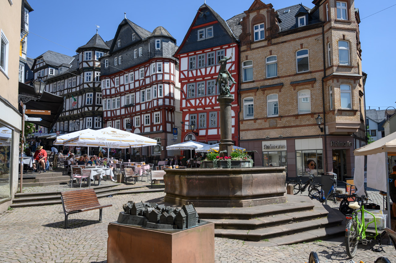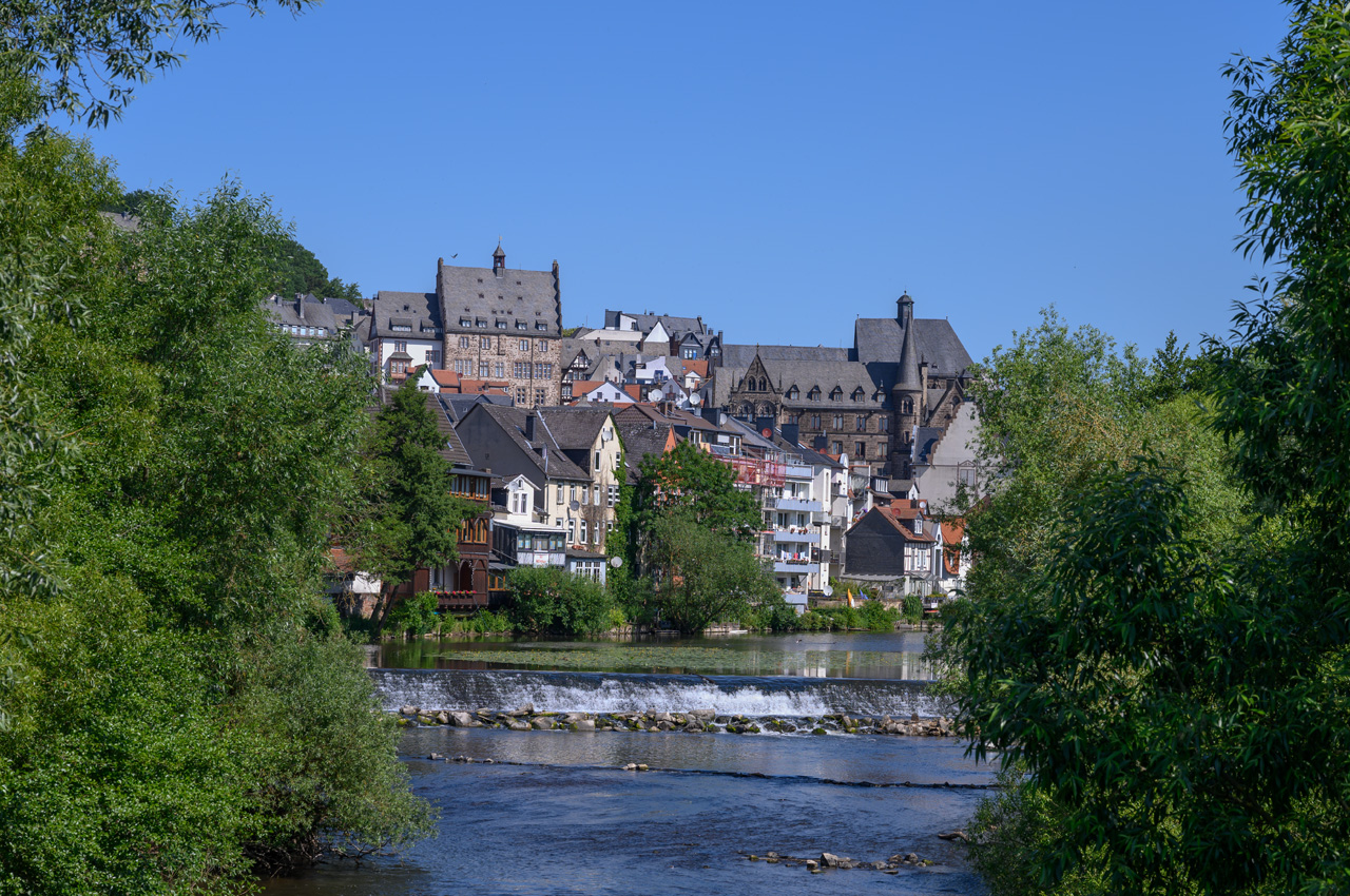 Beim Abmarsch zu unserer ersten Visite von Marburg haben wir uns auf die Touristeninfo in der Oberstadt geeinigt und nicht auf die am Bahnhof. Den Wegweisern brav folgend kamen wir an dem Erwin-Piscator-Haus an. Dort stand an der ehemaligen Eingangstür zur Touristeninfo, wir sind umgezogen. Na toll! Gut, in einem kleinen Kasten waren Stadtpläne von Marburg. So konnten wir uns wenigsten anhand der angegebenen Adresse neu orientieren. Jetzt ging es gnadenlos, sehr zur Freude von Susanne, Gasse für Gasse nach oben. Diese Stadt ist definitiv nichts für alte Leute. Aber mit ihren über 26.000 eingeschriebenen Studenten ist Marburg wohl auch eher eine Stadt der Jugend und denen macht der Anstieg offensichtlich nicht so viel aus wie uns. In der Nähe des Marktplatzes haben wir dann auch die Touristeninfo gefunden. jetzt konnten wir auch besser die Schönheit der Stadt genießen, ohne Zielstress. Also sind wir relativ gemütlich über Neustadtstraße und Steinweg wieder abgestiegen. Die Pilgrimstein Straße ging es dann zurück zur Lahn. Dort haben wir sogar einen Schäfers Bäcker entdeckt, bei dem ich morgen früh unsere Brötchen besorgen kann. Von hier aus sind es ca. 700 Meter bis zum Womo. Es begann das Relaxen für den Rest des Tages. Ich hatte ja auch schon wieder über 12.000 Schritte zusammen.