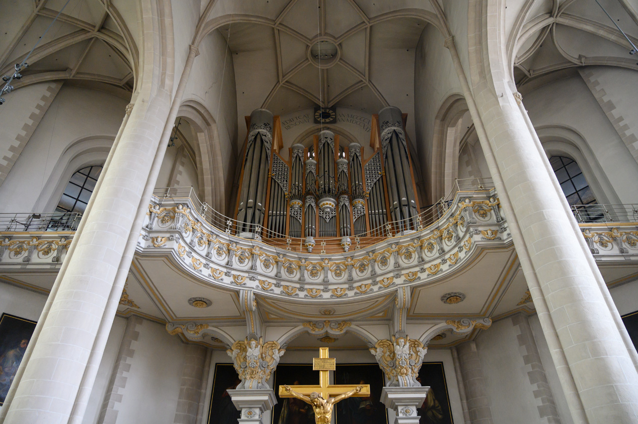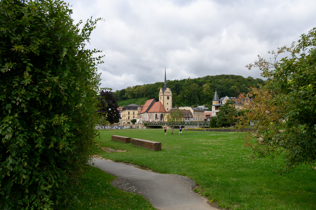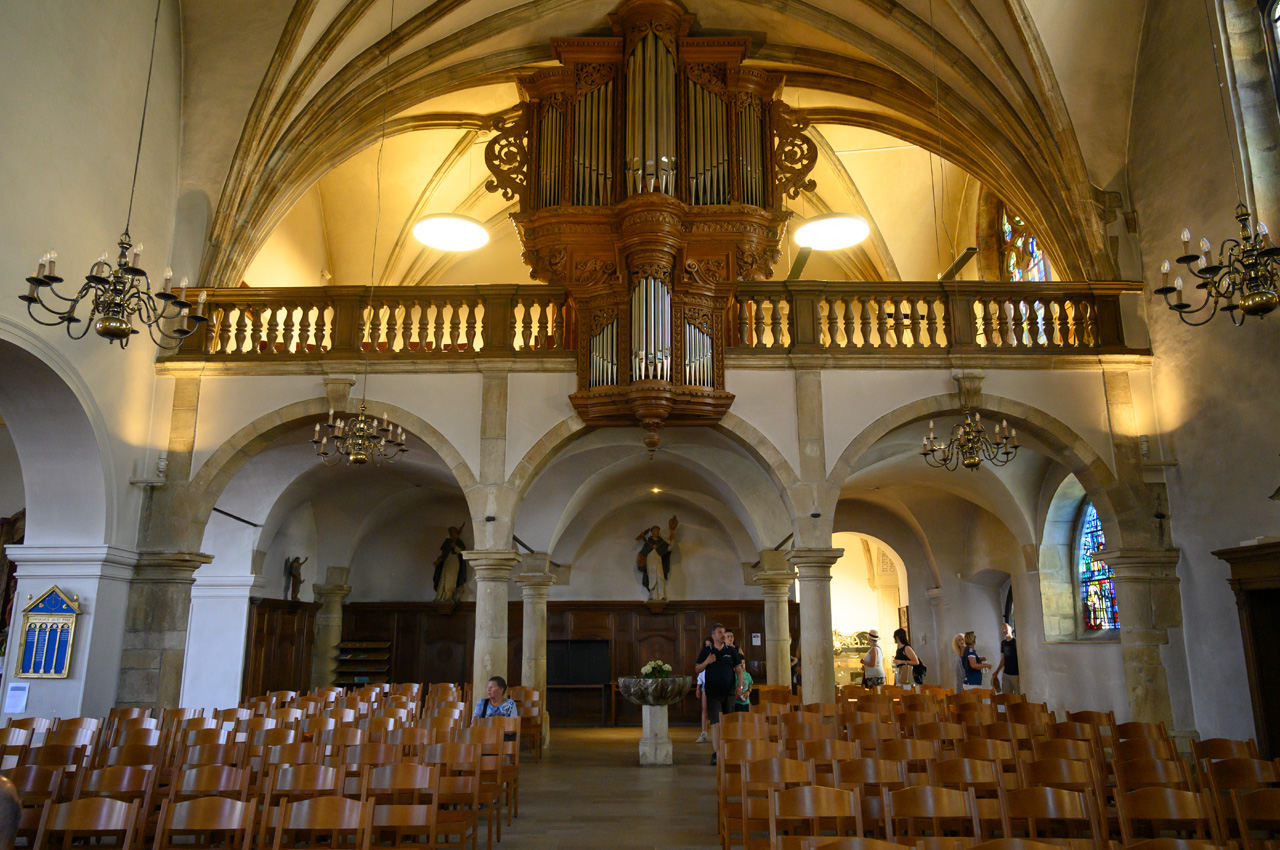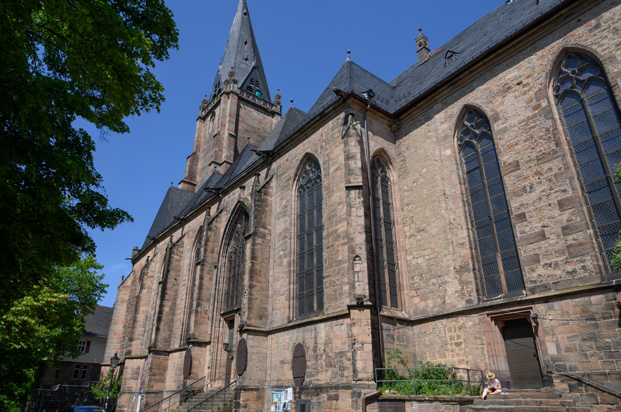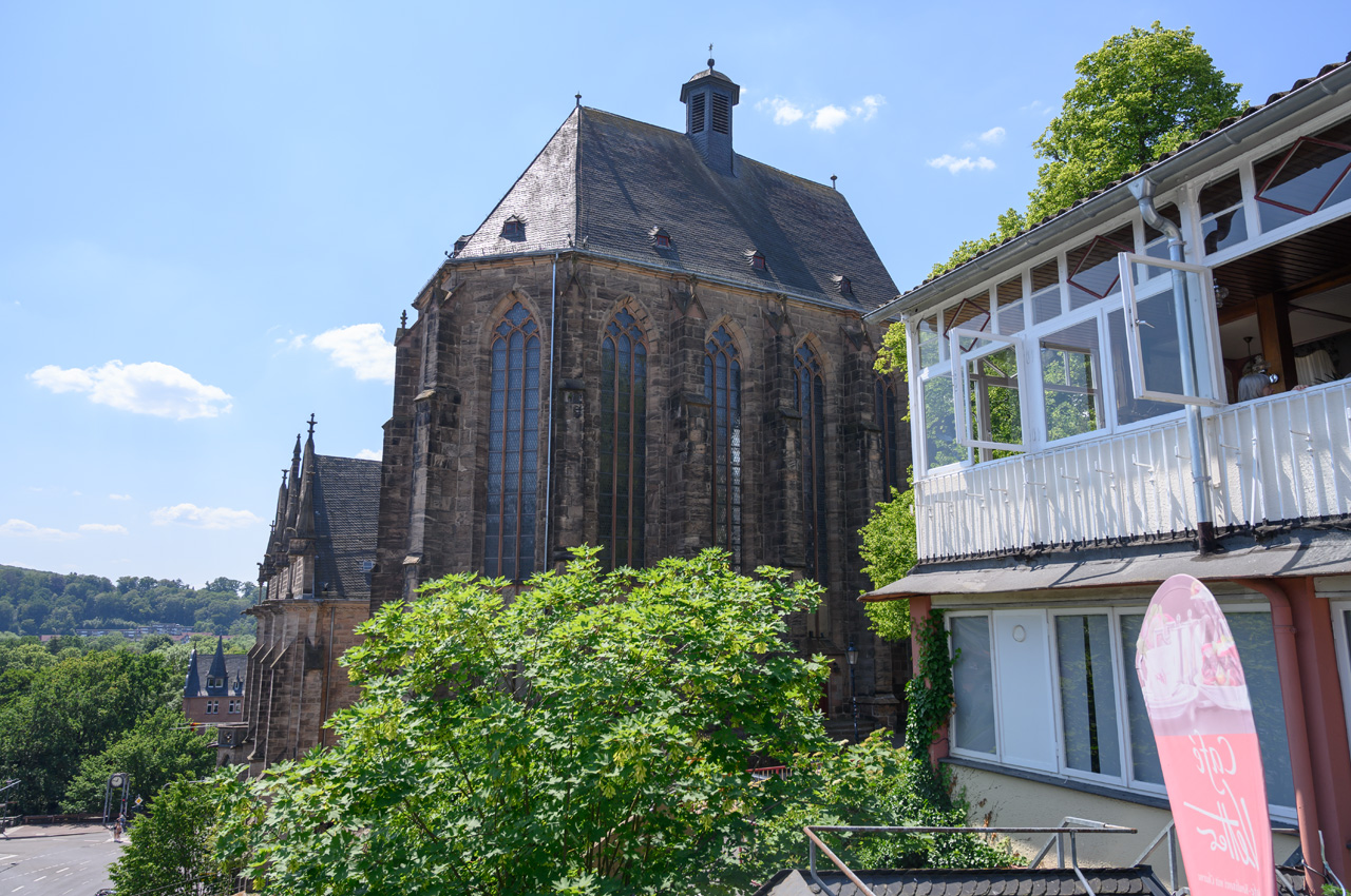 Wir sind wieder in die Altstadt gelaufen und mit dem Aufzug in die Oberstadt gefahren. Dieses mal haben wir uns etwas intensiver mit den Bauten um den Marktplatz herum beschäftigt. Vom Marktplatz aus ging es langsam die Barfüßerstraße wieder hinab. Am Plan sind wir dann wieder aufwärts zur Kugelkirche gegangen. In der Kugelkirche fand gerade eine Taufe statt. Nach anfänglichem Zögern haben wir gemerkt der Akt kann noch etwas länger dauern und sind dann doch in die Kirche hineingegangen. Die Kirche ist sehr eigenwillig aufgeteilt. Baulich hat sie nichts mit einer Kugel zu tun. Den Namen Kugelkirche hat sie durch die Mönche bekommen, deren Kopfbedeckung einer Kugel ähnelte. Von da aus sind wir noch ein wenig höher gestiegen zur Lutherischen Pfarrkirche St. Marien. Hier waren wir gestern schon, ich bin aber allein noch mal hineingegangen, um zu fotografieren. Susanne hat in der Zwischenzeit die Aussicht von der Terrasse der Kirche genossen. Vorbei an dem Hochzeitshaus ging es wieder etwas tiefer zu dem Marktplatz. Von da aus sind wir wieder in die Wettergasse gegangen. An ihrem Ende hatte Susanne gestern im Internet ein italienisches Eiscafe entdeckt. Das hat Susanne aber gar nicht gefallen, also haben wir beschlossen, heute wieder eisfrei zu bleiben. Über den Steinweg sind wir wieder auf Lahnhöhe abgestiegen. Am Ende gibt es die St. Michaeliskapelle. Wir haben aber keinen Weg ohne Treppen zu steigen gefunden. Da ich Susanne nicht schon wieder zumuten wollte Treppen zu steigen, haben wir bechlossen die Kapelle auszulassen. Über die Pilgrimstein sind wir wieder zurück bis zu dem Aufzug und sind mit ihm wieder in die Oberstadt gefahren. Dieses mal sind wir aber in die entgegengesetzte Richtung vom Marktplatz gelaufen. Schon nach wenigen Metern Fußweg haben wir entdeckt, dass ihre die Gaststätten mit den Terrassen mit Lahnblick sind. In ein Cafe, was auch Eis angeboten hat sind wir dann eingekehrt. Bei einem herrlichen Blick auf Marburg im Lahntal, haben wir einen Eiskaffee genossen. Das war lecker und wir konnten hier den Ausblick genießen. Beim weitern Abstieg, sind wir in die Universitätskirche gegangen. Auch das ist eine sehr ungewöhnliche Kirche. Die große Orgel ist hinter dem Altar in luftiger Höhe. Die Kirche ist generell sehr hoch. Das Kirchenschiff hat eine reich verzierte Holzdecke. Die gesamte Farbgestaltung der Kirche ist sehr dunkel, wodurch sie düster wirkt, obwohl sie eigentlich genügend Tageslicht bekommt. Nachdem wir noch das altehrwürdige Startgebäude der Philipps Universität bewundert haben, ging es über die Universitätsstraße ein kleines Stück zur Kaiserpassage. Dort hat sich Susanne bei Deichmann leichte Schlappen für den Aufenthalt vor dem Womo gekauft. Entlang der Lahn ging es wieder zurück zum Womo. Jetzt war Relaxen angesagt.