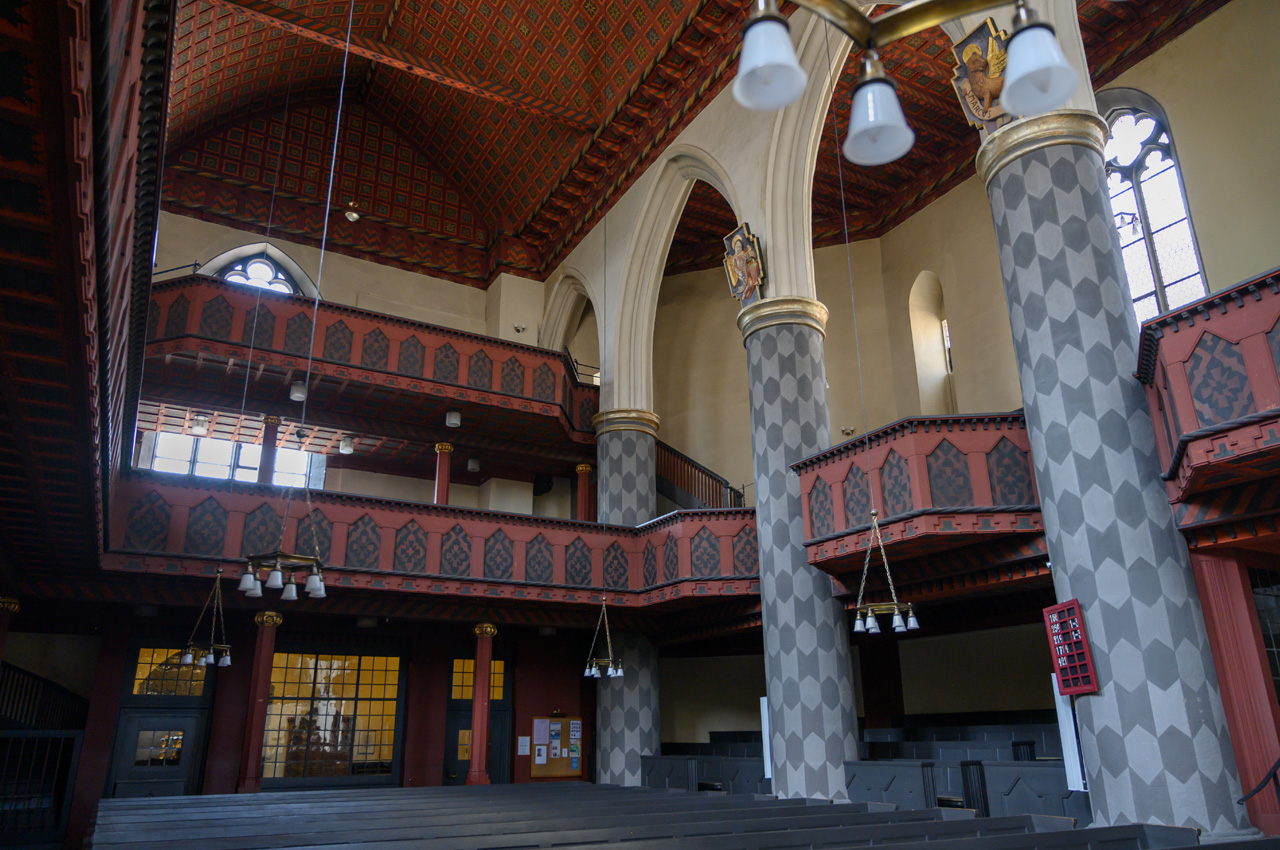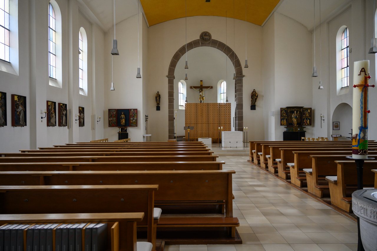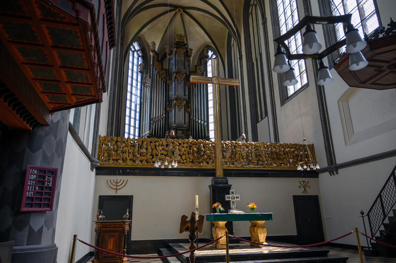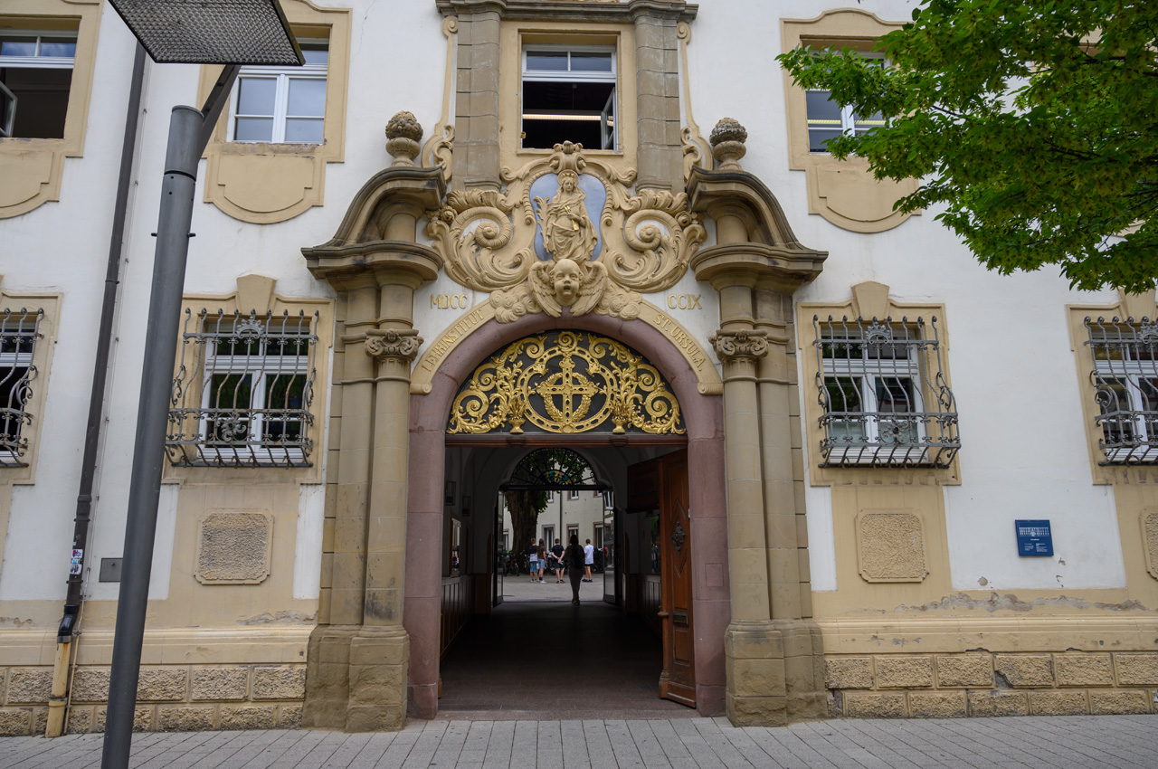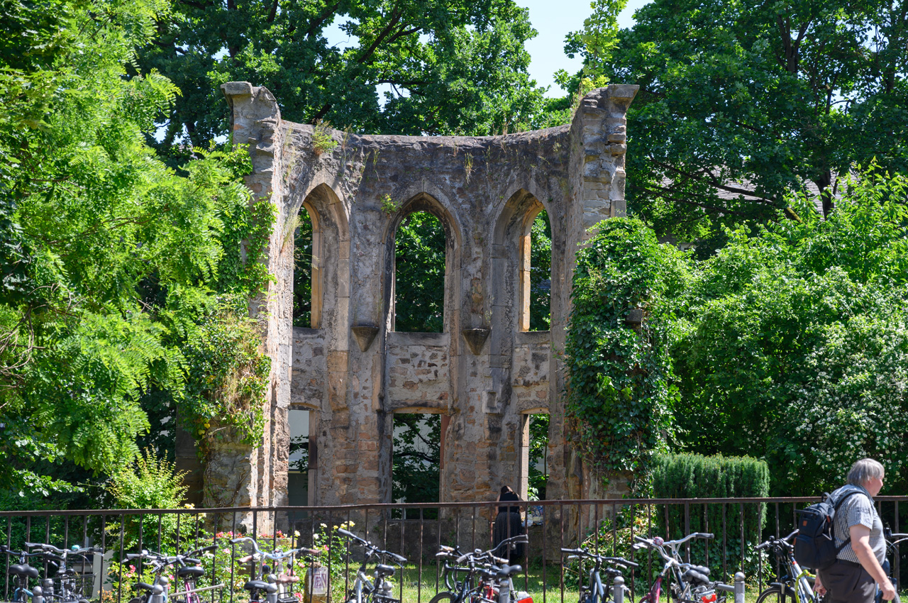 Wir sind wieder in die Altstadt gelaufen und mit dem Aufzug in die Oberstadt gefahren. Dieses mal haben wir uns etwas intensiver mit den Bauten um den Marktplatz herum beschäftigt. Vom Marktplatz aus ging es langsam die Barfüßerstraße wieder hinab. Am Plan sind wir dann wieder aufwärts zur Kugelkirche gegangen. In der Kugelkirche fand gerade eine Taufe statt. Nach anfänglichem Zögern haben wir gemerkt der Akt kann noch etwas länger dauern und sind dann doch in die Kirche hineingegangen. Die Kirche ist sehr eigenwillig aufgeteilt. Baulich hat sie nichts mit einer Kugel zu tun. Den Namen Kugelkirche hat sie durch die Mönche bekommen, deren Kopfbedeckung einer Kugel ähnelte. Von da aus sind wir noch ein wenig höher gestiegen zur Lutherischen Pfarrkirche St. Marien. Hier waren wir gestern schon, ich bin aber allein noch mal hineingegangen, um zu fotografieren. Susanne hat in der Zwischenzeit die Aussicht von der Terrasse der Kirche genossen. Vorbei an dem Hochzeitshaus ging es wieder etwas tiefer zu dem Marktplatz. Von da aus sind wir wieder in die Wettergasse gegangen. An ihrem Ende hatte Susanne gestern im Internet ein italienisches Eiscafe entdeckt. Das hat Susanne aber gar nicht gefallen, also haben wir beschlossen, heute wieder eisfrei zu bleiben. Über den Steinweg sind wir wieder auf Lahnhöhe abgestiegen. Am Ende gibt es die St. Michaeliskapelle. Wir haben aber keinen Weg ohne Treppen zu steigen gefunden. Da ich Susanne nicht schon wieder zumuten wollte Treppen zu steigen, haben wir bechlossen die Kapelle auszulassen. Über die Pilgrimstein sind wir wieder zurück bis zu dem Aufzug und sind mit ihm wieder in die Oberstadt gefahren. Dieses mal sind wir aber in die entgegengesetzte Richtung vom Marktplatz gelaufen. Schon nach wenigen Metern Fußweg haben wir entdeckt, dass ihre die Gaststätten mit den Terrassen mit Lahnblick sind. In ein Cafe, was auch Eis angeboten hat sind wir dann eingekehrt. Bei einem herrlichen Blick auf Marburg im Lahntal, haben wir einen Eiskaffee genossen. Das war lecker und wir konnten hier den Ausblick genießen. Beim weitern Abstieg, sind wir in die Universitätskirche gegangen. Auch das ist eine sehr ungewöhnliche Kirche. Die große Orgel ist hinter dem Altar in luftiger Höhe. Die Kirche ist generell sehr hoch. Das Kirchenschiff hat eine reich verzierte Holzdecke. Die gesamte Farbgestaltung der Kirche ist sehr dunkel, wodurch sie düster wirkt, obwohl sie eigentlich genügend Tageslicht bekommt. Nachdem wir noch das altehrwürdige Startgebäude der Philipps Universität bewundert haben, ging es über die Universitätsstraße ein kleines Stück zur Kaiserpassage. Dort hat sich Susanne bei Deichmann leichte Schlappen für den Aufenthalt vor dem Womo gekauft. Entlang der Lahn ging es wieder zurück zum Womo. Jetzt war Relaxen angesagt.