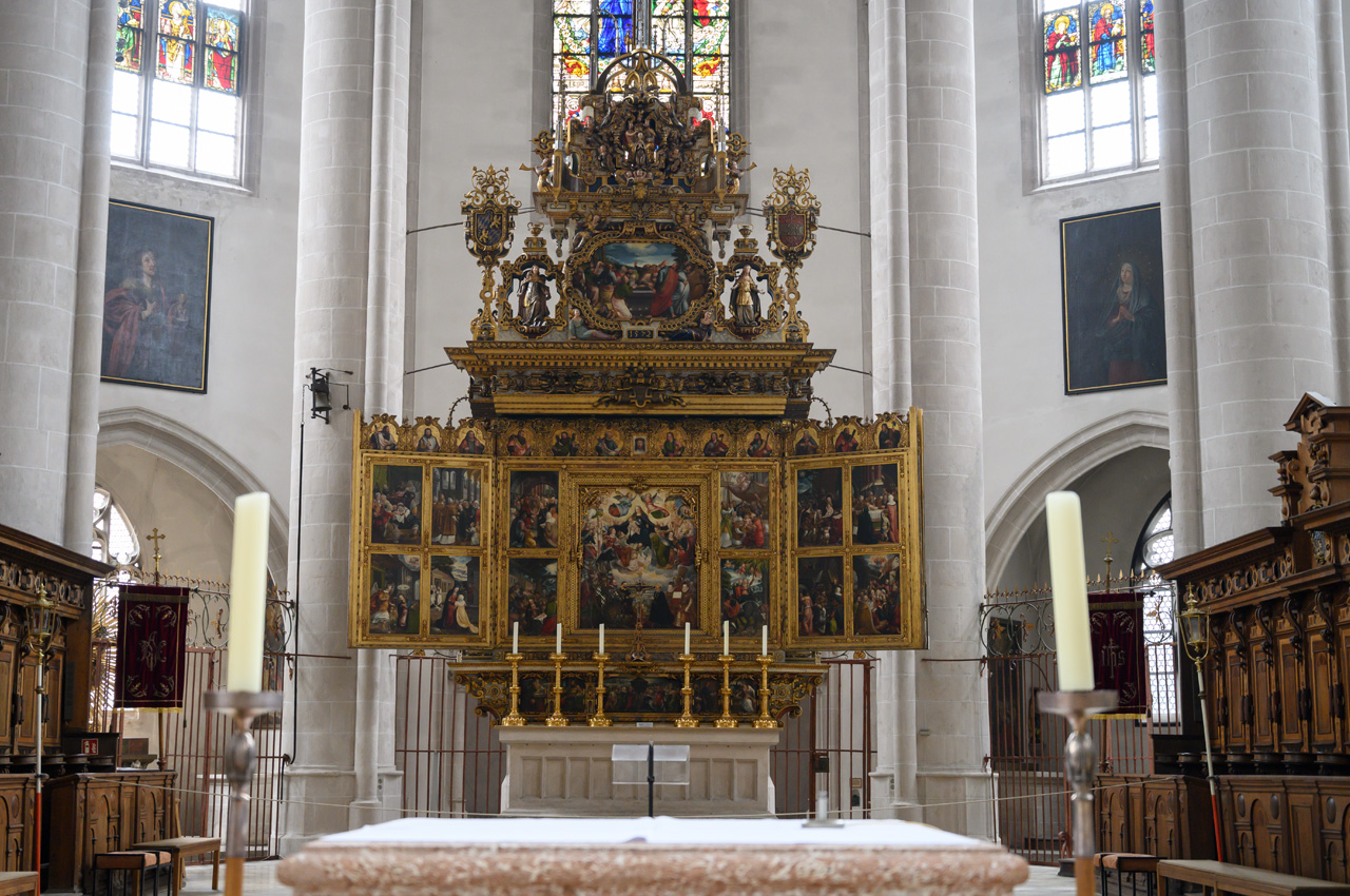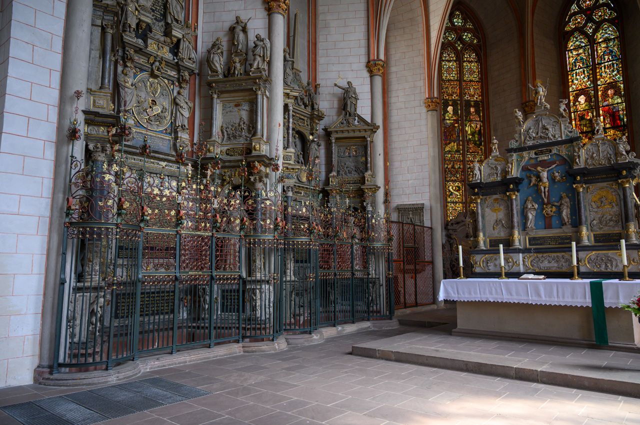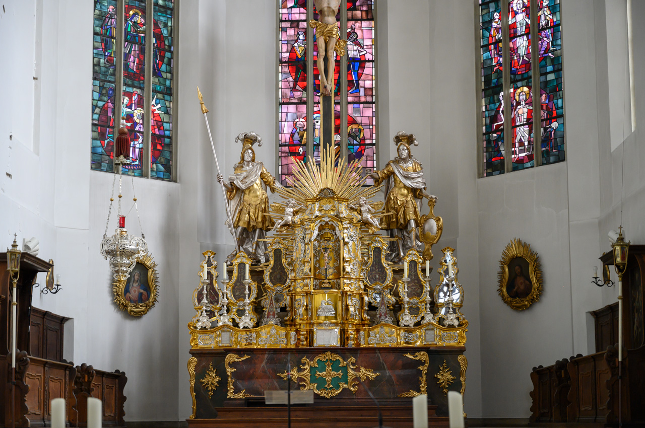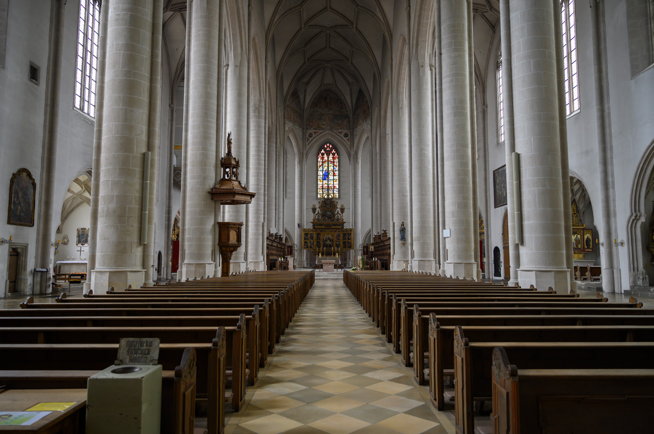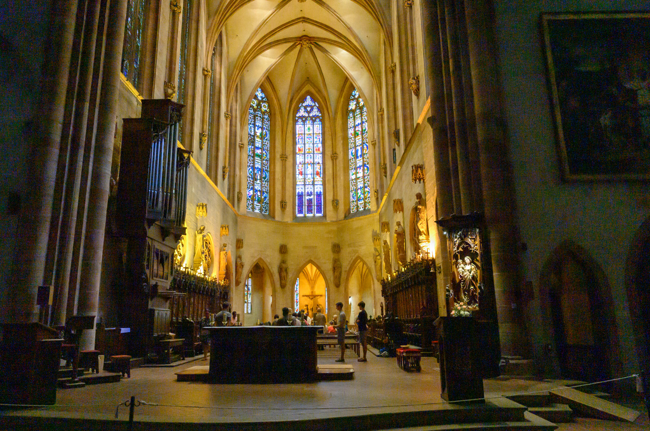 Nach einem gemütlichen Zwischenkaffee, es hat in der Zwischenzeit geregnet, sind wir zu einem ersten Ausflug in die Altstadt gelaufen. Wir konnten uns schon mal das Liebfrauenmünster ansehen. In der südwestlichen Turmhalle befindet sich sogar ein Raum mit den Schätzen des Münsters, die man sich ohne Eintritt zu zahlen ansehen kann. Das Liebfrauenmünster ist ein extrem hohes Gebäude mit einem großen Mittelschiff und ebenso großen Seitenschiffen. Man kommt sich ob der Größe dieses Gebäudes etwas verloren darin vor. Weiter durch die Fußgängerzone sind wir zum Rathaus gelaufen, hier befindet sich die Touristeninformation, die aber leider an Montagen geschlossen hat. Das finden wir für so eine Stadt wie Ingolstadt eigentlich sehr dürftig. Am Rathausplatz haben wir uns dann gleich noch die St. Moritz Kirche angesehen. Um die mussten wir allerdings erst einmal fast komplett herumlaufen, um den Eingang zu finden. Danach sind wir zurück zum Womo gelaufen.