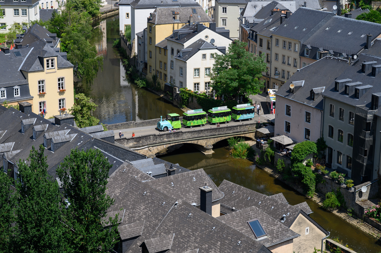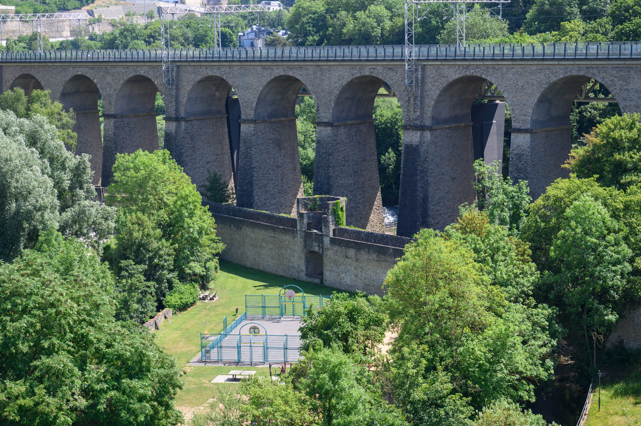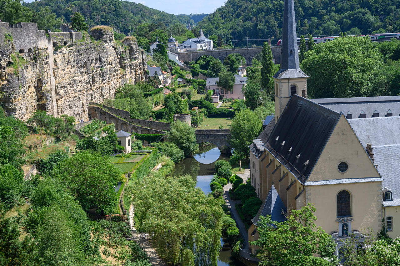 Die Antwort beim Bäcker auf meine Frage, können sie Deutsch, war, aber naklar. Also einfach mich zu artikulieren, was ich will. Kurioserweise sogar der Begriff Schrippen war geläufig. Ist ja fast wie zu Hause. Etwas anders sind allerdings die Preise. Das einfache Brötchen mit 0,65€ ist schon ganz schön heftig. Susanne hat sich ein Croissant gegönnt. So haben wir den Start in den Tag mit einem guten Frühstück und strahlend blauem Himmel bestens gestartet. Nach dem Frühstück sind wir zur Bushaltestelle gelaufen und mit dem Bus 511 zum Zentralbahnhof gefahren und dort in die Straßenbahn gestiegen, sie fahren alle durch die obere Stadt, wo wir ausgestiegen sind. Die Straßenbahnen sind hier sehr besonders. Sie haben nur außerhalb der engen Altstadt eine Oberleitung. Dort fahren sie offensichtlich mit Batterien, die außerhalb, wenn eine Oberleitung wieder vorhanden ist, aufgeladen werden. Wir sind am Boulevard Royal ausgesteiegen. Susanne hat auf ihrem Handy die Touristeninfo eingegeben. Sie zu finden, war gar nicht so einfach, weil sie wohl im Frühjar umgezogen ist. Hier haben wir uns mit Stadtplänen versorgt und Infos zu den Sehenswürdigkeiten bekommen. Wir haben einen Flyer bekommen, der einen Rundweg beschreibt über die Unesco Weltkulturerbe Stätten. Kurz hinter dem Place Gulliaume II, hier ist die neue Touristeninfo, kommt man durch eine kleine Querstraße zur Liebfrauen Kirche, eigentlich der letzte Punkt des Rundganges. Die Kirche selbst war aber bei unserem Eintreffen wegen eines Konzertes geschlossen. Etwa 100 Meter weiter, ist man auf dem PLace de la Constitution. Hier ist auch der offizielle Startpunkt der Tour. Hier steht das Monument Gëlle Fra (goldene Frau). Es wurde 1923, nach dem Ersten Weltkrieg, zum Gedenken an die Luxemburger errichtet, die freiwillig in den französischen und belgischen Armeen gedient hatten und im Ersten Weltkrieg gefallen waren. Sie glänzte heute in der Sonne besonders schön. Ansonsten hat man von dem Plateau des Platzes aus eine tolle Sicht in das Petrustal. Man sieht sehr gut von hier die Großherzog Adolf Brücke, die größte Steinbrücke der Welt, eines der monumentalsten Brückenbauwerke aus Stein der Vergangenheit. Sie ist komplett aus Feldsteinen und überspannt in Bögen das gesamte Petrustal. Der Weg führte uns dann weiter an der Mauerkante vom Petrustal mit sehr schönen Einblicken in das Tal und dabei vorbei am Heilig Geist Plateau und vielen historischen Gebäuden. Jetzt wurde auch der Blick frei auf die im Tal fließende Alzette und die Häuser von Grund. Was für ein herrlicher Anblick, die Natur und die Architektur der Häuser von Grund. Man blickt auch auf den großen Gebäudekomplex der Abtei Neumünster. An der Corniche (ehemalige Festungswälle) kehren wir wieder zurück in die Straßen der Oberstadt. Gleich am Anfang, am Fischmarkt, besichtigen wir die Sankt Michaelkirche. Etwas düster und mit einem eher bescheidenem Altar hat die Kirche uns nicht wirklich begeistert. Jetzt haben wir vorbei am Großherzöglichen Palast wieder die Liebfrauen Kathedrale angesteuert. Jetzt war der Zugang auch möglich. Eine sehr interessante Kirche mit einer historischen Ausstattung. Besonders bemerkenswert ist die Holzdecke der Vierung und die rings um das Querschiff verteilten Orgeln. Von der Kirche ging es zurück in eine der Fußgängerzonen auf der Suche nach einem Eiscafe. Das haben wir gefunden und wir haben geschlemmt. Die Pause tat gut. Nun ging es zurück zur Straßenbahn und mit dann zurück zum Zentralbahnhof. Hier begann nun das Suchen nach unserem Bus 511, der uns wieder zum Campingplatz zurückbringen soll. Nach dem wir etwas umherirrten haben wir zwei Info-Leute gefunden. Von denen haben wir erfahren, dass dieser Bus auf der anderen Seite des Bahnhofes fährt. Hört sich erstmal einfach an, es war aber gar nicht so einfach, auf die andere Seite des Bahnhofes zu kommen. Nach zwei Anläufen haben wir eine Fußgängerbrücke gefunden, die über den ganzen Bahnhof führt. Glück für Susanne, an beiden Enden gab es einen Aufzug. Tatsächlich haben wir dann auch auf der anderen Seite unseren 511´er Bus gefunden. Er hat hier auch Endstation. Der Bus war gut gekühlt, aber als wir am Campingplatz ausgestiegen sind, war das ein echter Temperaturschock. Das Außenthermometer zeigte nun auch schon glatte 30°C an.Am Womo angekommen, waren wir auch rechtschaffend breit. Unsere Fitnesuhren hatten schon wieder mehr als 12.000 Schritte auf der Anzeige. Es war nur noch faulenzen auf der Tagesordnung.